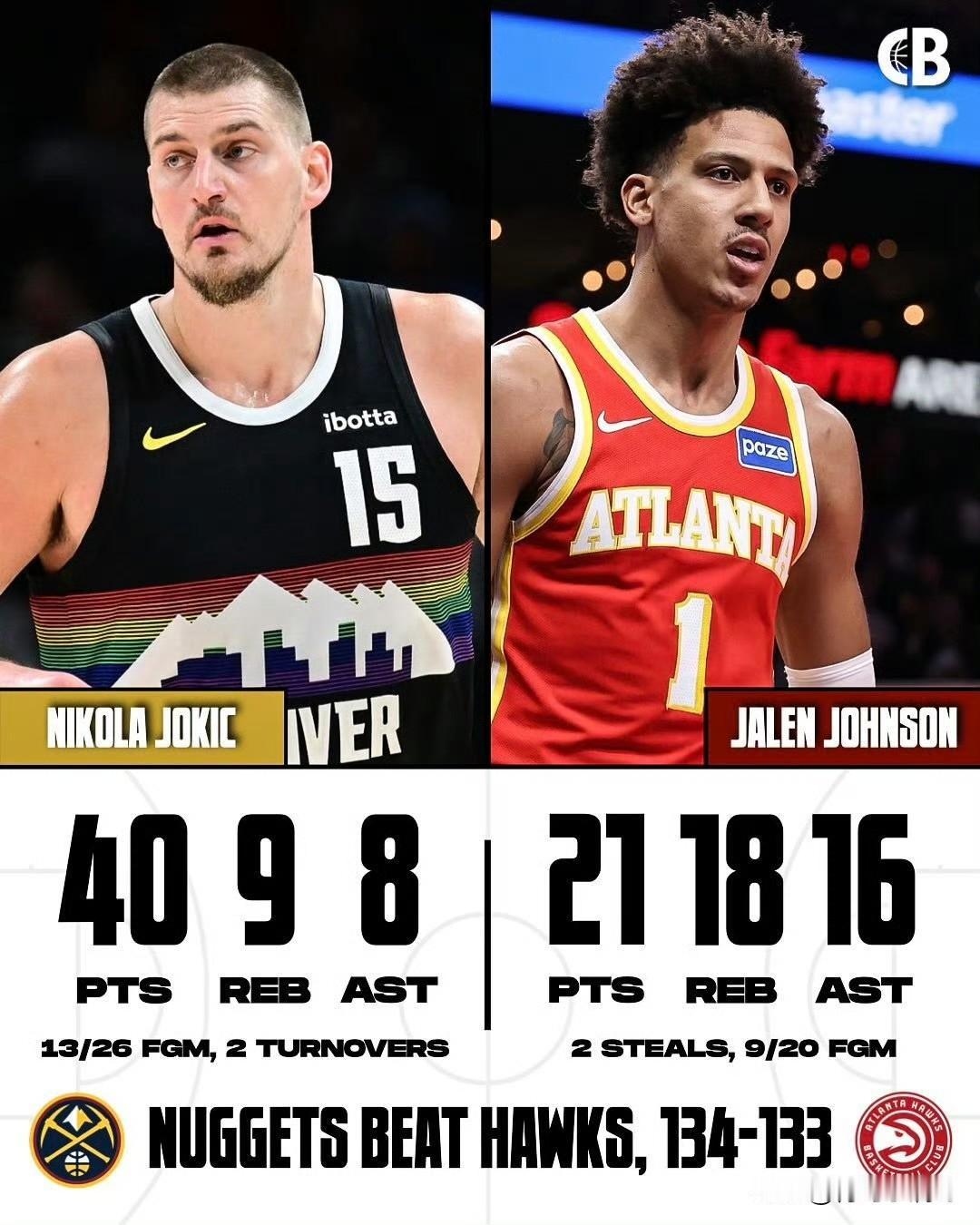 新鹰王登基!!!约基奇40+9+8,杰伦-约翰逊21+18+16,掘金逆转老鹰! 掘金客场挑战老鹰队,本以为本场比赛掘金会被打花,上半场结束就放弃了,谁知道他们有个全能又不放弃的约老师,在落后高达23分的情况下完成逆转,最终掘金134-133战胜老鹰。 本场比赛掘金和老鹰对决备受关注,因为这两支球队都有个全能王,掘金方面当然是约基奇,老鹰方面则是杰伦-约翰逊,叫杰伦的都很牛,叫约翰逊的也很牛,那叫杰伦-约翰逊的是不是更牛了。 约老师全场26中13,除了三分投的不好,其他都很好,拿下40+9+8的准三双数据。 杰伦-约翰逊就很恐怖了,拿下21+18+16得超级大三双,这家伙太全面了,他已经成为老鹰的新鹰王。 约基奇下半场睡醒了是他们赢球的关键,如果没有下半场的30分,掘金想从客场带走这场胜利就难了。 约基奇 掘金 丹佛掘金 NBA掘金 约基奇王朝 掘金篮球 杰伦约翰逊