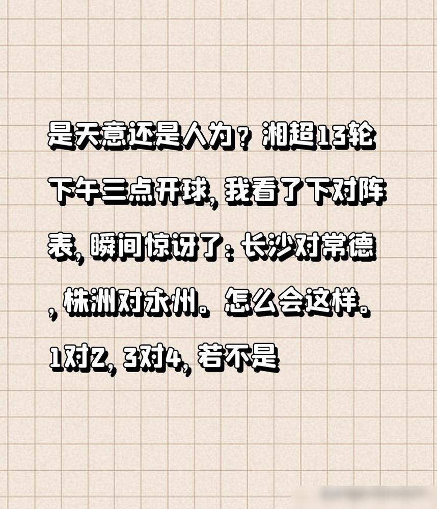 是天意弄人,还是人为操弄? 湘超第13轮赛事于下午三点准时开球。 乍一看,真像有一双无形的手在幕后拨弄棋局,非得在收官战把所有的恩怨情仇一次清算。 但咱们不妨把目光放远点,瞧瞧整个联赛的脉络,这种“巧合”或许正是竞技体育最残酷也最公平的剧本,强者恒强,狭路相逢,所有的悬念都留到最后时刻才肯撕开一角。 你瞧瞧长沙和常德这场巅峰对决。 长沙队一路高歌猛进,金身不破,俨然一副王者气象。 而常德呢,手握联赛最锋利的矛,赵文荻那双进了10个球的脚,早就饥渴难耐,瞄准了常规赛金靴。 这场面,哪里是普通的联赛收官战,分明是决赛的提前预演! 是长沙在主场球迷的山呼海啸中继续书写不败神话,还是常德用狂暴的进攻砸开胜利之门? 这场比赛的结果,远不止3分那么简单,它直接给即将到来的淘汰赛定下基调。 赢家,将带着无可匹敌的自信踏入更残酷的赛场。 输家,恐怕要带着心理阴影去迎接接下来的恶战。 视线转到株洲与永州的搏杀场。 株洲队上一轮意外失分,从第二滑落到第三,此番回到素有“魔鬼主场”之称的自家地盘,目标只有一个,全取三分,把失去的排名夺回来! 他们不仅要赢,还得盼着长沙能帮他们拦住常德,这心思,够煎熬的。 另一边的永州,这匹赛季中段冲出的黑马,最近连折两阵,是气数已尽还是短暂蛰伏? 他们的定位球战术可是让不少强队吃了苦头。 这场较量,是株洲凭借主场气势一鼓作气,还是永州用一次精准的“远程轰炸”让主队球迷鸦雀无声? 这场比赛的胜负,如同一只蝴蝶的翅膀,轻轻一扇,就将彻底改变季后赛的对阵格局,牵一发而动全身。 说到底,这种看似“人为操弄”的完美对阵,恰恰是漫长赛季优胜劣汰自然筛选的结果。 最强的队伍凭借实力爬到了最高的位置,他们在收官战相遇,是偶然也是必然。 这并非组委会的刻意安排,而是实力相当者最终会迎来的命运碰撞。 这背后,是积分规则的冰冷计算,是球队整个赛季拼搏的累积效应。 所以,别再纠结于是天意还是人为。 把目光投向绿茵场吧! 今天下午三点,七场大战同时打响,每一块草皮上都燃烧着不同的渴望,有的是争冠的野望,有的是保级的挣扎,还有的是为城市荣誉而战的不屈灵魂。 这才是足球最原始、最动人的魅力所在,在限定的时间和空间里,用汗水、技术和意志,书写最不可预测的结局。 我们不妨搬好小板凳,准备好呐喊与心跳,共同见证这常规赛最终章的华丽与残酷。
