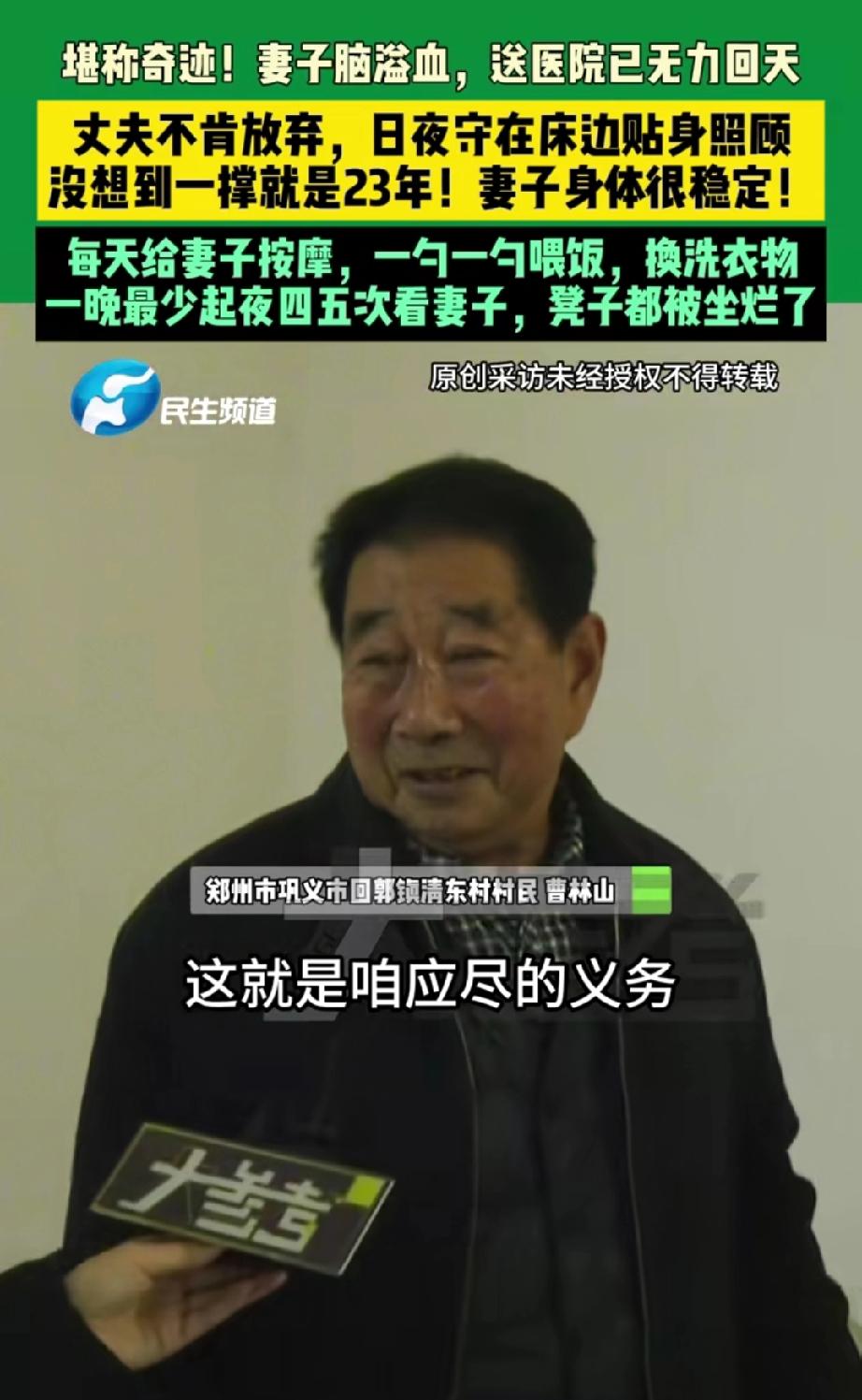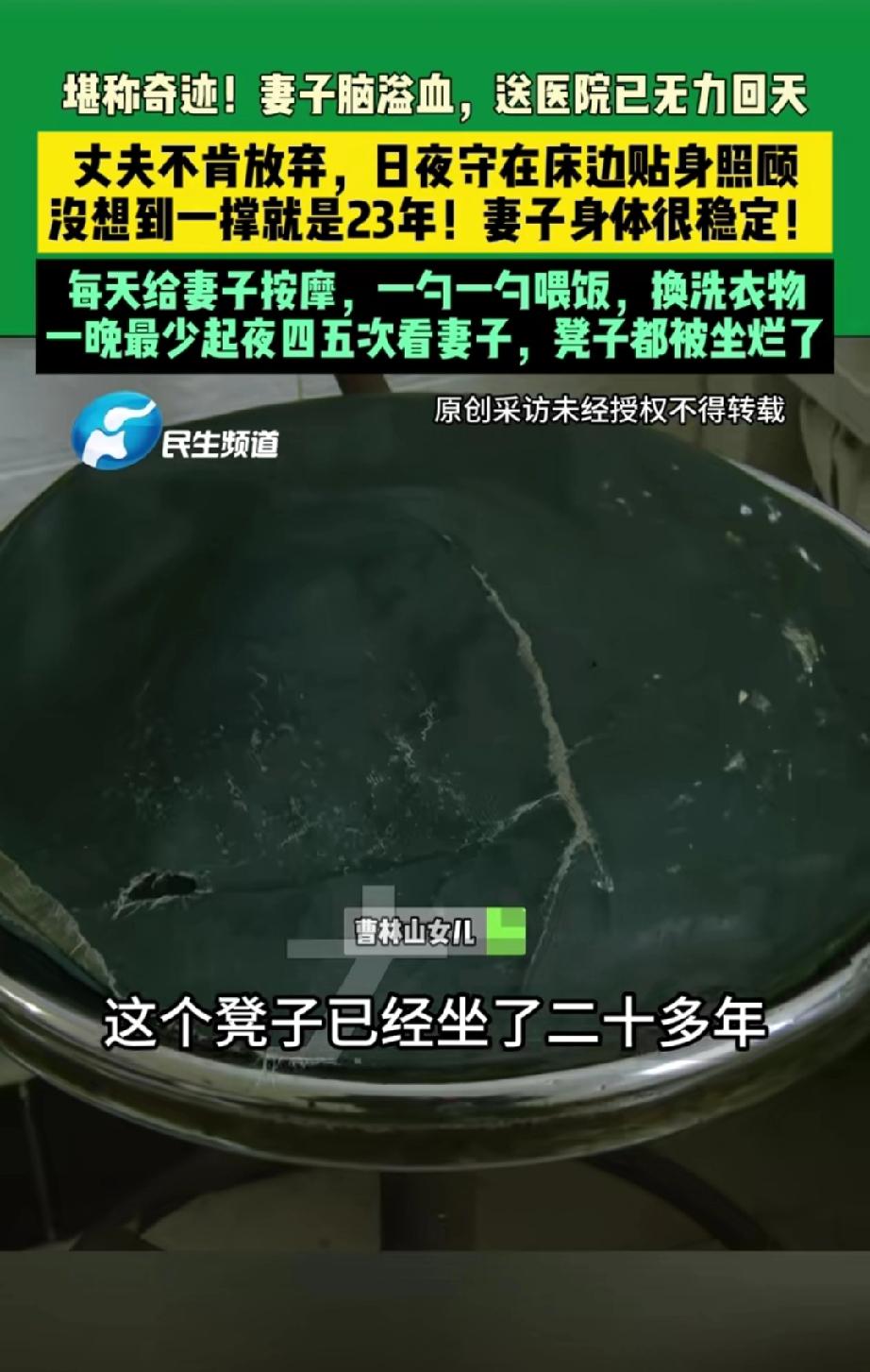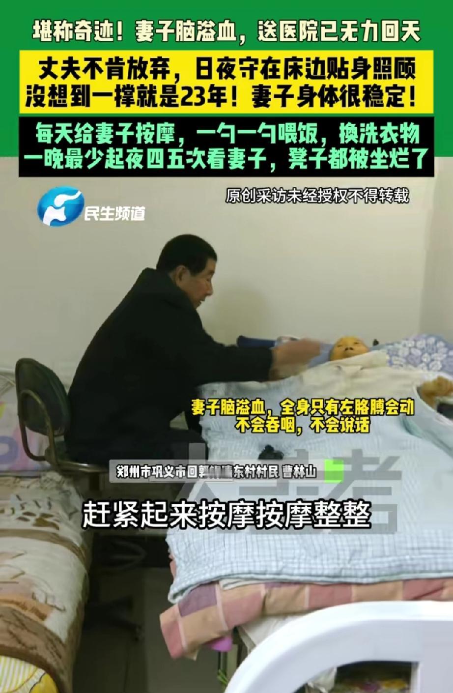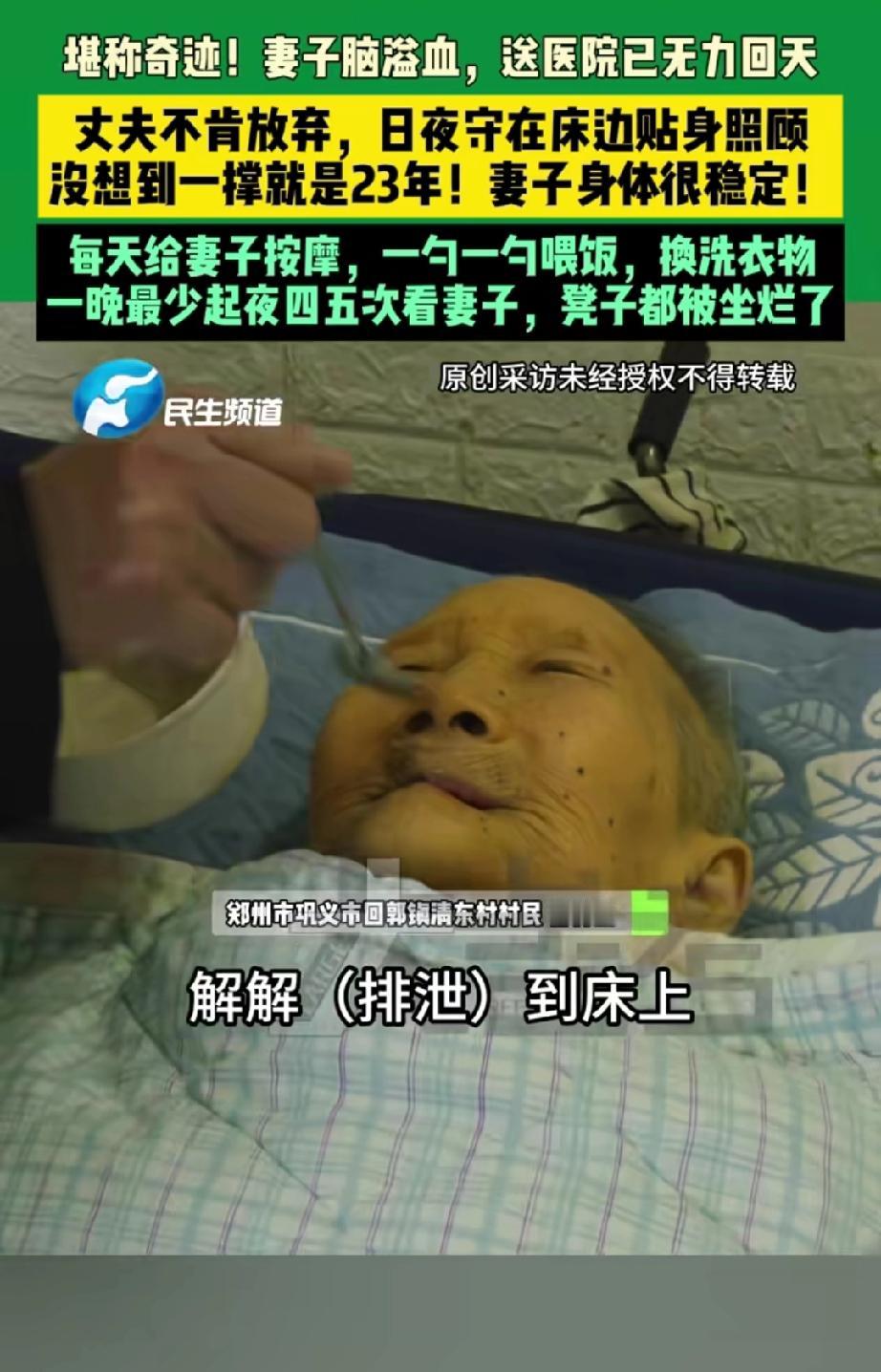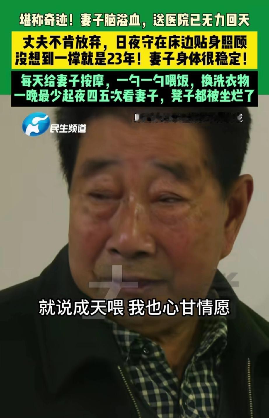 妻子突发脑溢血,被送往医院后已无力回天,许多人都劝丈夫放弃。但丈夫却说:“只要她还有一口气,我就绝不放弃她。只要我还在,就会伺候她一天。”随后,他把妻子带回家,悉心照料23年。 如今,丈夫已70多岁,妻子仅左手和眼珠能够活动。丈夫每天都会煮好米糊糊,加入菜泥和肉泥,以保证妻子营养均衡。 从最初用胃管喂食,到现在一勺一勺地喂,更艰难的是解决妻子上厕所的问题,这都只能在床上完成。 丈夫每天都会为妻子拍打身体,促进血液循环。每晚他都要起床四五次,看看妻子是否安好,有无需求。 女儿感慨道:“妈妈床前的凳子,都被爸爸坐裂了。” 有人问丈夫:“每天这样累不累?麻不麻烦?” 丈夫答道:“这有什么麻烦的,这是我应尽的义务,就算成天喂,我也心甘情愿。” 老一辈的婚姻,没有豪言壮语,只有实实在在的担当。 已进入暮年的丈夫用实际行动,践行了现在婚礼上的誓言:“无论顺境还是逆境,无论是富贵还是贫穷,无论健康还是疾病,我们将携手共度,视彼此为终身伴侣,今日誓言坚守一生。” “执子之手,与子偕老”,短短四字,却承载了半生的责任。 23年朝夕相伴,他以岁月为承诺,照料生活不能自理的妻子从未间断。这并非童话里的故事,而是柴米油盐中沉淀的深情,是婚姻最美的模样,更是“丈夫”二字最厚重的担当,值得赞叹! 也给儿女与子孙做了表率,什么叫婚姻里的不离不弃,我想这样的家庭,家风一定很正,根基稳,后代自然品行端方、向善而行。 来源:大参考