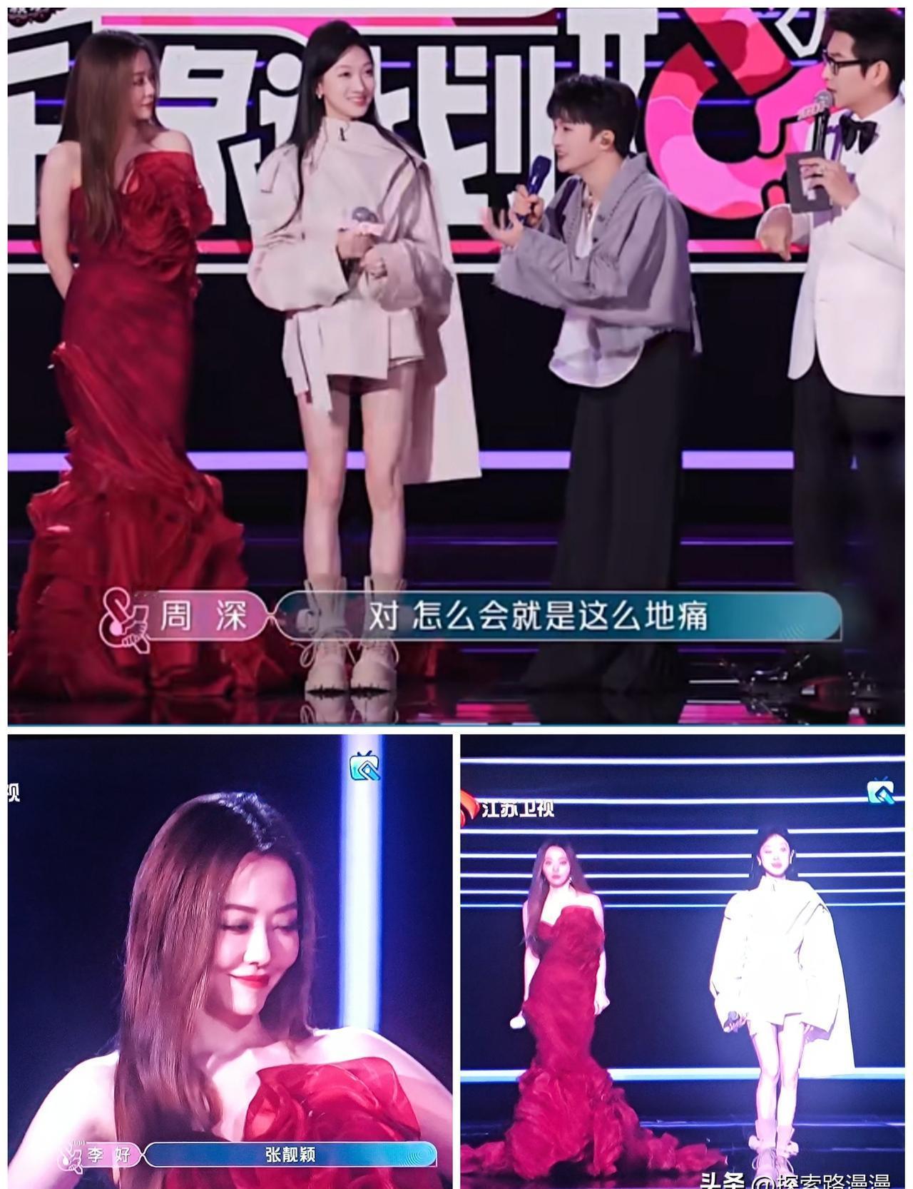 张靓颖的拖地长裙,居然输给了一双腿? 这期《音乐缘计划》的舞台,简直成了“腿精”和“女王”的修罗场! 张靓颖一袭墨绿丝绒拖地裙,裙摆铺开两米宽,连耳坠都坠着水晶流苏。 她抬手轻撩发丝的瞬间,镜头扫过台下观众屏住的呼吸——可这画面还没捂热乎,姜曼穿着短裙踩着细高跟“噔噔”上台了。 姜曼的腿型太绝了! 笔直得像被尺子量过,肌肉线条随着走动微微起伏,连高跟鞋踩地的节奏都像在打拍子。 周深站在中间,眼神在两人之间来回飘:张靓颖的裙摆扫过他脚背时,他赶紧后退半步;姜曼的高跟鞋“咔嗒”一声,他又条件反射似的往旁边挪了挪。 网友辣评:“张靓颖是来走红毯的,姜曼是来走T台的,周深是来当人形隔离带的? ”更扎心的是,节目组官微发的合照里,张靓颖的裙摆占了半张图,评论区却全在问:“姜曼的鞋什么牌子? ”“这腿是真实存在的吗? ” 说到底,娱乐圈的“视觉战”从来不是比谁更隆重。 有时候,一条腿的杀伤力,真能抵过十米裙摆的排面。 你觉得造型是该追求“女王气场”还是“视觉暴击”?