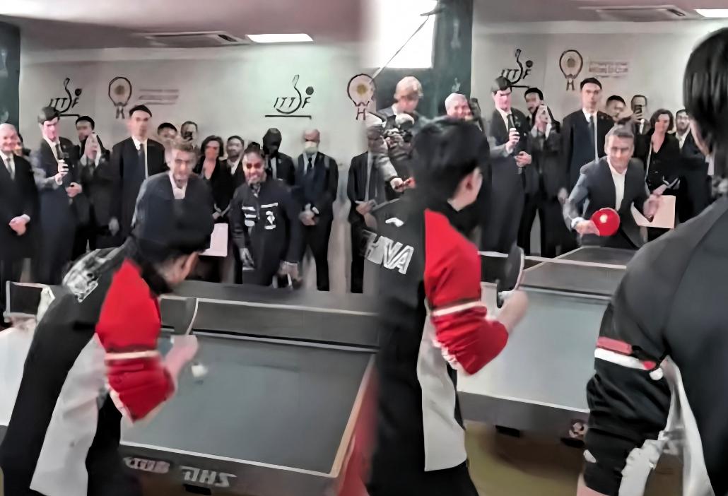 马克龙这球越打越上头! 一直喊“我还要莎莎发球”。 孙颖莎可是一点没放水。 马克龙连着几个球没接住。 也不气馁。 马克龙一边笑着。 一边指着球桌另一边。 示意再来。 旁边的人都笑了。 他不是为了胜负。 就是享受那个过程。 看得出他是真想打好。 也是真放松。