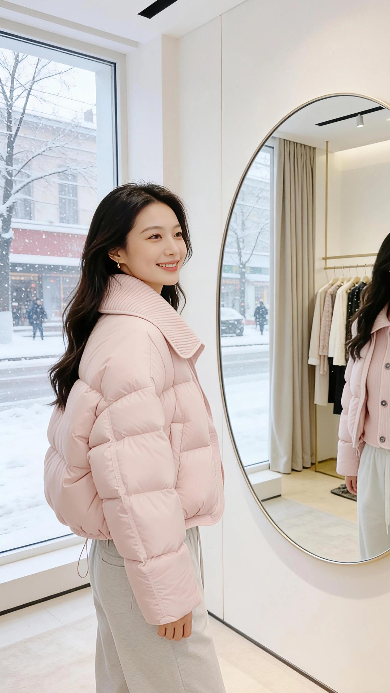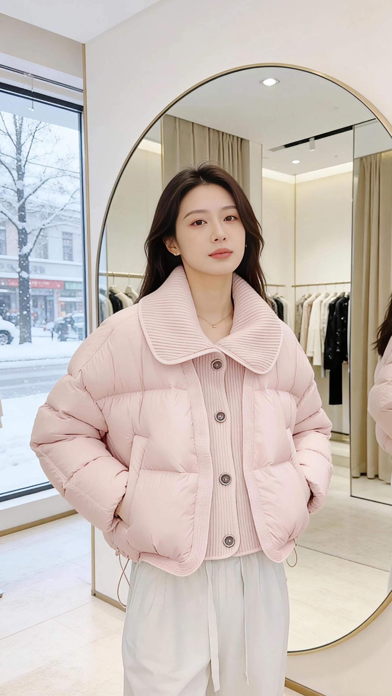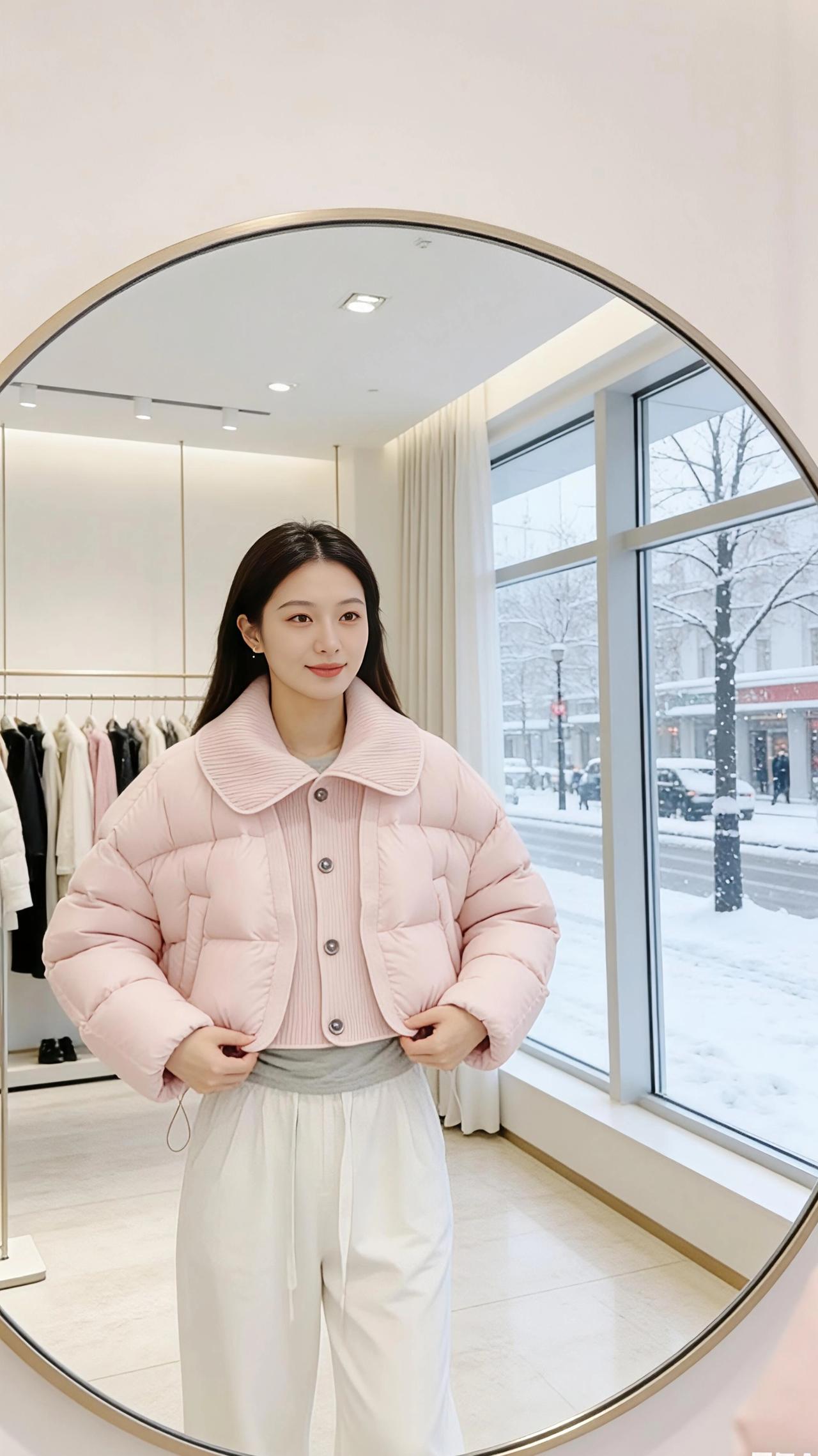 雪是冬天写在窗玻璃上的诗,落满街树的枝桠时,试衣间的暖光正裹着一身粉。 是揉碎了樱花瓣铺成的蓬松——大翻领的针织纹里藏着软,充绒的弧度像把云按成了衣褶,扣上纽扣时,连指尖都沾了点温温的甜。镜子是椭圆的画框,框住她抬手理领口的影子,框住窗外雪地里缩着肩的行人,也框住两种温度:玻璃外是凛冬的凉,衣料里是裹紧的春。 她踮脚碰了碰镜里的自己,粉色的衣角晃了晃,像把雪天里的风都揉得软和了些。原来冬天的温柔不用等梅开,一件刚好合心意的衣,就够让冷意都轻得像落雪。 高级感穿搭小个子穿搭 棉服