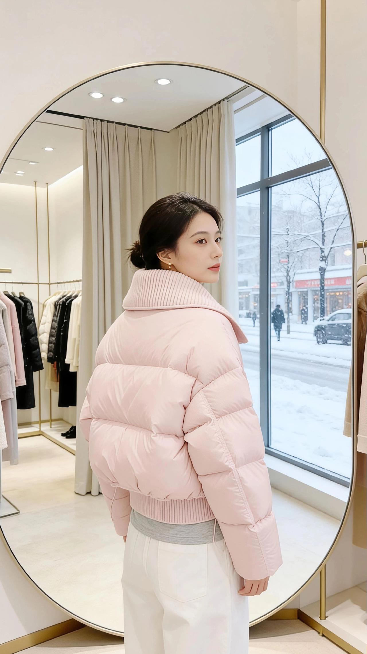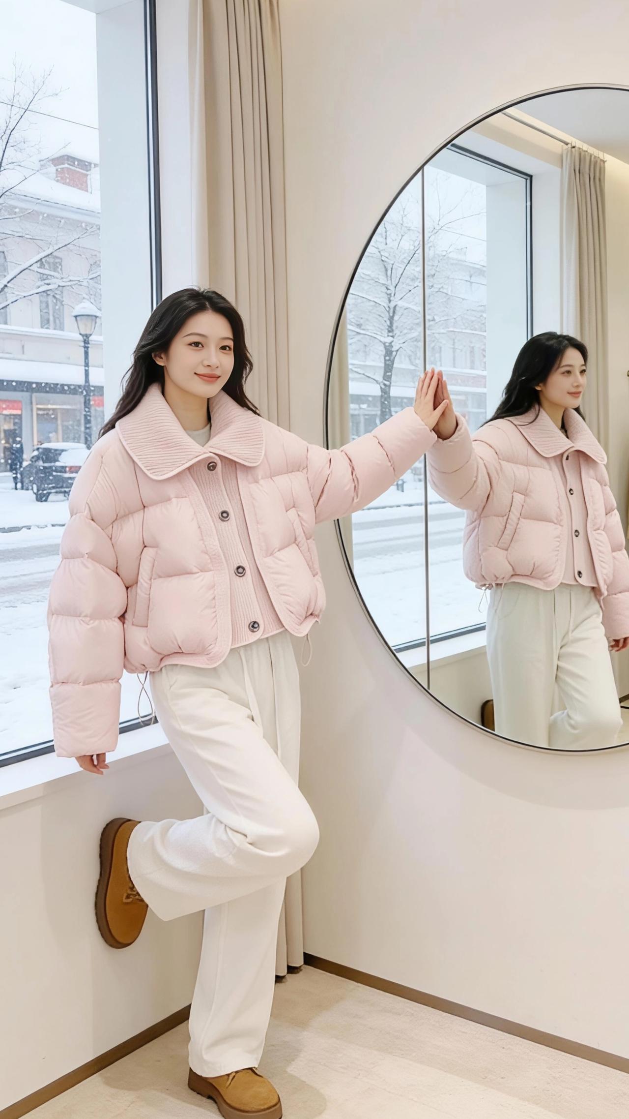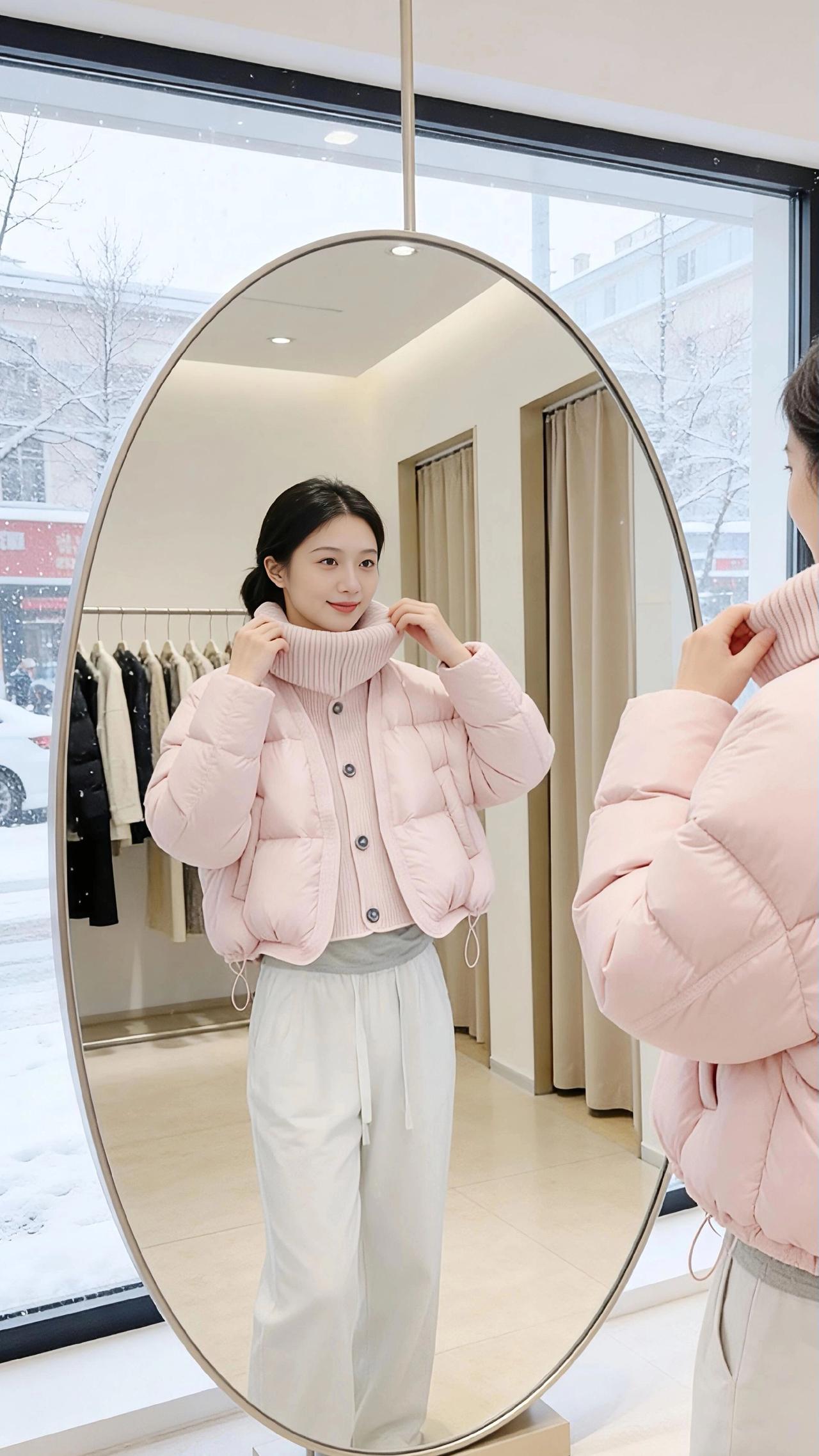 雪是冬天写在窗玻璃上的诗,落满街树的枝桠时,试衣间的暖光正裹着一身粉。 是揉碎了樱花瓣铺成的蓬松——大翻领的针织纹里藏着软,充绒的弧度像把云按成了衣褶,扣上纽扣时,连指尖都沾了点温温的甜。镜子是椭圆的画框,框住她抬手理领口的影子,框住窗外雪地里缩着肩的行人,也框住两种温度:玻璃外是凛冬的凉,衣料里是裹紧的春。 她踮脚碰了碰镜里的自己,粉色的衣角晃了晃,像把雪天里的风都揉得软和了些。原来冬天的温柔不用等梅开,一件刚好合心意的衣,就够让冷意都轻得像落雪。 高级感穿搭小个子穿搭 棉服