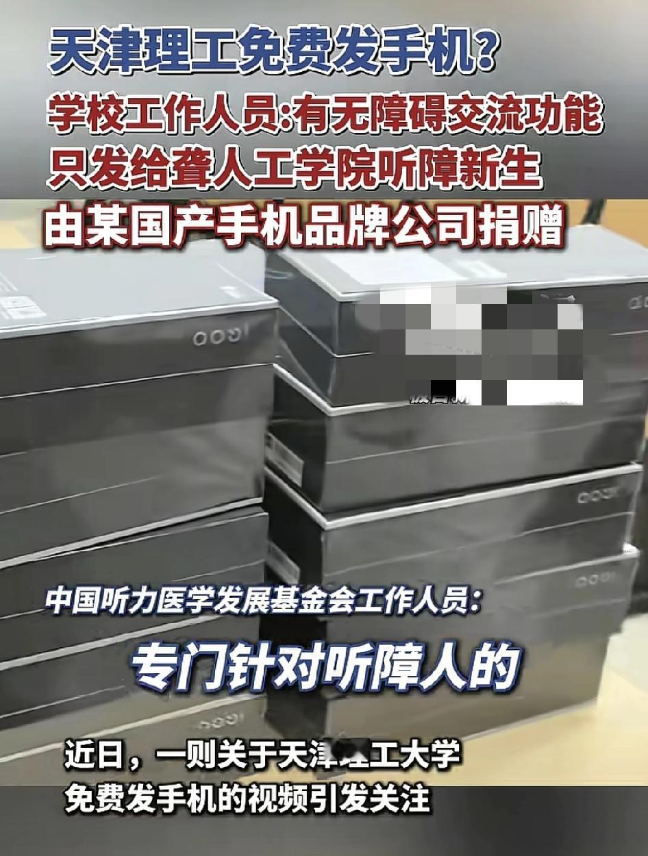 近日,天津理工学院免费给学生发手机的视频引发大家的关注,学校工作人员回应称,那是由国内某品牌手机企业免费赞助给聋人工学院的新生。该款手机是有一些辅助的听觉功能来让学生做到无障碍的沟通交流。该企业已经连续多年为学校赞助该功能的手机。