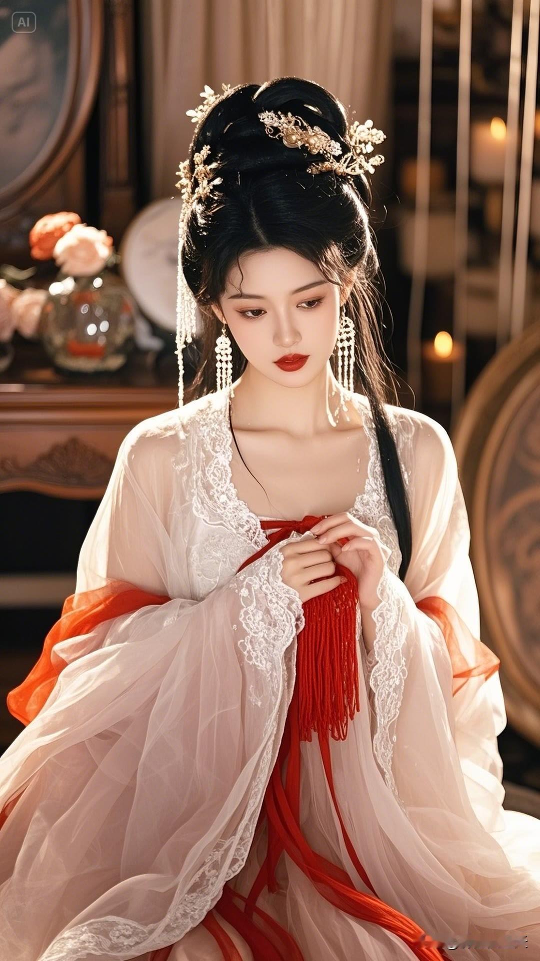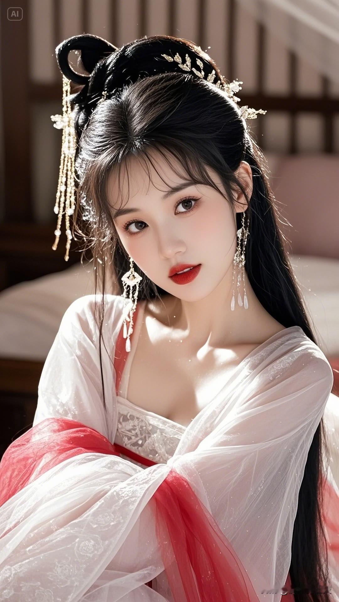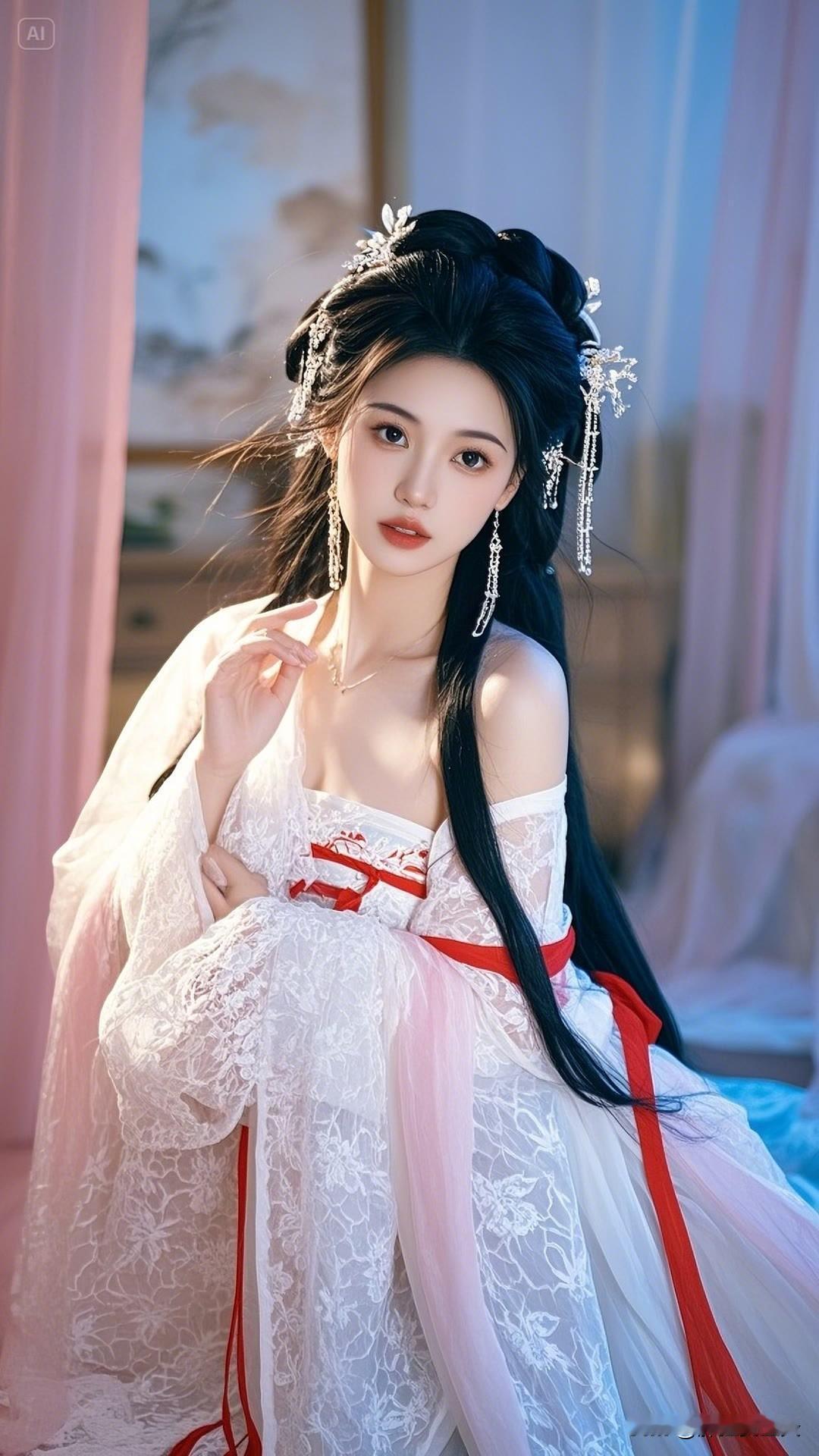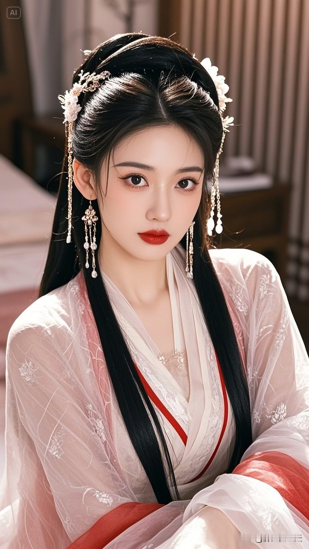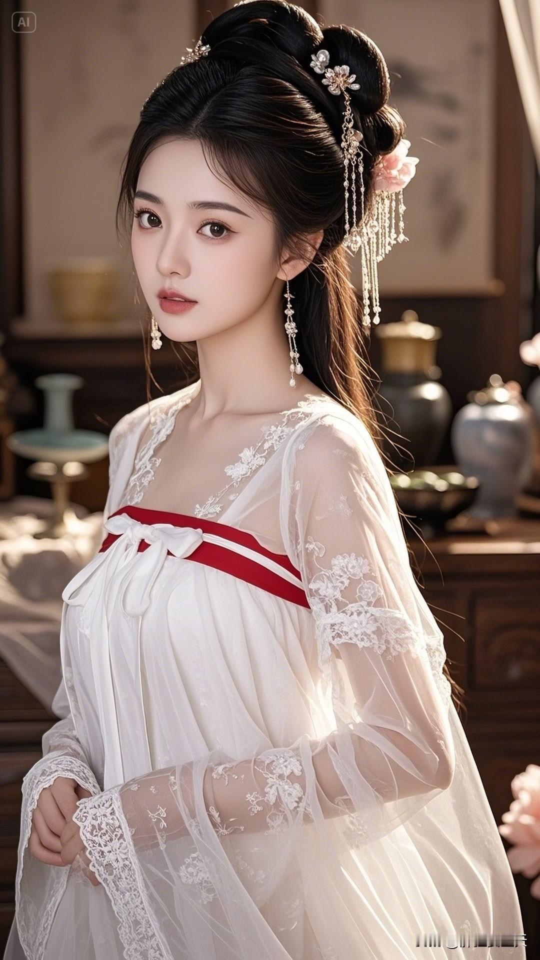 青丝高绾,珠饰轻垂,一袭白纱配红绦,妥妥是古言里才有的大家闺秀!