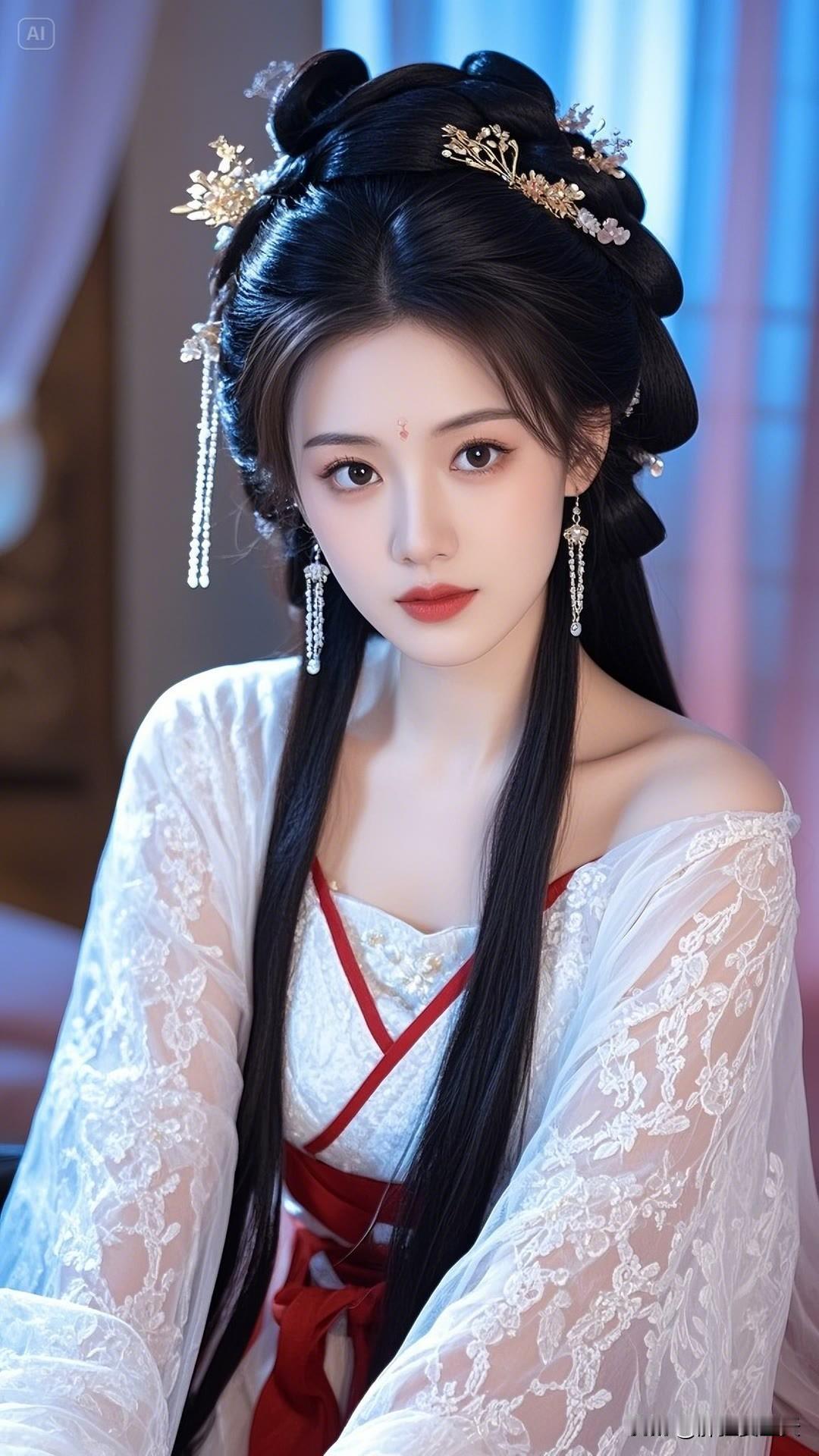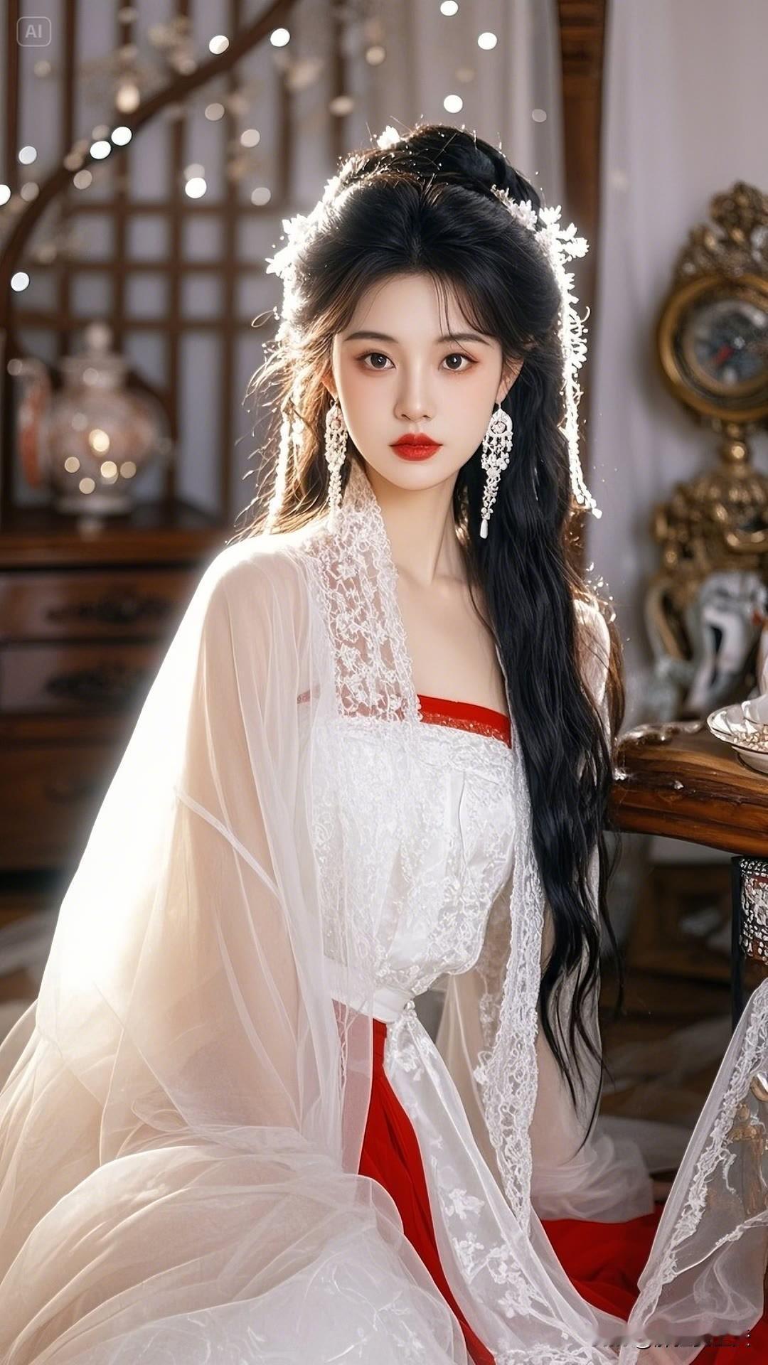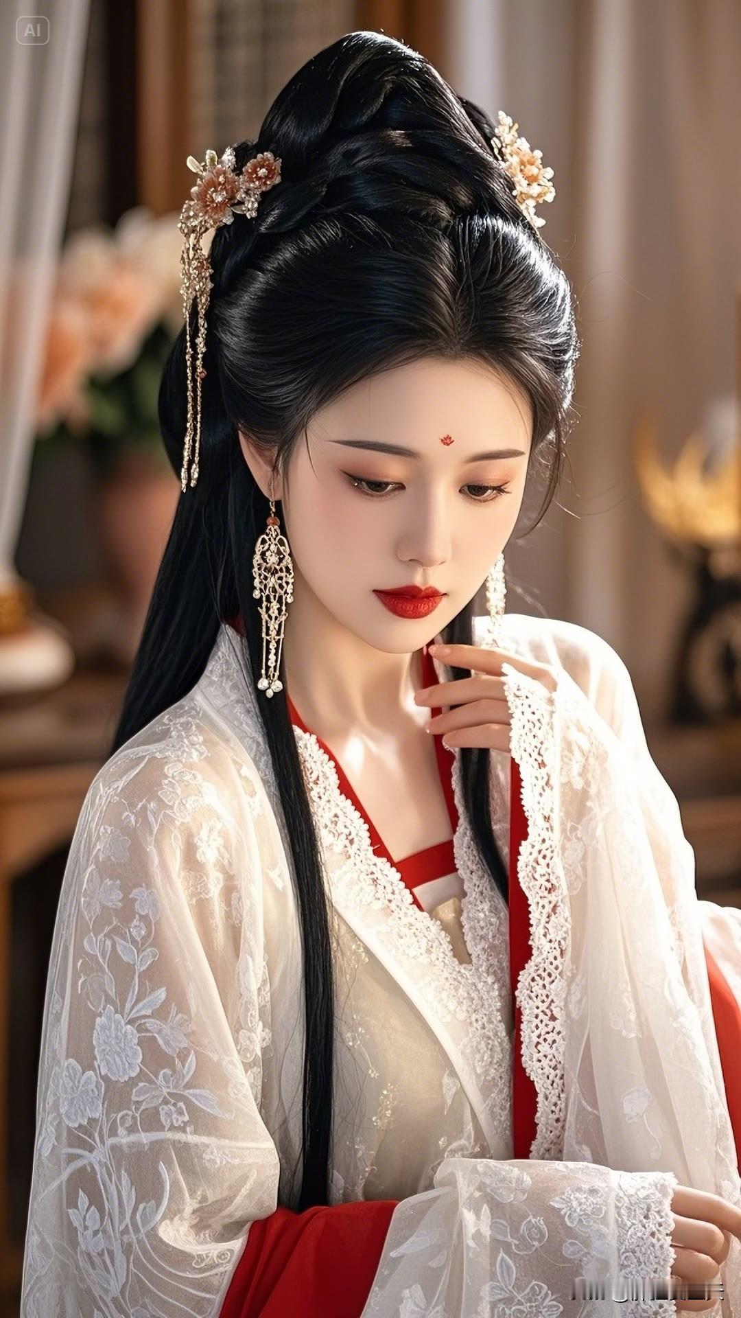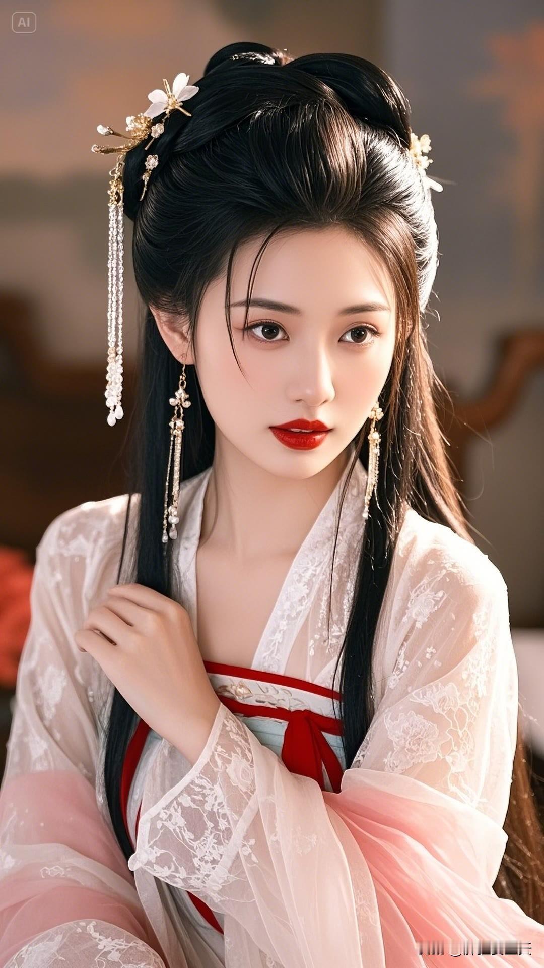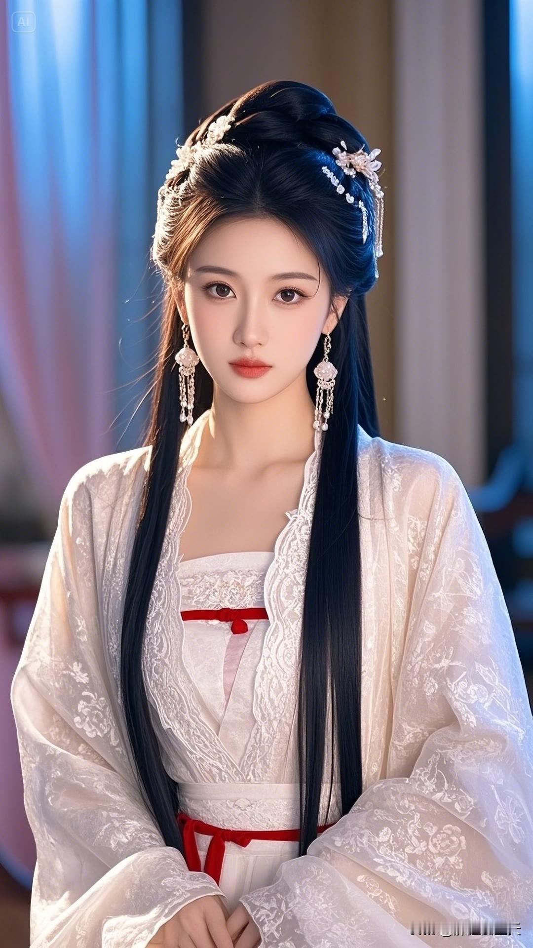 青丝高绾,珠饰轻垂,一袭白纱配红绦,妥妥是古言里才有的大家闺秀!