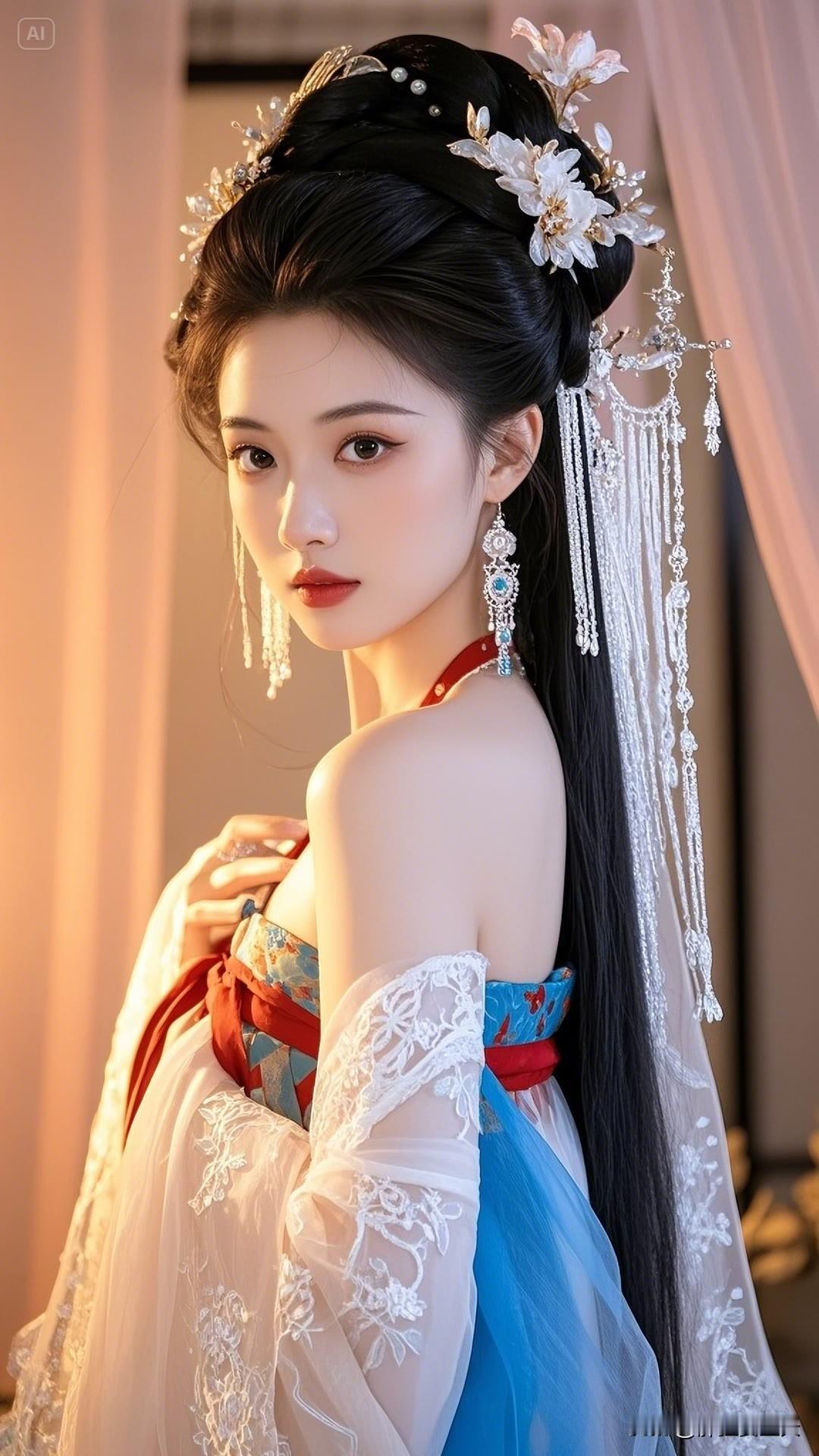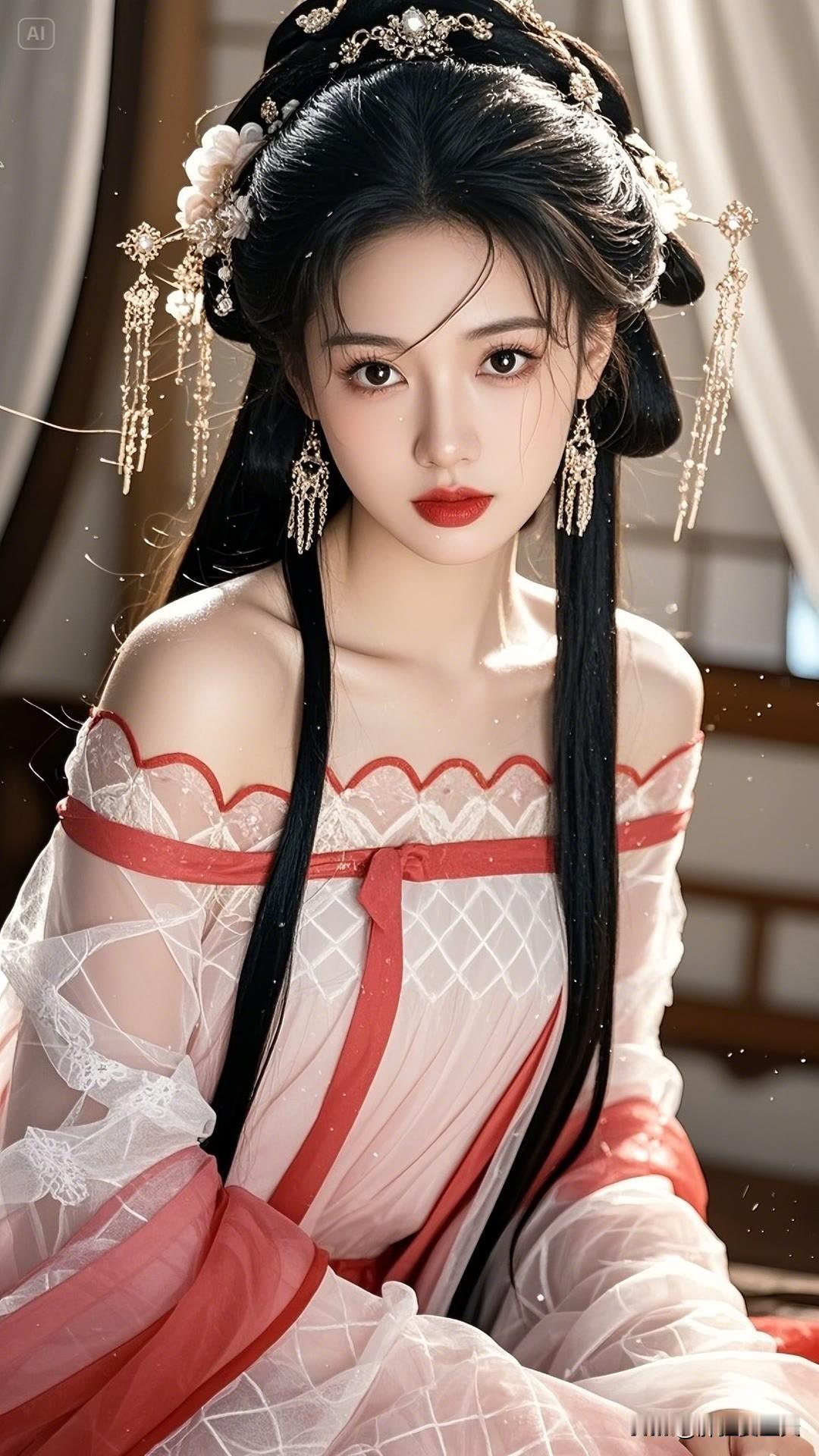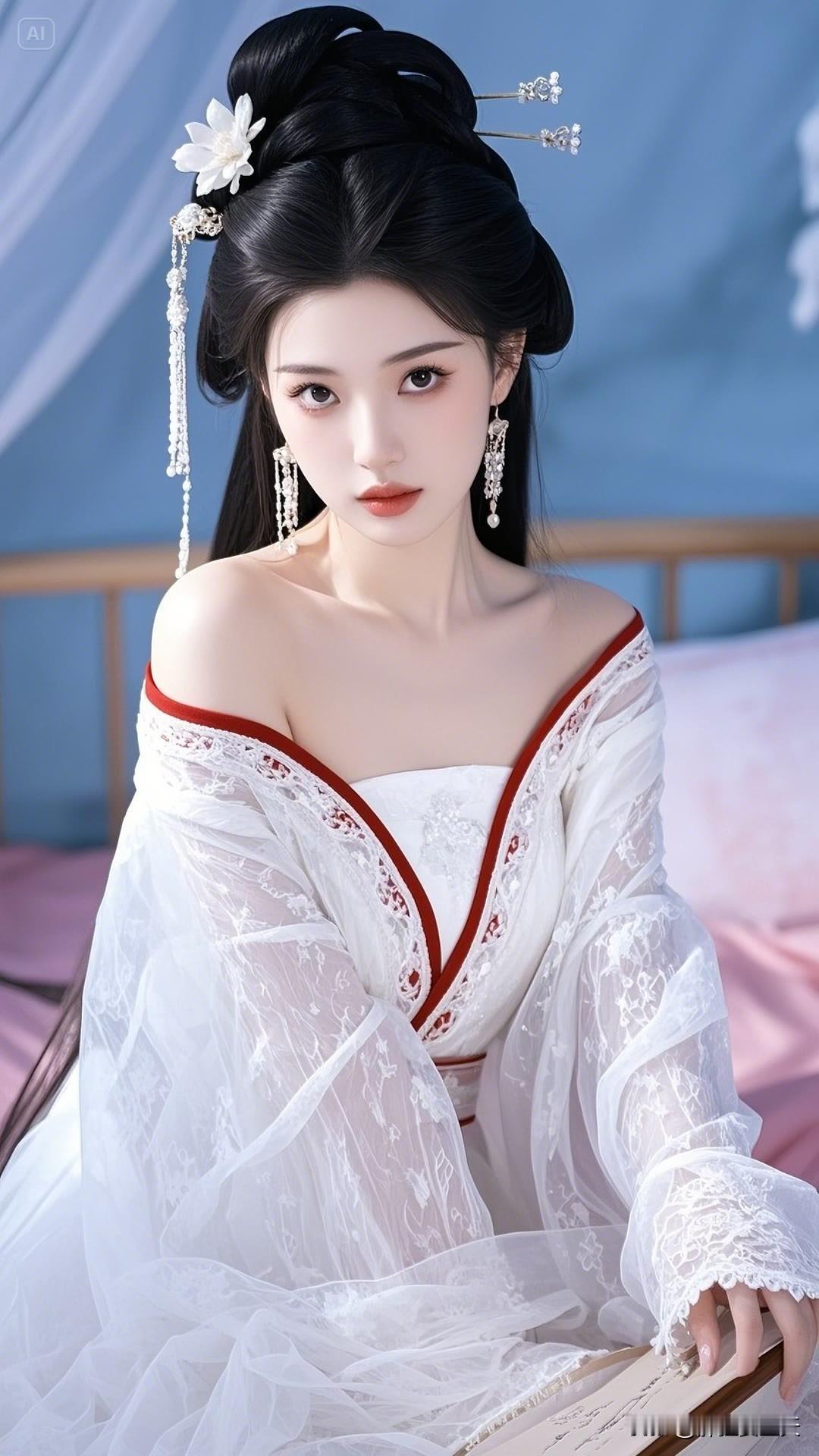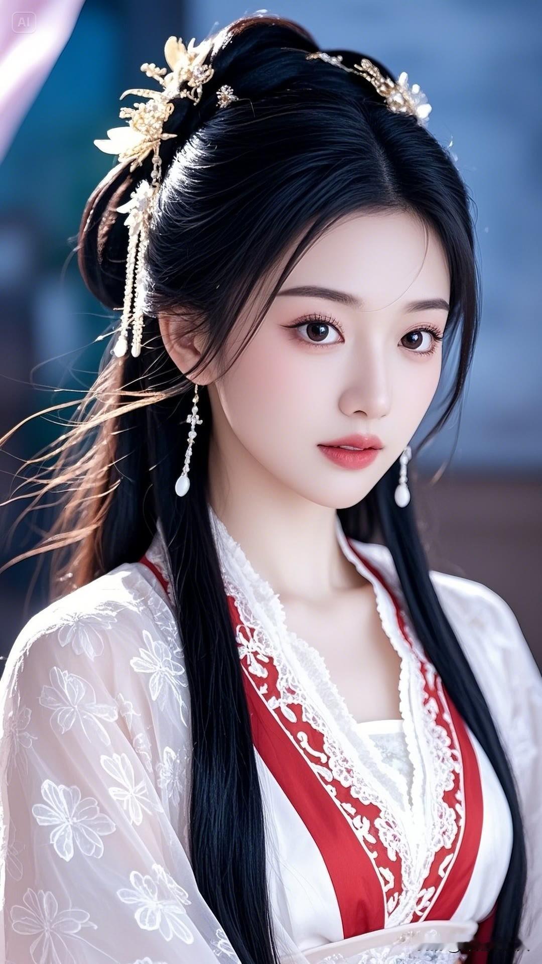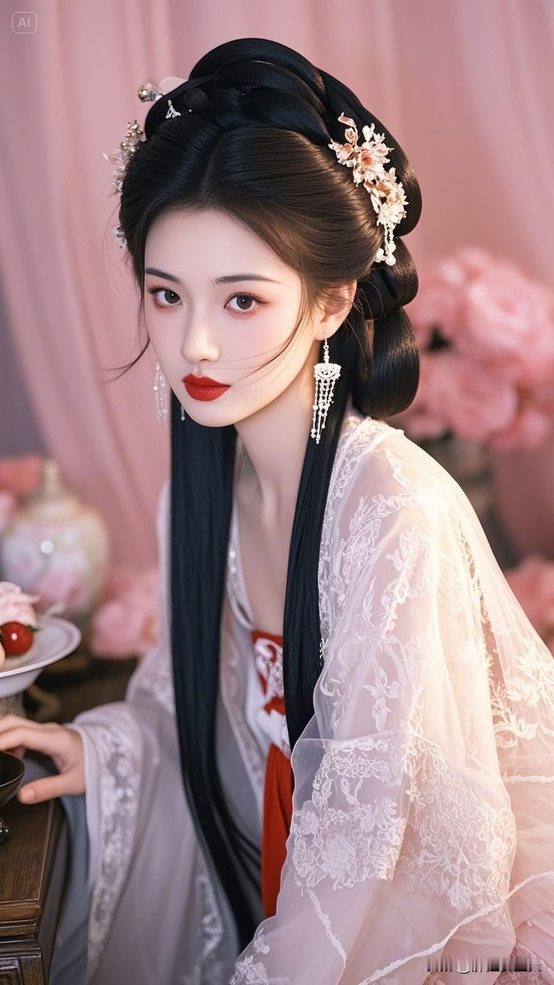 青丝高绾,珠饰轻垂,一袭白纱配红绦,妥妥是古言里才有的大家闺秀!