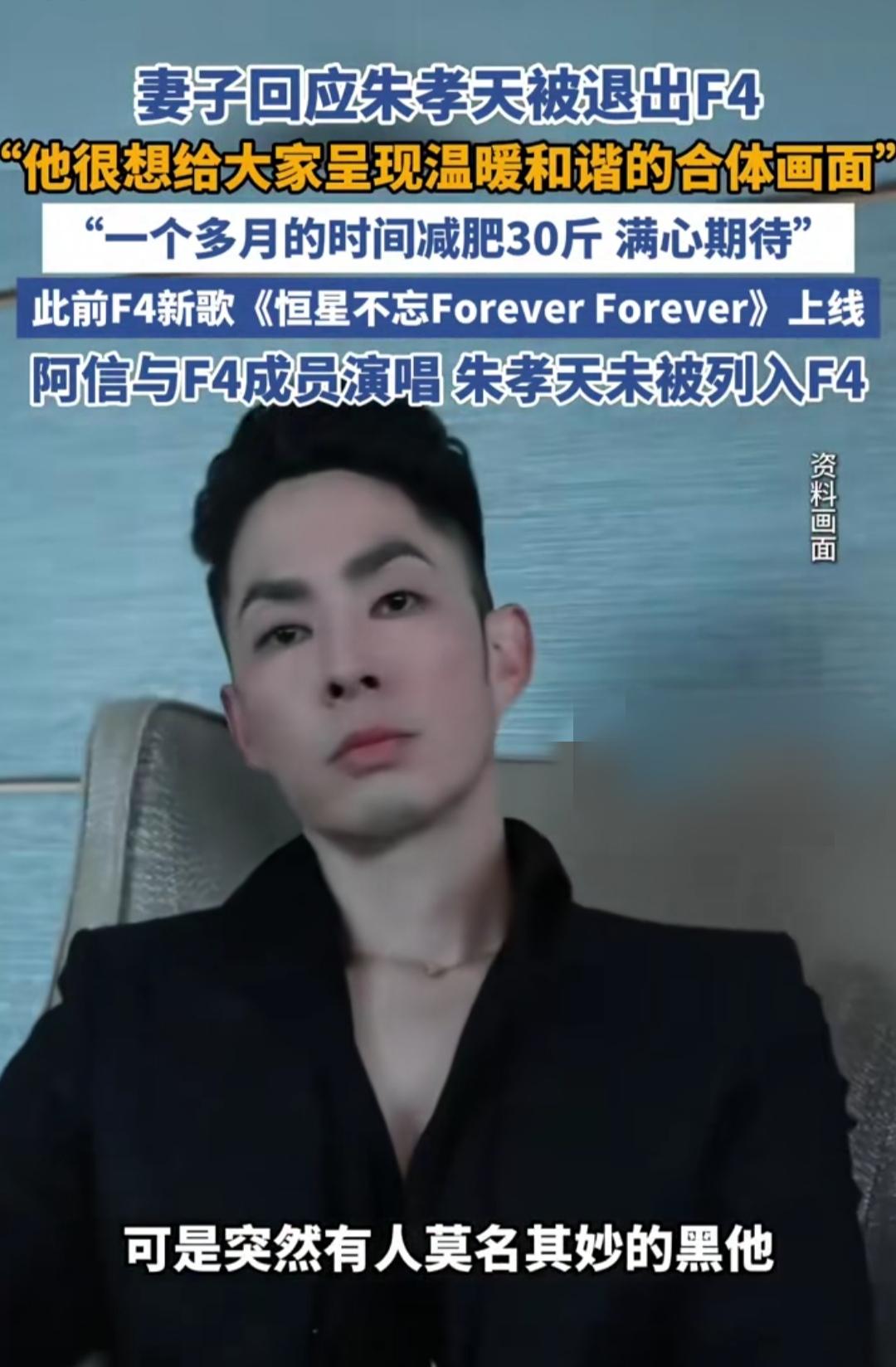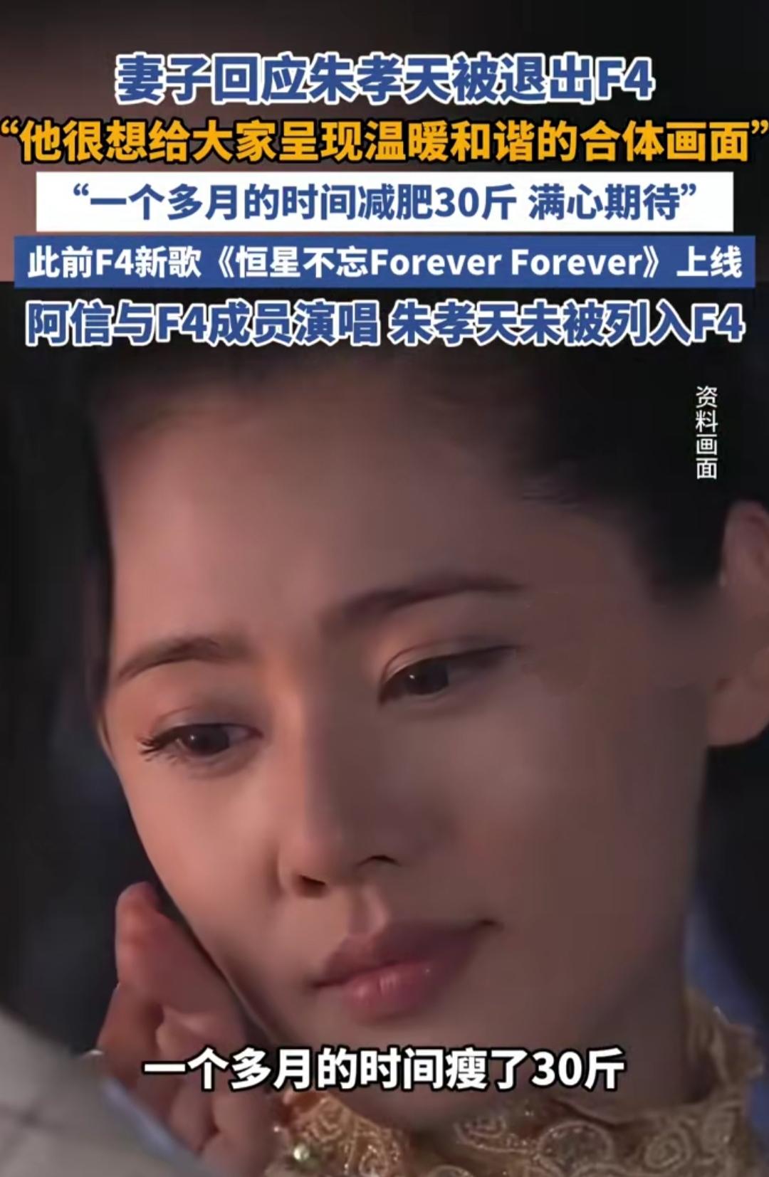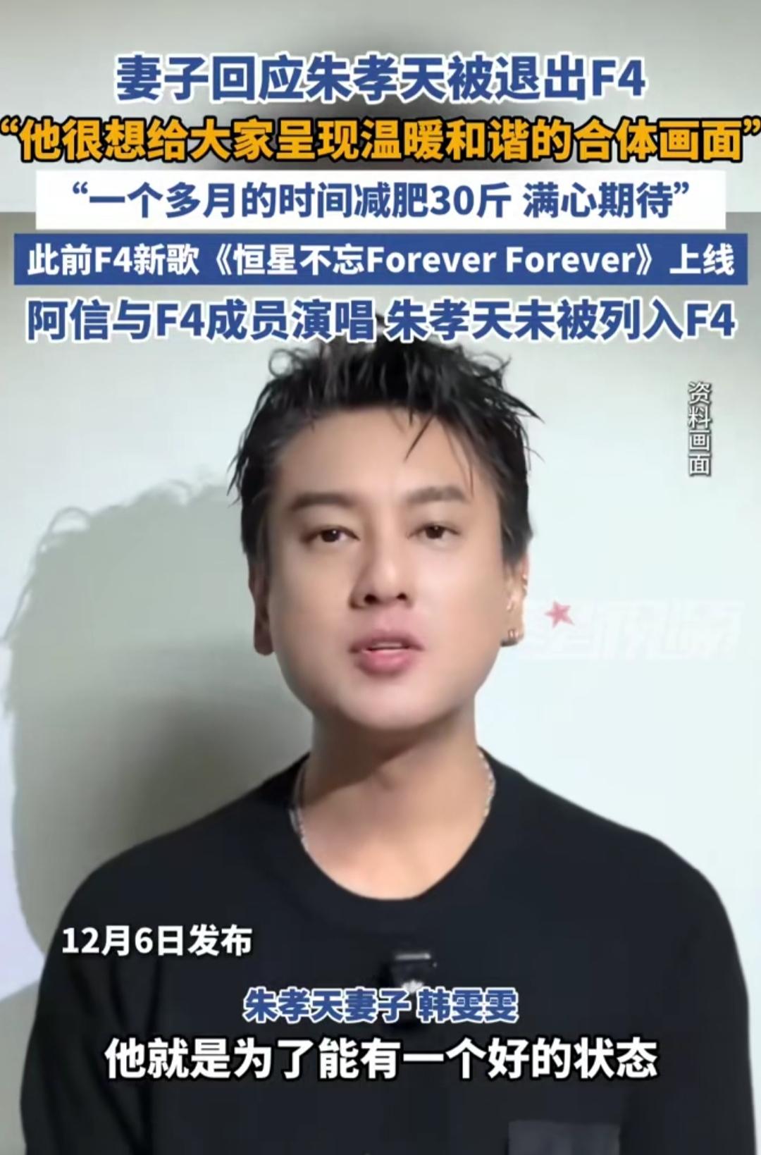 朱孝天被传退出F4,妻子直接出面回应,说他一个多月瘦了30斤,还遭莫名抹黑,这话看得人心里五味杂陈。 谁的青春里没有过F4?当年《流星花园》火遍大街小巷,他们是无数人心中的偶像天花板。可时光流转,组合成员各自发展,如今却闹出这样的风波。 朱孝天这些年一直受健康问题困扰,本就不易,还要面对无端抹黑和团队变动的压力。成年人的世界哪有容易二字,哪怕是曾经光芒万丈的明星,也会被现实磋磨。 大家惋惜的不只是F4的可能解散,更是自己一去不返的青春。希望这场风波能早日平息,也希望每个为生活打拼的人,都能少点诋毁,多点善待。