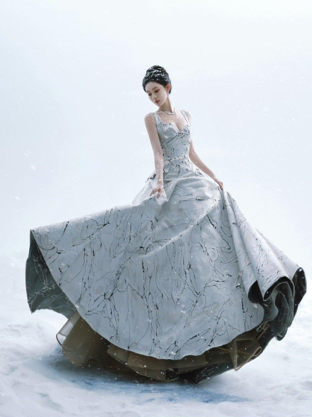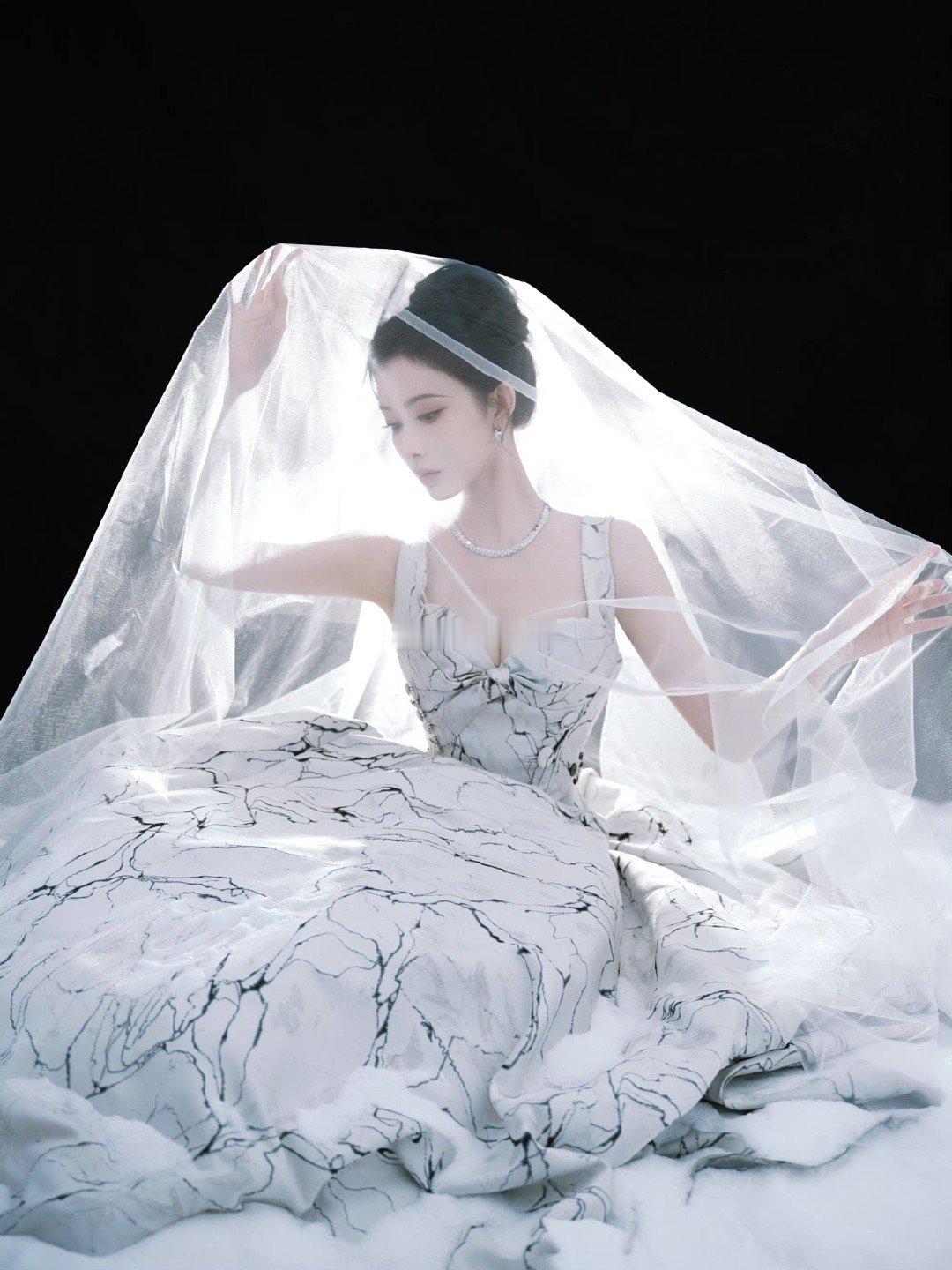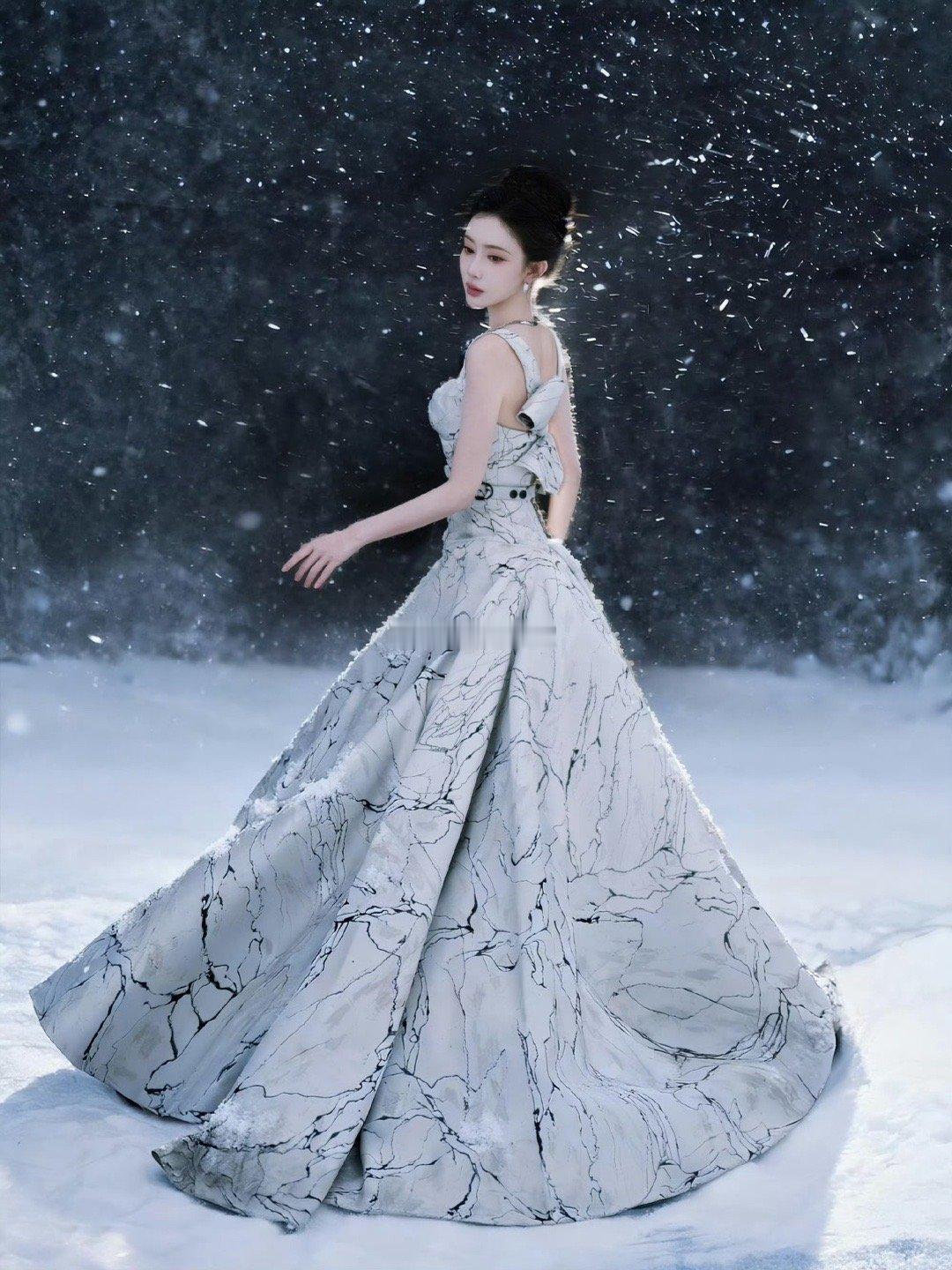 孟子义|尖叫之夜红毯礼服: Julien Fournié 2019秋冬高定闭秀婚纱珠宝:Chaumet尚美巴黎Bee de Chaumet孟子义的婚纱礼服是这次红毯活动中唯一与季节最同步的一件,冰蓝色拖地长裙,冰川裂痕营造冬日氛围感,背部镂空剪裁搭配同色薄纱头纱,雪中精灵具像化!孟子义婚纱孟子义