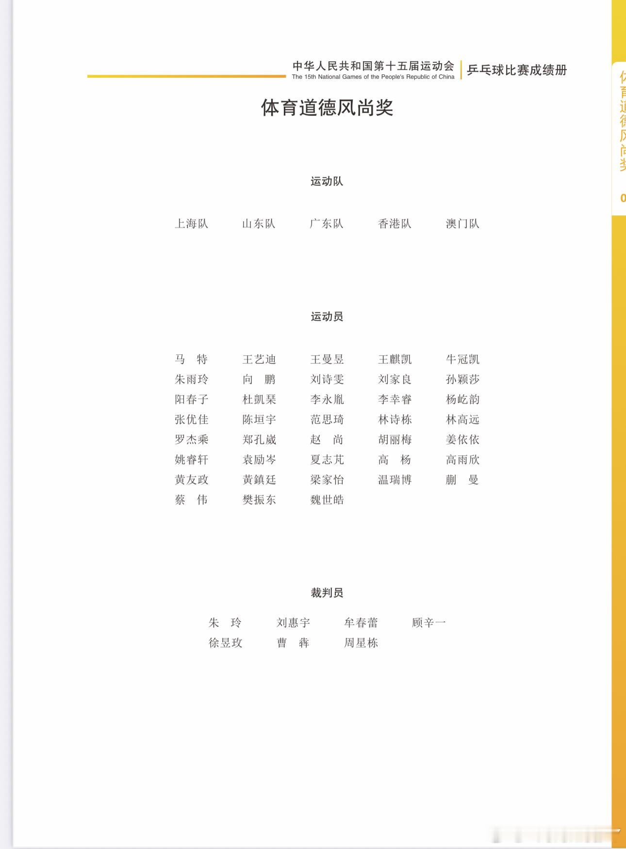 2025大湾区全运会获得体育道德风尚奖的省队上海队 山东队 广东队 香港队 澳门队获得体育道德风尚奖的国家队现役运动员女运动员王艺迪 王曼昱 孙颖莎 杨屹韵 姚睿轩 蒯曼男运动员牛冠凯 向鹏 陈垣宇 林诗栋 林高远 袁励岑 黄友政温瑞博 樊振东知名省队运动员广东队 刘诗雯澳门队 朱雨玲香港队 杜凯琹 黄镇廷山东队 范思琦湖北队 马特湖南队 胡丽梅黑龙江队 魏世皓
