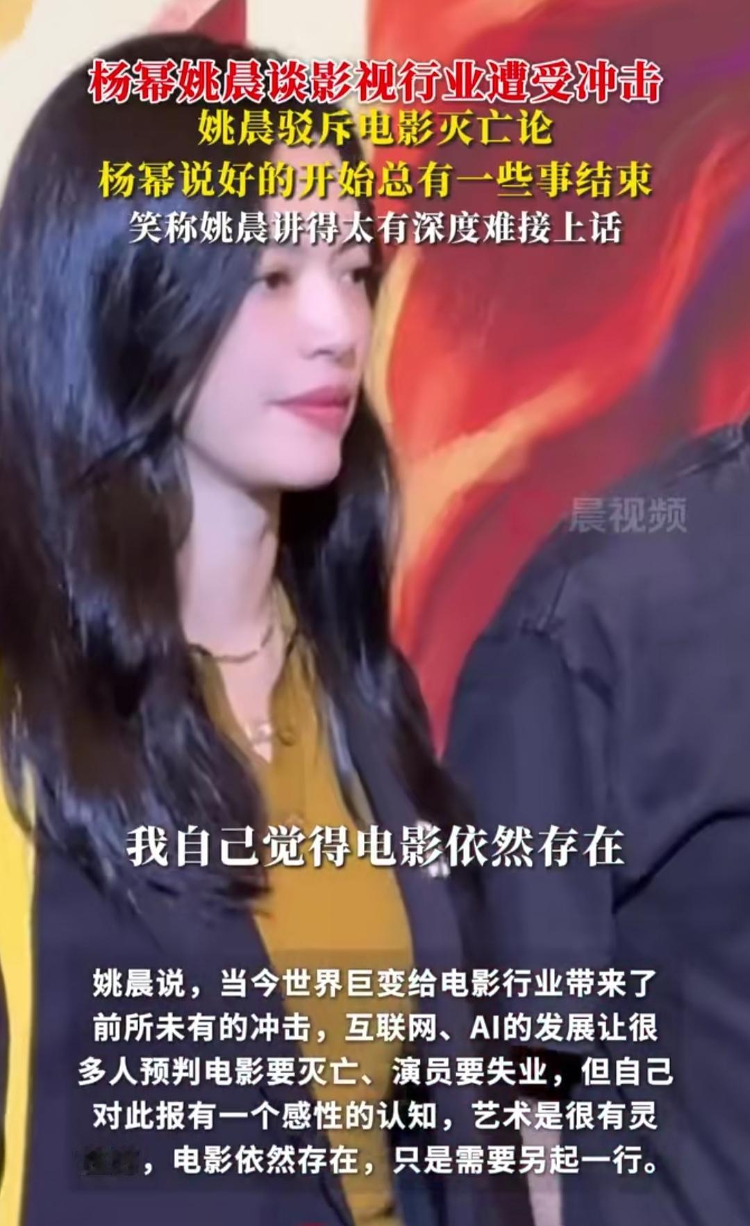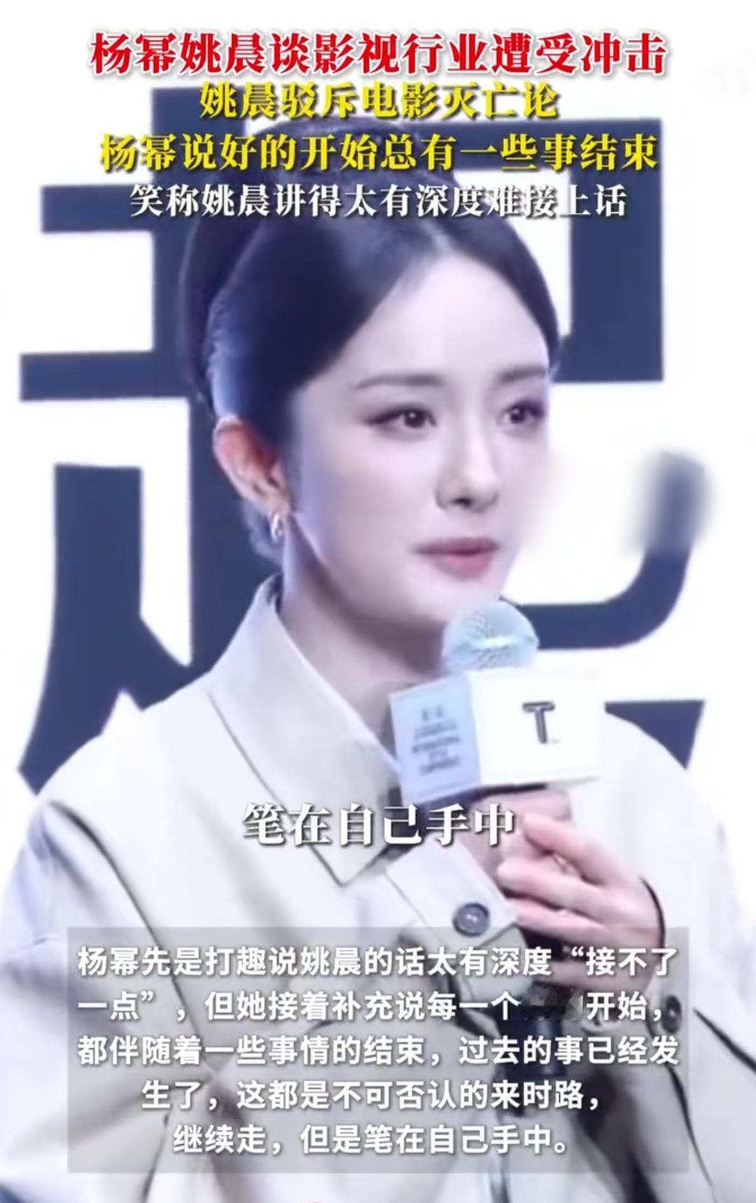 在浙江德清的T风格论坛上,杨幂姚晨聊起影视行业的冲击,一个驳“电影灭亡论”,一个说“笔在自己手中”,这话戳中了多少从业者的心。 现在影视圈是真难:2025年电影开机数腰斩到200部,中小成本片挤不进市场,AI短剧还在抢饭碗。可姚晨偏说“艺术有灵性,电影只是另起一行”——就像她从《武林外传》到《都挺好》,早懂了行业起落。 杨幂接茬更实在:“好的开始总伴随结束,但笔在自己手里”。她刚凭《生万物》拿了高分,哪会不知道转型难?可这话里的底气,是她们从行业低谷里摸爬出来的清醒。你怎么看电影行业呢?