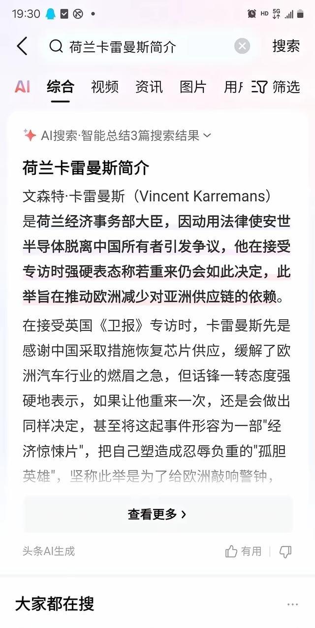 一个迟到的决定,中国必须要做。那就是对荷兰经济大臣卡雷曼斯进行制裁。因为这个人以莫须有的罪名,做了伤害中国公司和中国的事。而且还伤害了全球半导体的供应。 Nexperia这家公司,总部在荷兰奈梅亨,本是飞利浦半导体分支,2018年被中国闻泰科技以36.3亿欧元全资收购。2024年营收20.6亿美元,在分立器件市场占9.7%的份额,年出货超1000亿颗芯片。主要客户是汽车巨头,像大众、宝马、丰田这些,芯片用在刹车系统、电子控制单元上。德国汉堡工厂是主力生产地,中国东莞封装厂负责组装,供应链跨欧亚。收购后,Nexperia业绩翻番,毛利率从25%升到42.4%,还清所有债务,雇员超1.25万,包括欧洲本土团队。 9月30日,Karremans签署部长令,援引1952年《货物可用性法》,宣布临时接管Nexperia。官方理由是“严重治理缺失”和“经济安全隐患”,具体指前CEO张学政涉嫌挪用资金给自家中国工厂WingSkySemi,还试图转移知识产权和运营到中国。但这些指控没公开实证,荷兰企业法庭也只悬挂张学政的董事会权力,把股份放进独立实体。Karremans强调这是独立决定,不是受美国压力,可时间点太巧,美国商务部同天扩展“实体清单”规则,涵盖Wingtech50%以上子公司。Wingtech2024年12月已上榜,被指助中国获取敏感半导体技术。 这一接管直接冻结Nexperia全球运营。荷兰总部不能调资产,中国封装厂停工,汉堡生产线闲置。10月4日,中国商务部反击,禁止Nexperia中国工厂出口成品组件和子装配,影响东莞8万平米组装基地。芯片本该从汉堡运中国封装,再回欧洲,现在卡在港口。汽车业首当其冲,Nexperia占全球汽车硅分立器件5%,短缺一周就让欧洲工厂损失上亿欧元。斯太兰蒂斯设“战情室”监控,大众沃尔夫斯堡线调整计划,宝马供应商网络已受波及。日本汽车制造商协会警告,丰田、本田的电子控制单元缺货,可能波及整个JAMA成员。 Karremans的后续操作雪上加霜。10月12日才公开决定,前两周已秘密执行,只事后通知中国等国。11月13日,他宣布派高级代表团访华,声称寻求对话。可12月2日突然取消,借口“日程冲突”,还说已和中国达成共识。11月19日刚在议会称“暂停干预示诚意”,11月27日Nexperia荷兰子公司又发声明,指责和中国沟通失败,被中国方驳斥为“故意误导”。这些反复让谈判陷入泥潭,中国商务部部长王文涛在欧盟会晤中直指荷兰责任,摊开报告显示供应链中断数据。全球不确定性持续,汽车装配线空转,工人加班调试替代设备,却兼容性差,油渍手上天天擦。 这场干预的根子在Karremans的单边主义。他上任后强调本土保护,却没顾及国际合作细节。Nexperia欧洲团队早有不满,三位高管——荷兰法务总监鲁本·利希滕伯格、德国CFO斯特凡·蒂尔格、COO阿希姆·肯佩——9月1日联名请愿企业法庭,调查治理问题。这成了导火索,可Karremans的法令直接切断中荷沟通,没事先协商。结果,芯片短缺从汽车蔓延到消费电子,苹果、三星、戴尔这些客户供应链受阻。行业人士说,Nexperia不是最尖端,但产量大,替代难,短期内工厂停工一天损失数百万。荷兰自己也遭殃,ASML等本土企业声誉受损,欧盟汽车制造商协会呼吁政府干预。 更气人的是,Karremans公开场合总推卸。10月19日电视访谈,他说张学政“背地里转移运营,掏空公司”,却回避证据细节。11月5日,中国商务部回应,说荷兰“任意妄为,没实质行动解决问题”,加剧全球半导体混乱。事实是,中国11月1日已豁免合规订单,支持Nexperia中国厂恢复供应,可荷兰拖延。商务部发言人点名,造成产供链乱局的责任全在荷兰。Karremans的行为不只伤中国企业,还让欧洲汽车业雪上加霜,本已从疫情芯片荒中缓过来,又陷新坑。