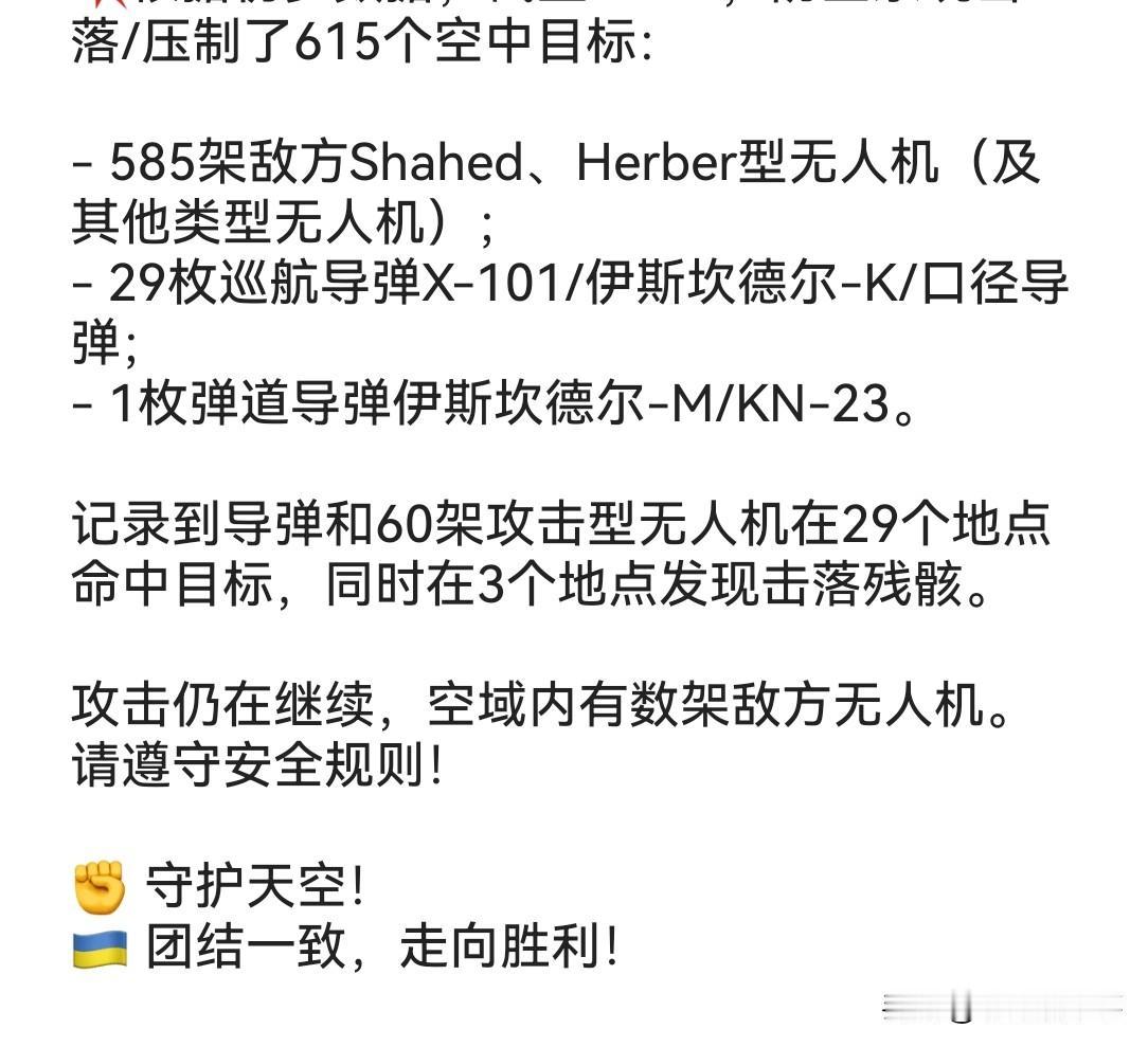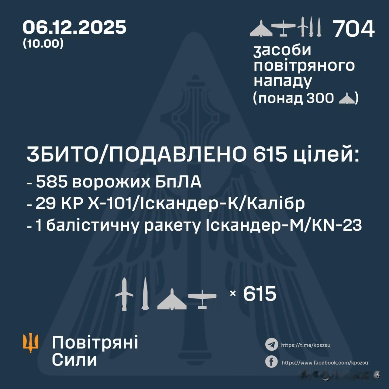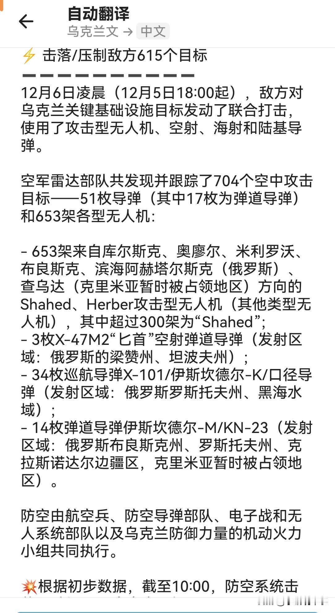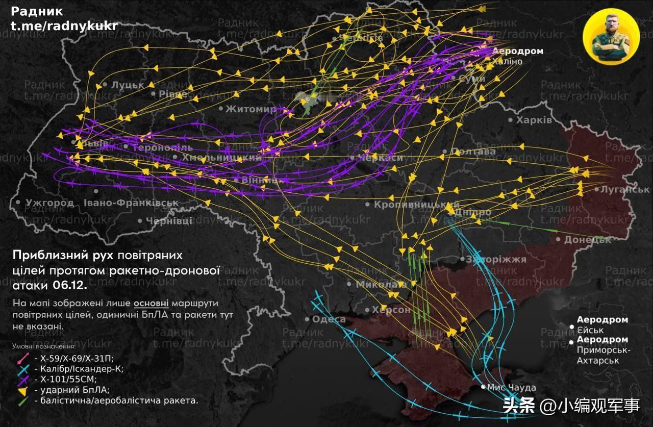 ⚡12月6日,️乌克兰空军报告称击落了704个俄军目标(653架无人机和51枚导弹)中的615个(拦截率为约87.38%)。 此次俄军的主要目标是工业设施、能源设施和铁路基础设施。 图四为俄军导弹和自杀式无人机袭击乌克兰目标的飞行轨迹图。 俄罗斯对乌克兰发动新一轮空袭 你觉得乌克兰会接受俄罗斯的条件吗 乌克兰问题的和平解决方案有哪些难点 乌克兰若接受美国“和平计划”会有何后果 俄乌战争会以和平谈判的方式结束吗 乌克兰危机能否通过和平计划解决