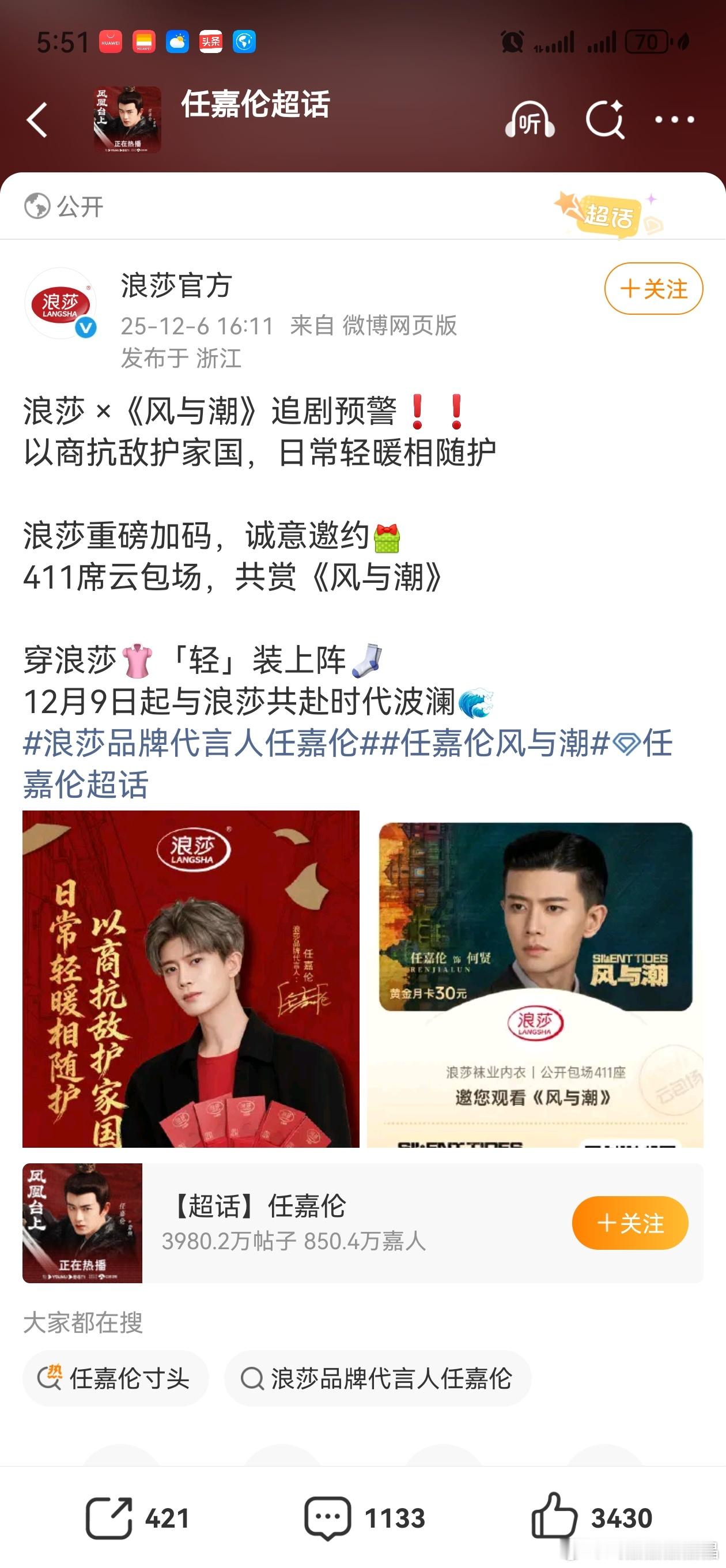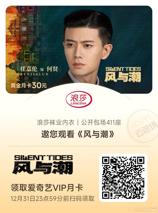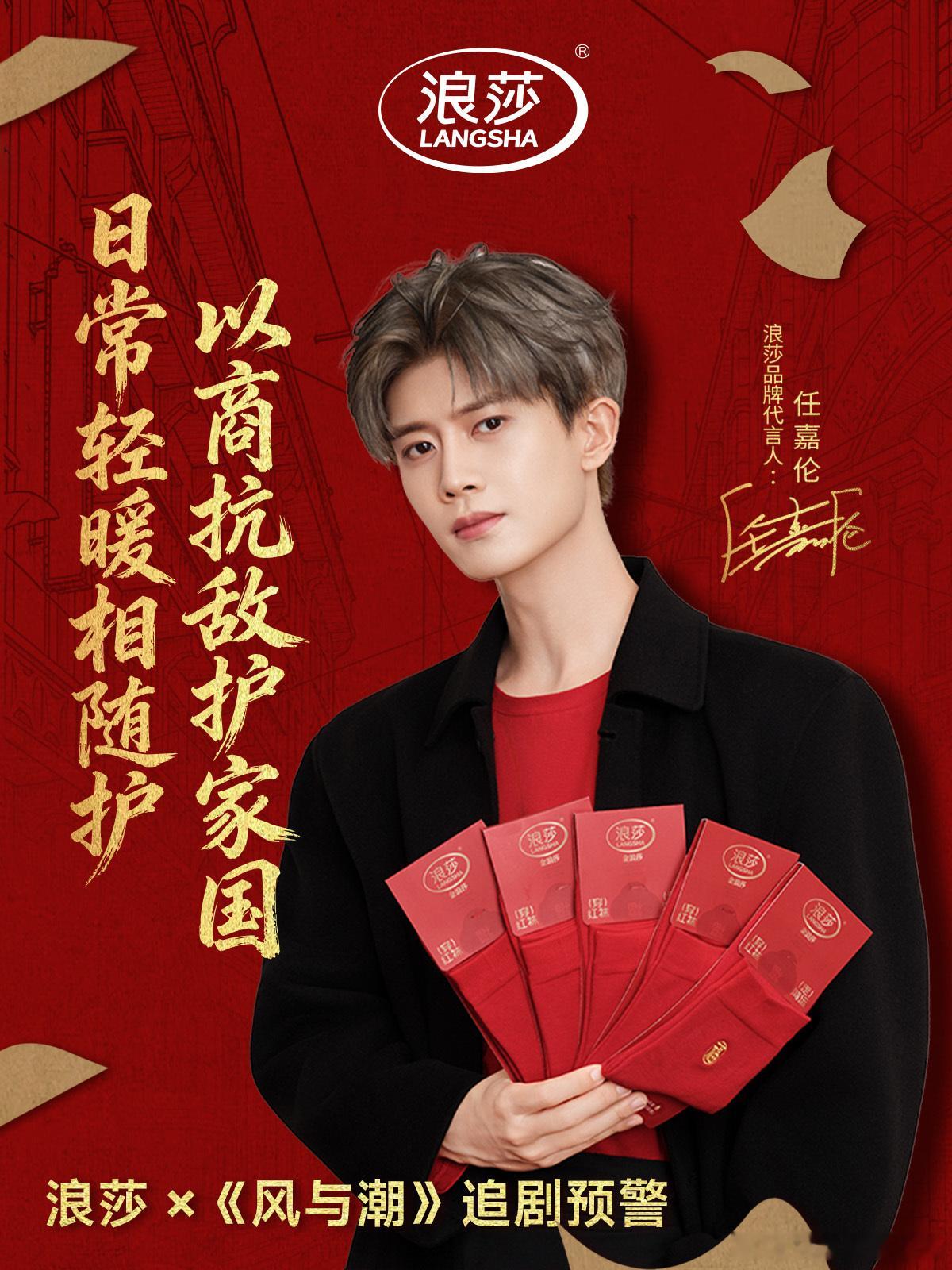 任嘉伦代言的浪莎也来支持电视剧《风与潮》,支持了411个云包场席位,好有心啊,国超的生日密码哦!任嘉伦浪莎品牌代言人