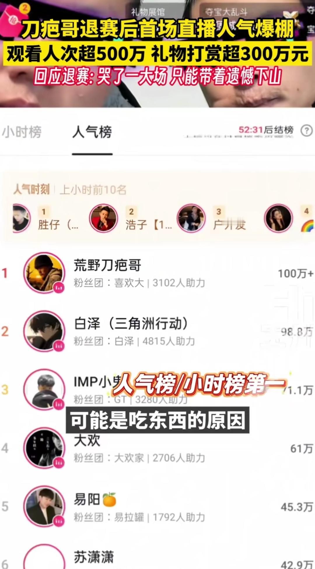 刀疤哥拼死参赛只为赢20万奖金修漏房,结果决赛第9天因肠胃不适遗憾退赛,哭着下山后首场直播竟收获满满,直接到手84万。 他赛前是月入几千的油漆工,脸上的疤是救工友留下的勋章,参赛全程咬牙硬扛:8分钟钻木取火冻僵手指,靠野生猕猴桃果腹,满脑子都是让妈妈住上不漏雨的房子。退赛时他蹲在营地哭了一大场,觉得自己辜负了所有人的期待。 谁曾想阴差阳错,退赛后的首场直播就有500万人观看,礼物打赏扣除分成后到手84万,远超最初的20万目标。可他没飘,面对网友送的家具直言“受之有愧”,只想着用自己挣的钱踏实盖房。 生活有时就是这样,你带着纯粹的心意奔着一个目标去,就算路上拐了弯,藏在心底的真诚和踏实,也会给你意想不到的惊喜。