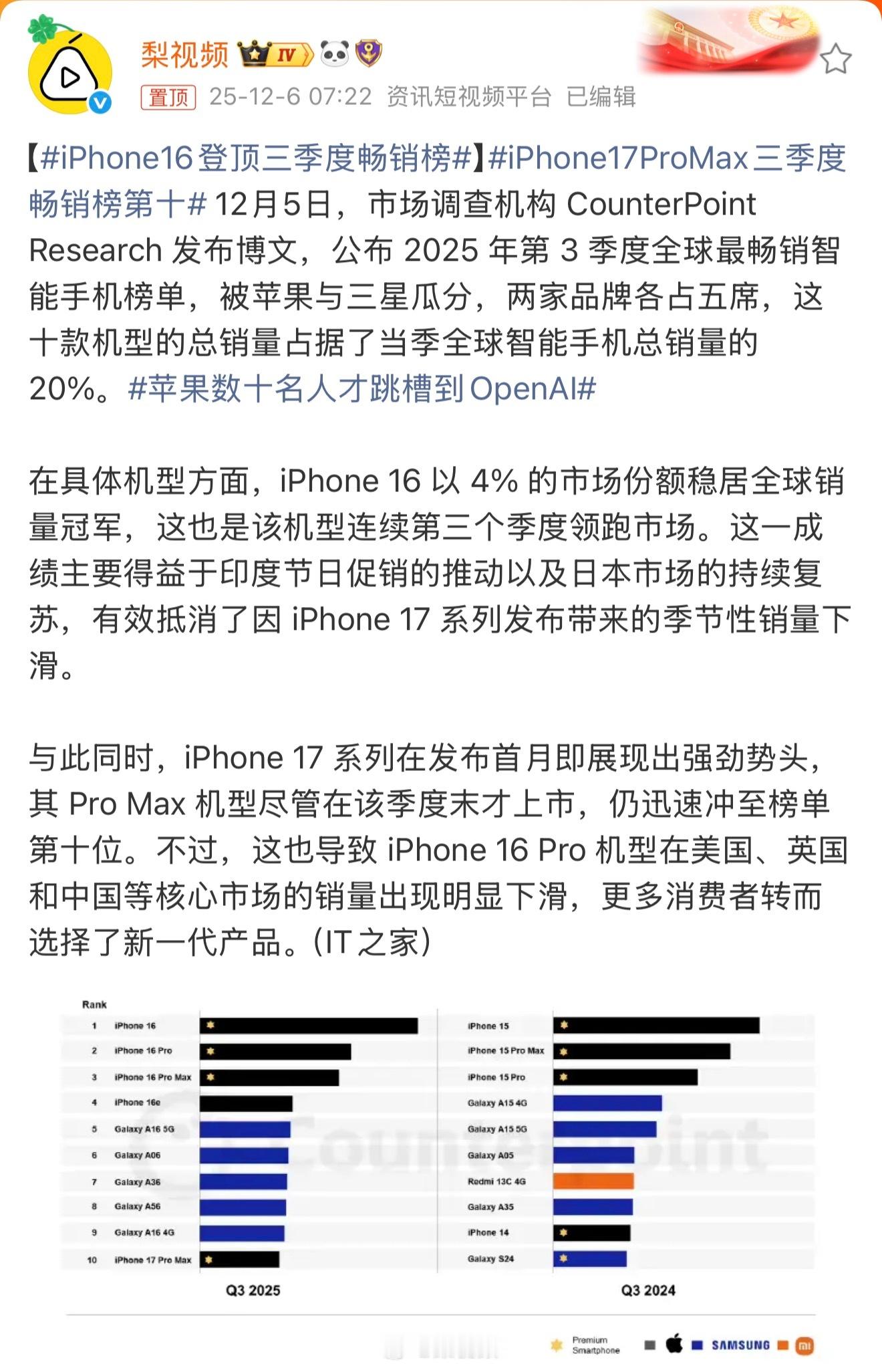 iPhone16登顶三季度畅销榜不管大家认可不认可,还是得靠销量说话啊。但是我真的很好奇啊,iPhone16标准版,1️⃣没有高刷,2️⃣价格也偏高,3️⃣当时出的时候质疑声也不少但为什么销量这么高呢?