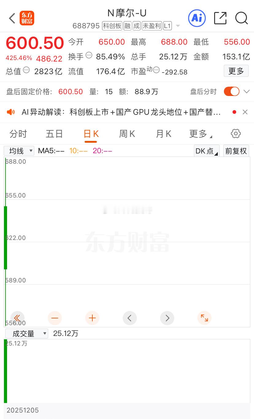 昨天上市的新股摩尔线程,又把不少股民套在了山顶!说实话,这个开盘价有点太离谱了,公司发行价114.28元,早上一开盘就是650元,市值就高达3000亿,盘中最高涨到了688元,涨幅一度高达502%。而从摩尔线程的财报看,已经连续四年大亏,公司预披露的2025年的年报最高亏损11.68亿元,三季报的营收也只有7.8亿元。要知道之前寒武纪吭哧吭哧努力多年才扭亏为盈,今年三季度营收46亿元,净利润16亿元,目前市值也就5700亿,你这一上来就3000亿市值,这估值是不是太离谱了?摩尔线程昨天收盘股价报收于600.50元,较高点回落了近80个点的涨幅,昨天一开盘就冲进来的股民全部被“埋”了,昨天的高点会不会是它这辈子的最高价?财经今日看盘股票