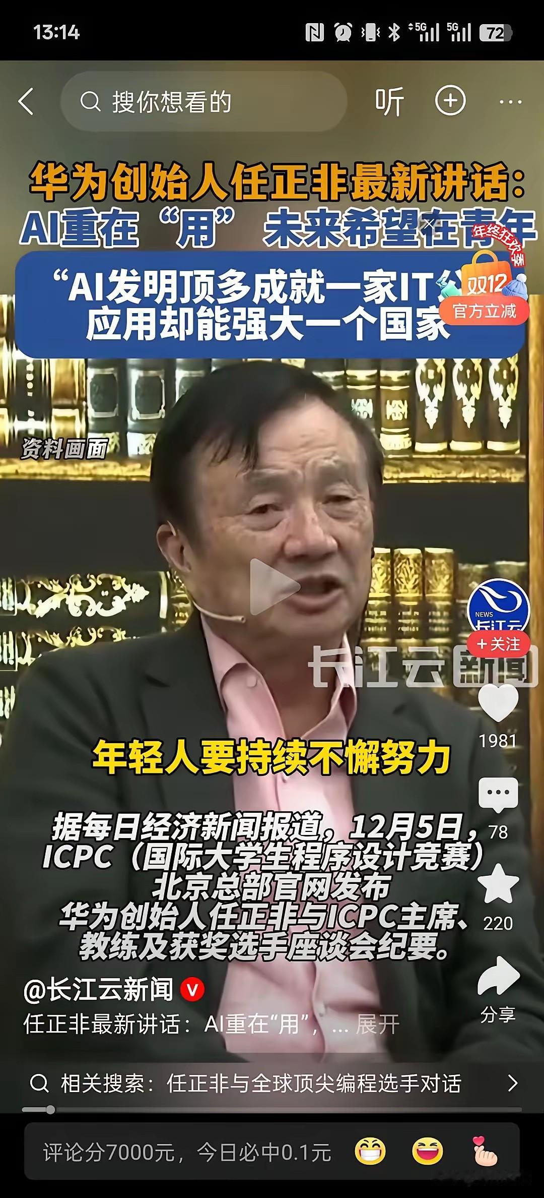 任正非又出金句了!在ICPC座谈会上面对普林斯顿学生的“算力难题”,他直接抛出“算力过剩时代一定会到来”的观点,这格局一下子打开了。 说实话,现在全球科技圈都在焦虑算力不够用,但老任却看到本质——算力将来会像电力一样普及,关键是怎么用。他提到华为专注未来3-5年的产业应用,比如矿山无人化、医疗诊断AI化,这才是把技术变成实实在在的生产力。 更佩服的是他对人才的态度:鼓励年轻人“能摸高就别摸低”,搞理论的只管向前冲,商业落地交给企业。这种分工思维,比硬卷“对标国际”实在多了。而且他坦然说华为芯片落后一代,却依然坚持开放合作,这格局比硬拗“全面领先”的更让人信服。 说白了,老任的底气来自务实——AI不缺概念,缺的是让煤矿工人穿西装打领带干活,这种接地气的视角,才是中国科技真正的增量。