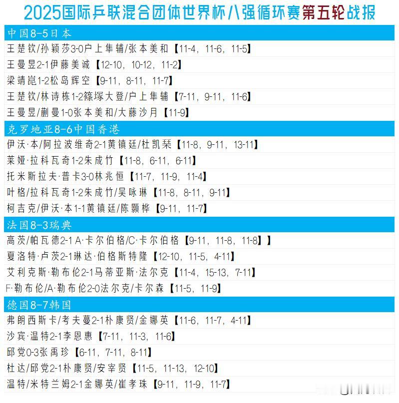 【八强循环赛第五轮打成了巷战!国乒领衔四场比赛三场打满五盘!】 完全没想到今天会是这个样子! 国乒对日本虽说是两支最强球队较量,但赛前觉得日本拿不到四局,结果日本拿了五局。女单没有横扫,男单、男双皆落下风。 克罗地亚近两轮绝地反击特别成功,昨天8-1击败瑞典出乎所有人预料,今天又以8-6击败中国香港,虽晋级无望不耽误斗志昂扬! 德国8-7险胜韩国,两队四盘打平,女双分胜负,德国在先丢一盘的情况下居然女双逆转胜出,德国女双都是大心脏!