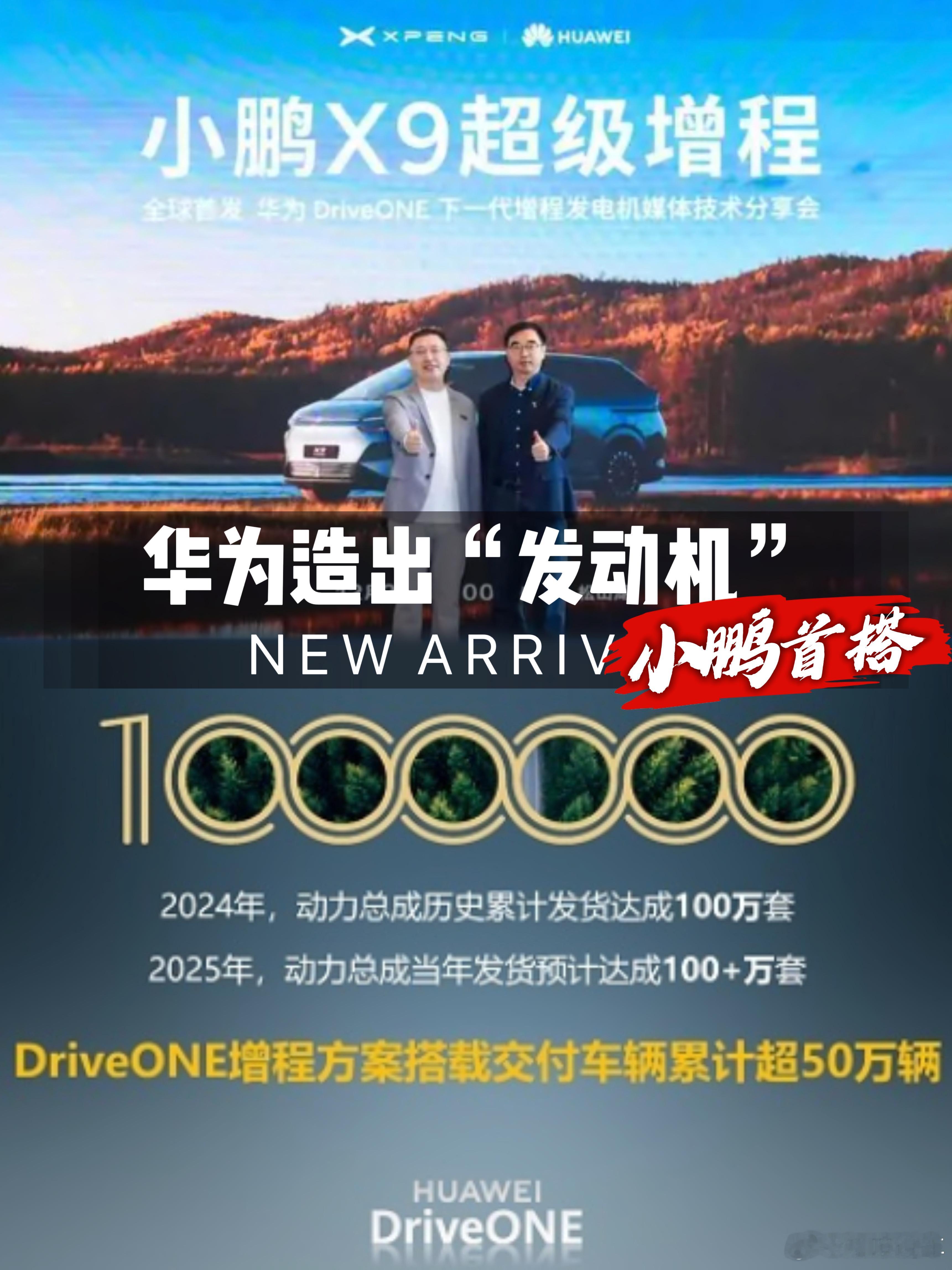 别再嘲笑尊界1.5T引擎了!华为已经造出“发动机”,小鹏首搭12月2日,小鹏和华为共同发布了“小鹏X9超级增程全球首发华为DriveONE 全栈高集成高压油冷发电机”,这个新科技的名字很长,换个简单点的说法,就是专为增程小鹏X9所用的烧油发电机。谁也没想到,一个互联网科技公司和一个曾经只专注纯电的汽车品牌,二者最新的科技结晶竟然是一台“发动机”。而这台“发动机”,足以称得上重构行业。为什么小鹏X9 需要一台全新的发电机?很简单,因为现在的所有增程器,都不能满足现阶段小鹏对X9的期望。一台大七座、超长续航的中大型MPV,还要无限接近纯电动的用车体验,但为了缓解里程焦虑还不能是纯电。听起来很简单,实则却非常难。一台中大型MPV虽然能塞东西的空间多,但是新能源市场卷得厉害,内部空间必须更大,这也就意味着必须把机械件缩到最小的尺寸。纯电MPV的大电池可以全堆在底盘上,但现在的增程MPV,不光有大电池,增程器本身的尺寸还得无限压缩。要不然你看为什么增程器都是1.5T,甚至还有的厂家搞三缸机,每一寸都要被压缩。其次,MPV本身的车重加上满载的重量,基本都要到4吨左右了。现有发动机的功率完全不够,高速巡航、爬坡都可能遇到电量不足的情况。再加上发电、控制、散热和电驱系统的耦合差,导致噪音NVH出现了更大的问题。而增程式车型,作为目前最主流的“纯电过渡方案”,至少在中大型MPV这一品类上,急需更大的科技进步。那怎么办?造呗。小鹏拉上了华为的DriveONE团队,共同打造了这台全新的“高压油冷发电机”先说说这台最新发电机的功能参数。持续功率密度1.88kW/kg,工况发电效率不低于92%,最大发电功率85kW,可持续输出75kW。对比一下,市面上常见的主流增程发电机功率密度普遍为1.2kW/kg左右,最大发电功率在100kW左右。对于只“发电”的发动机来说,越低的功率输出更多的电量才是效率和静谧性的双赢。而这里最关键的参数是“工况发电功率”,经过简单的计算,不低于92%代表着这台全新发电机的发电效率能到3.6kWh/L,行业的普遍水平才不到3.3kWh/L。这个数字还不够直白的话,我们对比一下小鹏的老对手理想。L系列的发电机同样是1.5T的技术,但113kW的最大功率下,发电效率大约在3.1kWh/L。也就是说,小鹏和华为的这套全新技术,能用更低的功率和燃油输出更多的电能。除了功能参数外,这台发动机的尺寸压缩以及静音表现也可圈可点。为了能无限接近电车的使用质感,小鹏和华为共同研发了缸体精准悬停技术,增程器可以主动停缸,介入噪音不到0.5分贝。耳语的分贝是30,正常说话的分贝是60,0.5分贝远低于人类听觉的阈值,再加上抖动控制,增程器的介入几乎完全无感。再加上这台发动机的竖向厚度甚至都不到230mm,还没一个手大点的成年男性手长,乘员舱的空间利用率无限逼近纯电车。可以说这已经不是“衔接过渡”的增程系统,而是新一代的主力增程解决方案。从去年中下旬开始,三电系统的成本逐渐下降、充电桩拥堵逐渐加重,用户的诉求更聚焦在“更长的综合续航里程、更稳定的动力表现、以及更贴近纯电的质感”上,所以新能源车企们对增程器的使用量逐渐加大。华为和小鹏的这套系统,放在小鹏X9上综合续航里程能达到1602km,这在目前的大7座中大型MPV几乎处于全球顶尖的水平,更别说高充电效率所带来的高速巡航、爬坡等工况下的优异表现。如果这套系统投入市场可行,那在未来的几年内,增程车的技术会再次被卷上高潮,而纯电则会面临更大的压力,消费者对新能源的体验将会再次被改写。而我们现在看到的这台发动机,只不过是一个简单的开始。