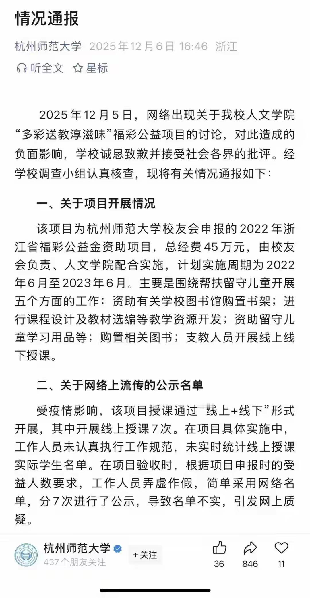 因为“多彩送教淳滋味”福彩公益金项目受助对象公示(线上课程3)名单,与百度文库一份“10000中国普通人名大全”中的姓名及排序完全吻合的事,杭师大12月6日连续两次公开发布“情况通报”! 如果事发前或者早一点“学校对此高度重视”,让事件消亡于萌芽状态或冒头阶段,那就好了!作为一个杭州人,我们的玻璃心都碎了。
