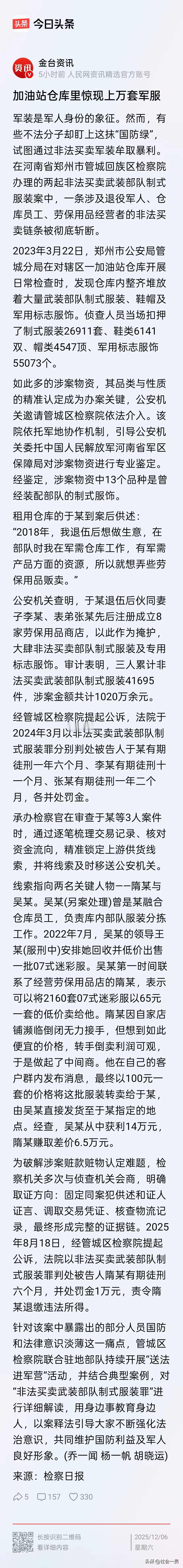开战之前,军队必须先进行严格审查,挖出蛀虫! 今天看到一篇新闻,直接震惊了我。河南居然发现了特大军装贩卖案件,办案人员在仓库里居然扣押了制式服装26911套、鞋类6141双、帽类4547顶、军用标志服饰55073个!这个数量真的太大了! 军改以后,部队早就不允许做生意了,但是部队里的一些人无视党纪国法,居然还在做着违法生意,中饱私囊,这必须引起我们的警惕。同时,我们也要由小见大,查一下军队里到底还有多少这样的蛀虫,除了倒卖军服,还有没有其他违法乱纪的人员存在! 看到没?两万六千多套。我刚开始以为看错了。这可不是小作坊能搞出来的量。网上查了查,这类案子一直有。去年江苏也抓过一伙人。他们卖迷彩服、卖肩章。什么人会买?除了军迷,恐怕还有想干坏事的人。 军装是随便能穿的吗?那是代表国家的。你穿身假军装上街,别人以为你就是军人。骗人容易多了。以前真有案子。有人穿假军装收停车费。还有人冒充军人骗感情。这不仅仅是卖衣服。这是在卖军队的脸面。 部队纪律多严大家都知道。现在还有人顶风作案。为什么?来钱快。风险大,利润更高。这些人心里没有军纪。更没有国家。只有钱。胆子太大了。 查!必须狠狠查。从哪来的,到哪去的。谁经手的,谁保护的。一条线全挖出来。一个都不能放过。军队里不能留这种人。他们是蛀虫。会啃坏整座长城。 光查卖衣服的还不够。得想想,别的方面有没有问题。比如物资采购,比如工程建设。有没有人也把手伸进去了?要查就查个彻底。给全军提个醒。给老百姓一个交代。 信任建立起来难。破坏起来太容易。老百姓那么爱戴子弟兵。看见这种新闻多寒心。不能让他们毁了军队的名声。这比丢多少套军装更严重。 大家还记得前几年那个假大校吗?弄了身假军装,到处骗钱骗项目。最后被抓了。影响多坏。今天卖衣服,明天就敢卖更重要的东西。这个口子必须焊死。 各位读者你们怎么看?欢迎在评论区讨论。