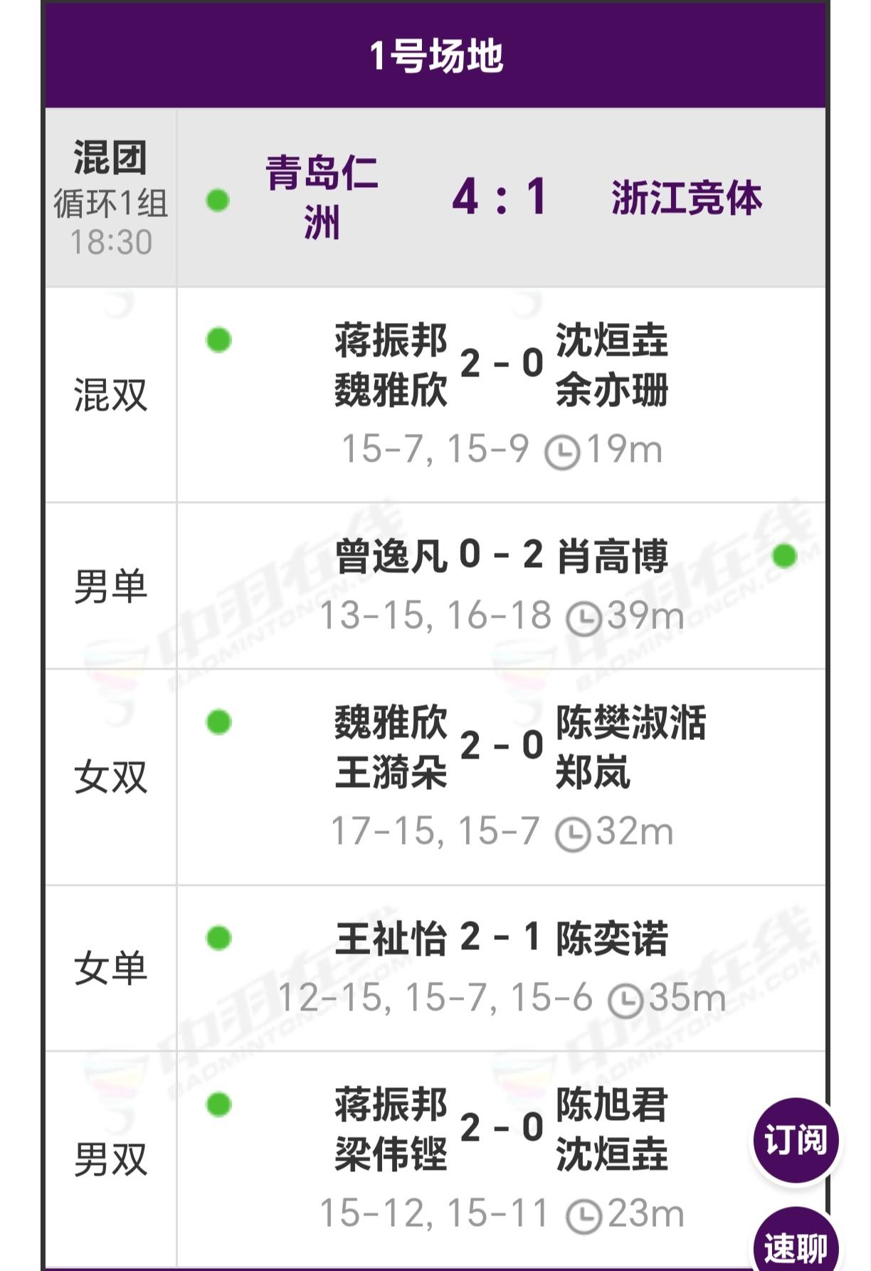 梁伟铿终于止住连输势头,今天搭档混双名将蒋振邦迎来久违的胜利 2025年羽超联赛浙江杭州站 今天梁伟铿搭档蒋振邦第五场出战男双,在球队已取得3-1确定胜利的最后一场比赛,无压力表现,最后以2 - 0(15-12, 15-11)击败浙江竞体的陈旭君/沈烜垚,为青岛仁洲锦上添花再取一分,以4-1战胜浙江竞体队。