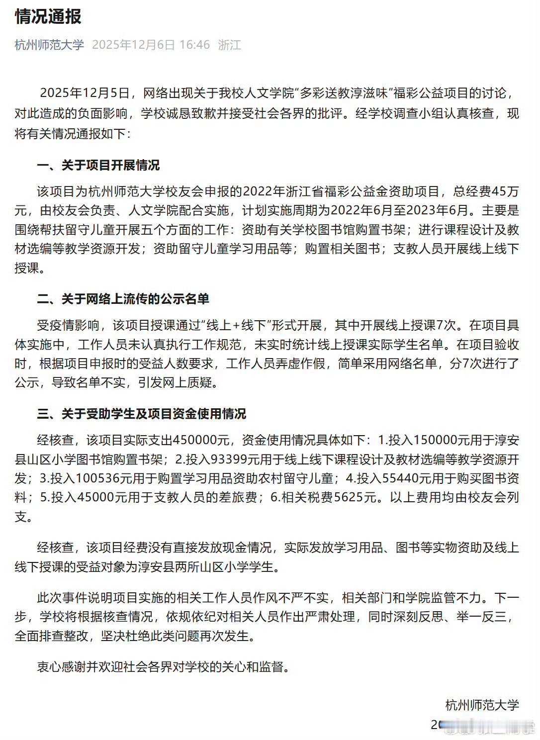 杭州师范大学,不仅福彩受助名单造假,经费使用明细公示也涉嫌造假。经费使用明细大费