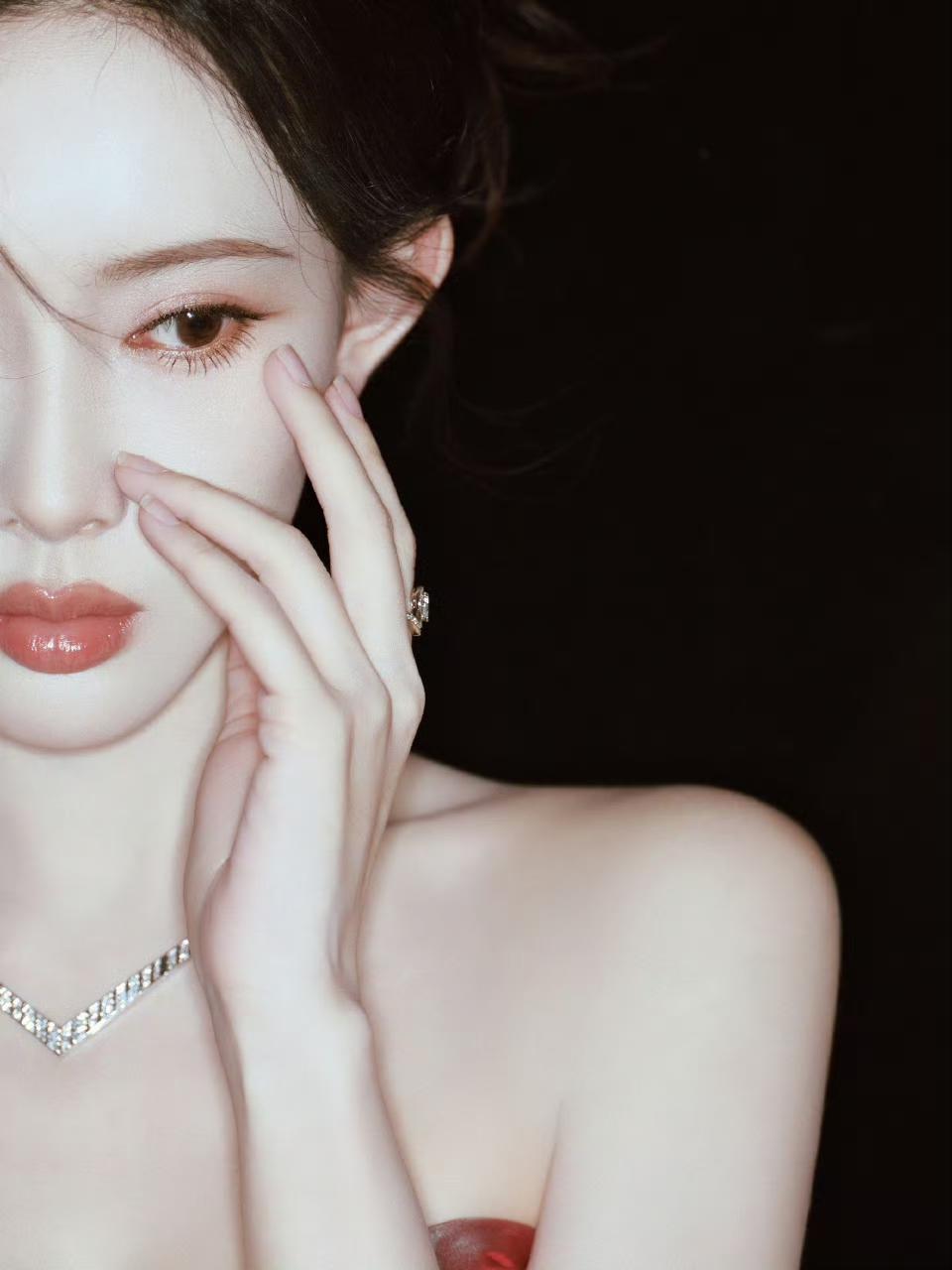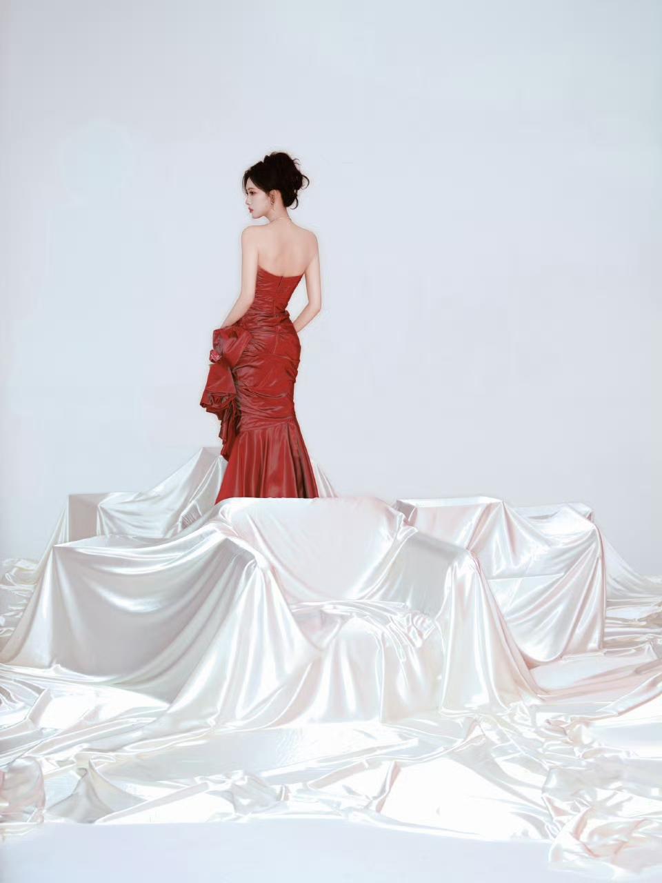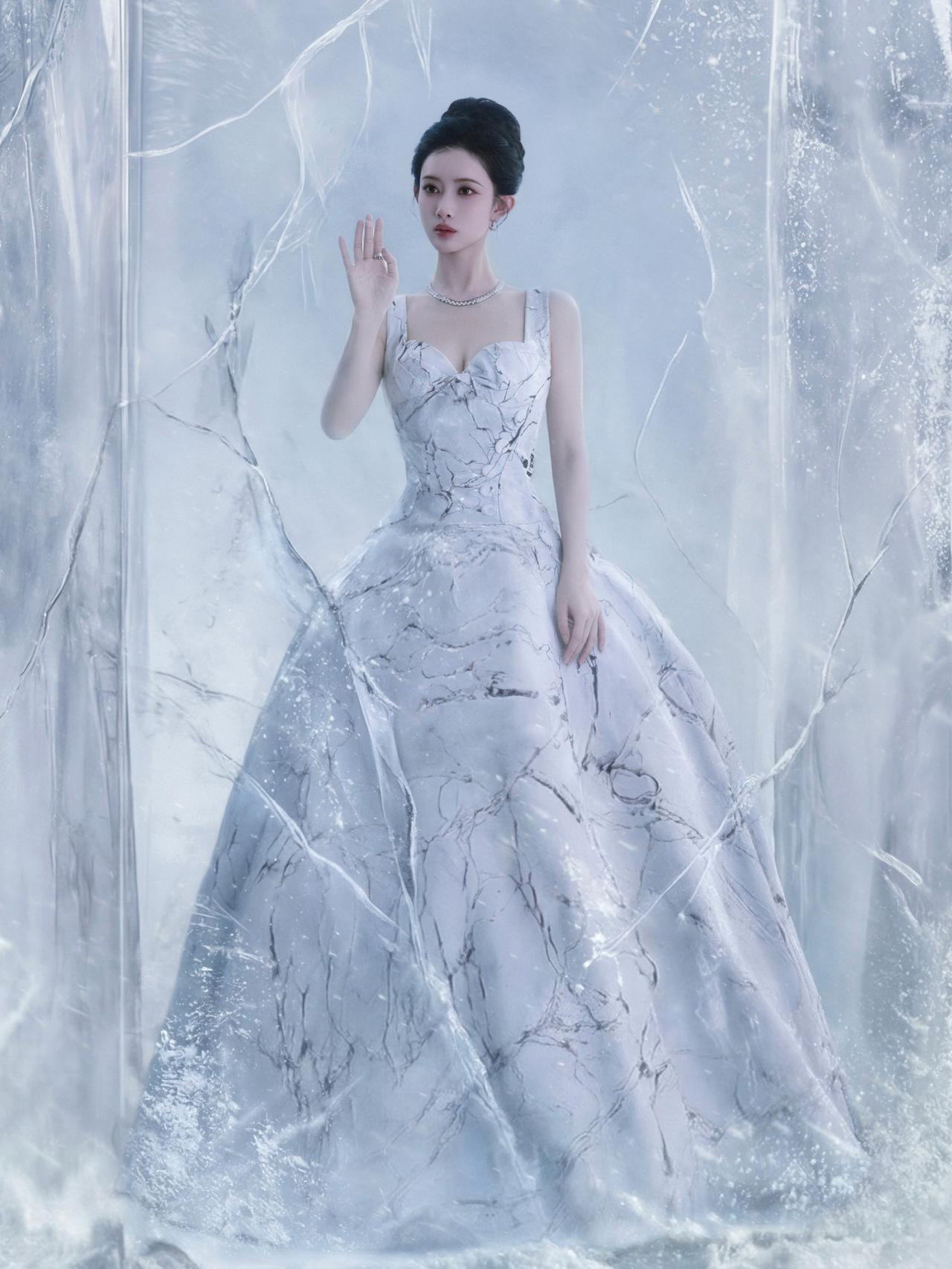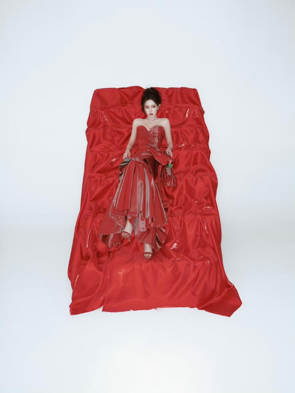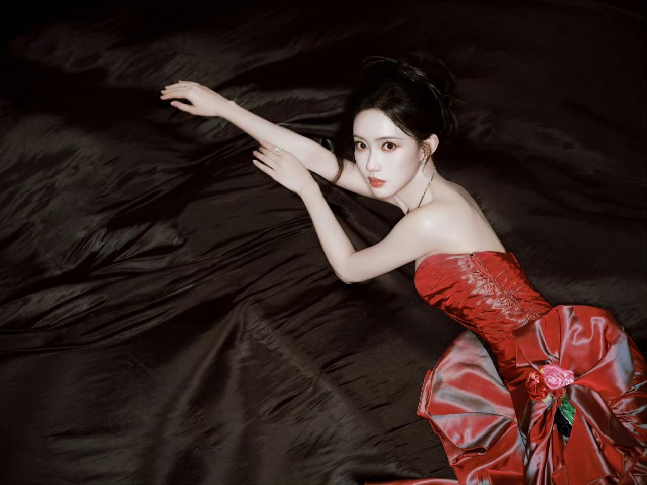 孟子义一袭红裙明艳妩媚。 朱砂红裙染就白绸,留下惊鸿片影。勾勒复古风情轮廓,奔赴一场摩登都会。 白裙之上,点点雪花坠落。 碎裂冰纹渐渐漫上裙角。 冷艳玉面,凝神刹那唤醒沉睡世界。
