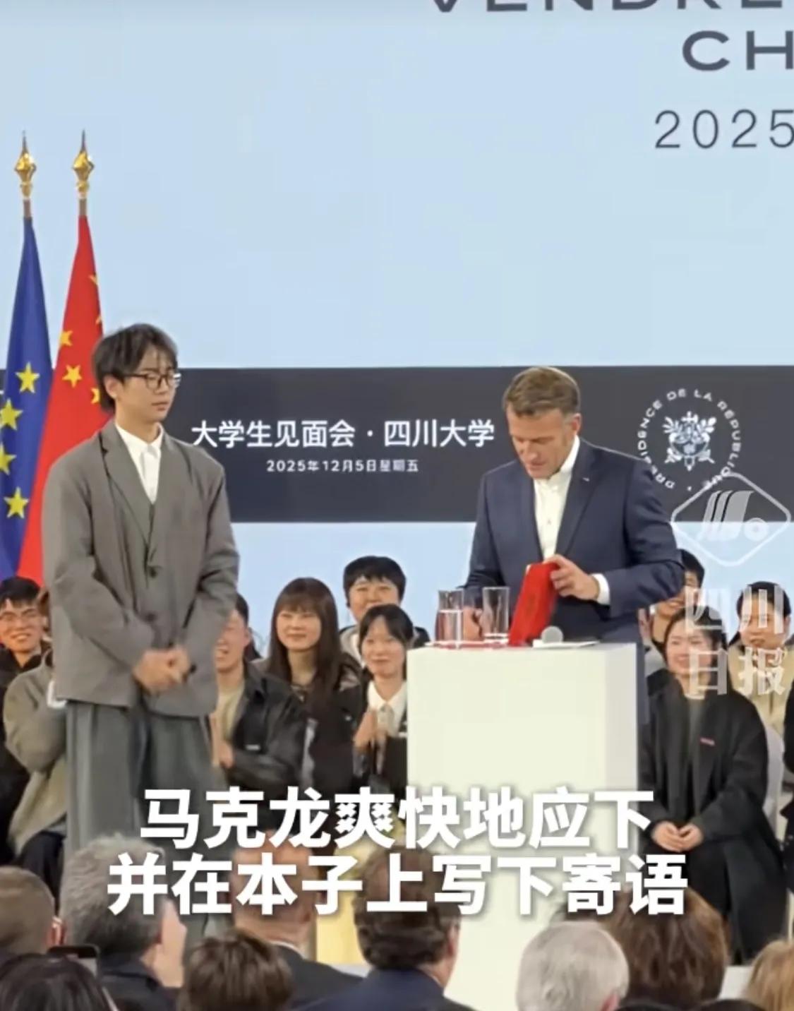 当全网都在热议马克龙现身川大、被学生热情围堵时,我偏要为这个“敢向总统提要求”的川大学生点赞! 12月5日,马克龙演讲现场,这位在读大学生凭借过人的勇气,抓住提问机会,落落大方地恳请马克龙为全体川大学子写下寄语。 面对一国元首,他全程镇定自若、语气诚恳,这份从容与勇敢,直接打动了马克龙,对方当即欣然提笔。 最让人动容的是他身上的细节:一套明显不合身的西装,衬得他有些拘谨,却丝毫掩盖不住他眼神里的坚定与自信。 这一身略显“违和”的正装,藏着他最用心的态度——为了这场重要的互动,他提前备好西装、中国特色的签字本和笔,反复打磨提问内容,最终稳稳抓住机会,惊艳了全场。 没有华丽的穿搭,却有最饱满的热情;没有耀眼的光环,却有最十足的底气! 他用行动证明,当代中国大学生的自信,从不是靠衣着堆砌,而是源于内心的勇敢与真诚,这才是中国青年的最佳风采!