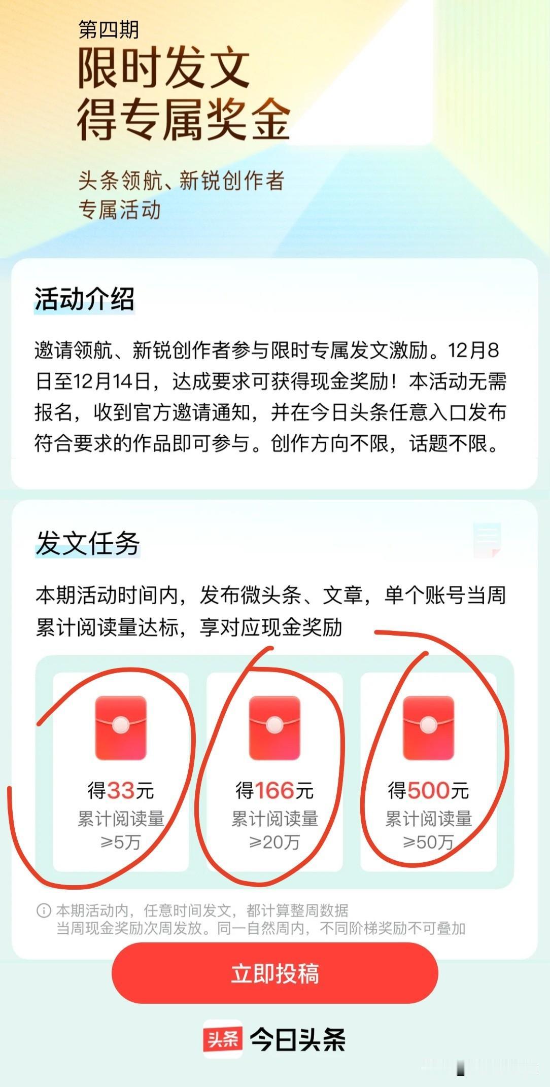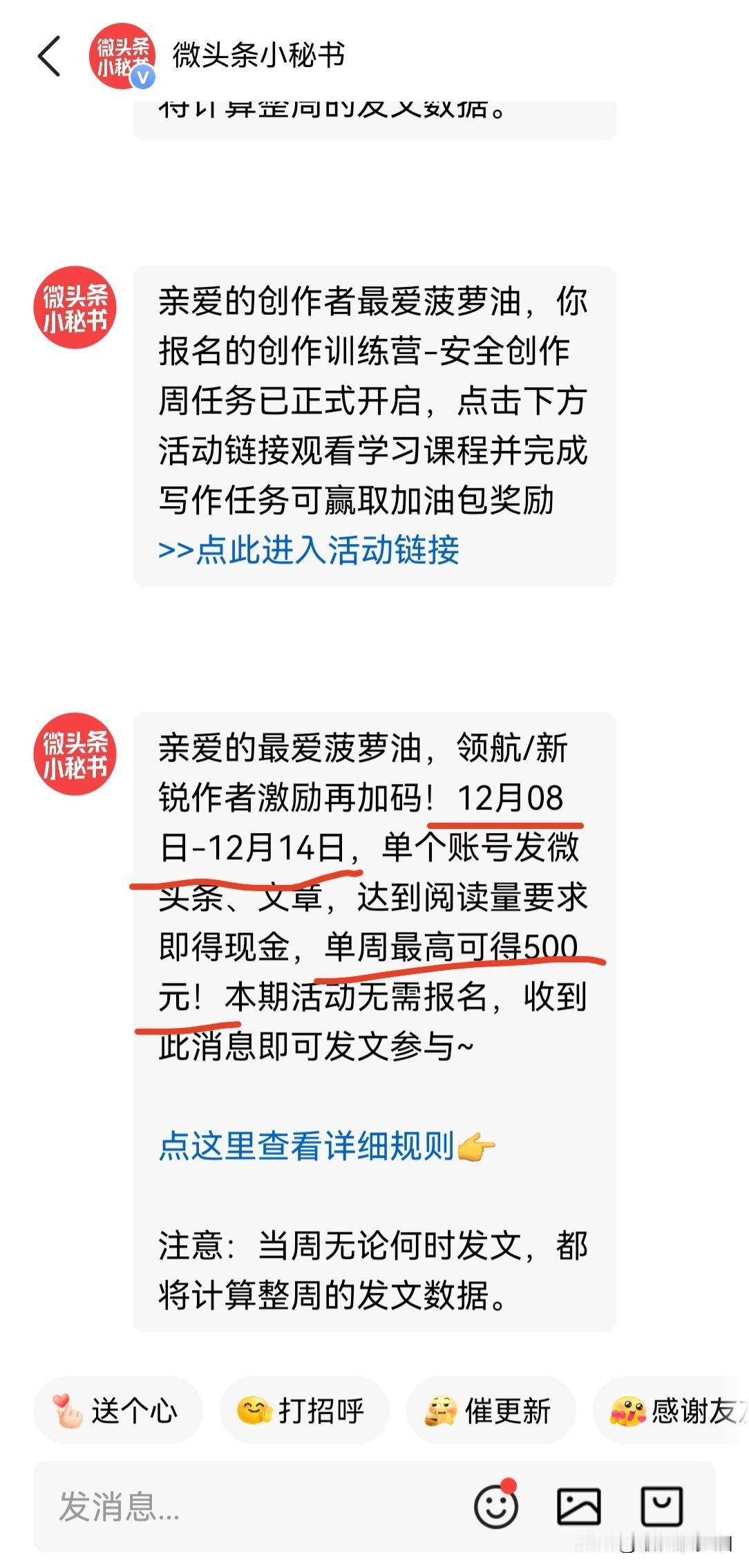 它来了!它来了!限时发文得专属奖金第四期活动开始啦! 下午收到微头条小秘书发来的信息:“亲爱的最爱菠萝油,领航/新锐作者激励再加码!12月08日﹣12月14日,单个账号发微头条、文章,达到阅读量要求即得现金,单周最高可得500元!本期活动无需报名,收到此消息即可发文参与~” 第四期的难度提高了不少,分别有三个阅读量硬性指标: ①累计阅读量≥5万🉐33元 ②累计阅读量≥20万🉐166元 ③累计阅读量≥50万🉐500元 虽然有点难度,但硬着头皮也要上! 知难而上!搂起袖子加油干! 最后附上小米创始人——雷军的经典语录:生死看淡,不服就干! [我想静静][捂脸][笑哭][我想静静][捂脸][笑哭][我想静静][强]