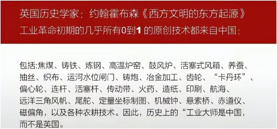 《西方文明的东方起源》作者、英国历史学家约翰·霍布森表示,工业革命初期,几乎所有的原创技术都源自中国。 我们缘何落后?只因我们的文明太过自负,自负到从不质疑自身,也不信有其他文明能够超越我们。