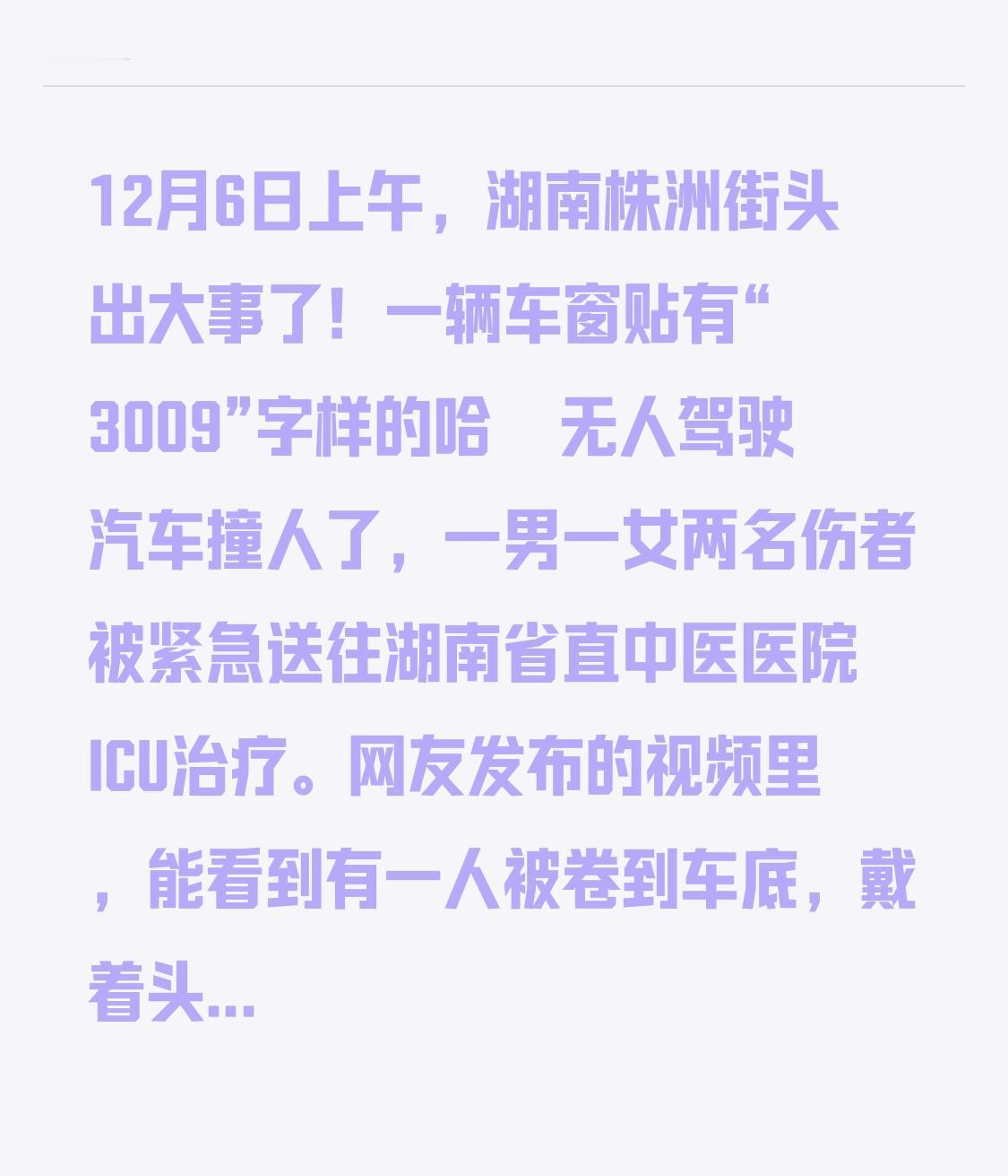 12月6日上午,湖南株洲街头出大事了!一辆车窗贴有“3009”字样的哈啰无人驾驶汽车撞人了,一男一女两名伤者被紧急送往湖南省直中医医院ICU治疗。 网友发布的视频里,能看到有一人被卷到车底,戴着头盔,脸部还有血迹。事故发生后,周边热心市民接力抬车救人,警员和医务人员也迅速赶到现场。 哈啰客服称正在核查此事并会持续关注,株洲公安局交通管理支队值班室工作人员表示不清楚,让工作时间再问。无人驾驶本是科技进步体现,可这一出事故,真让人对其安全性捏把汗。