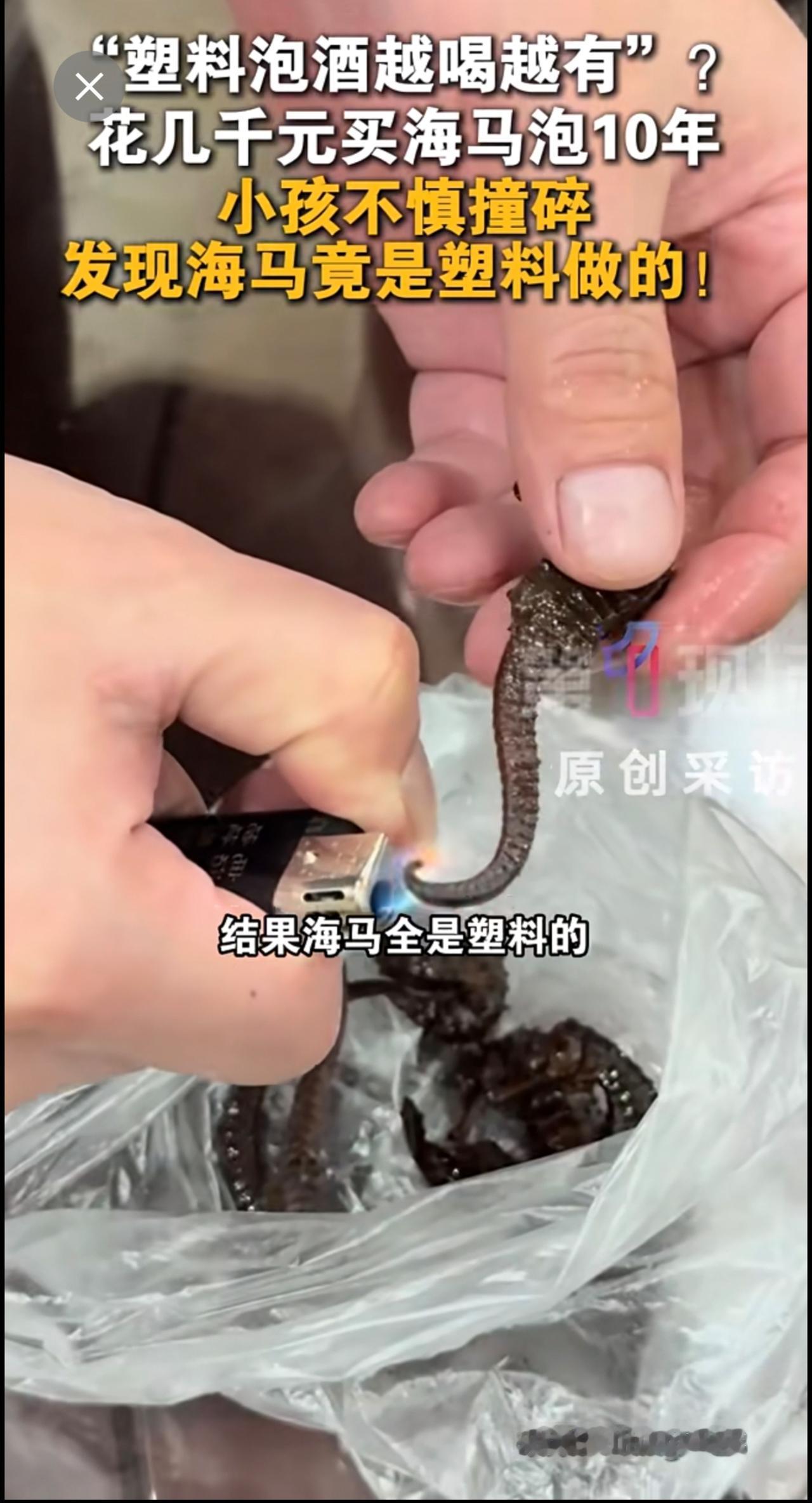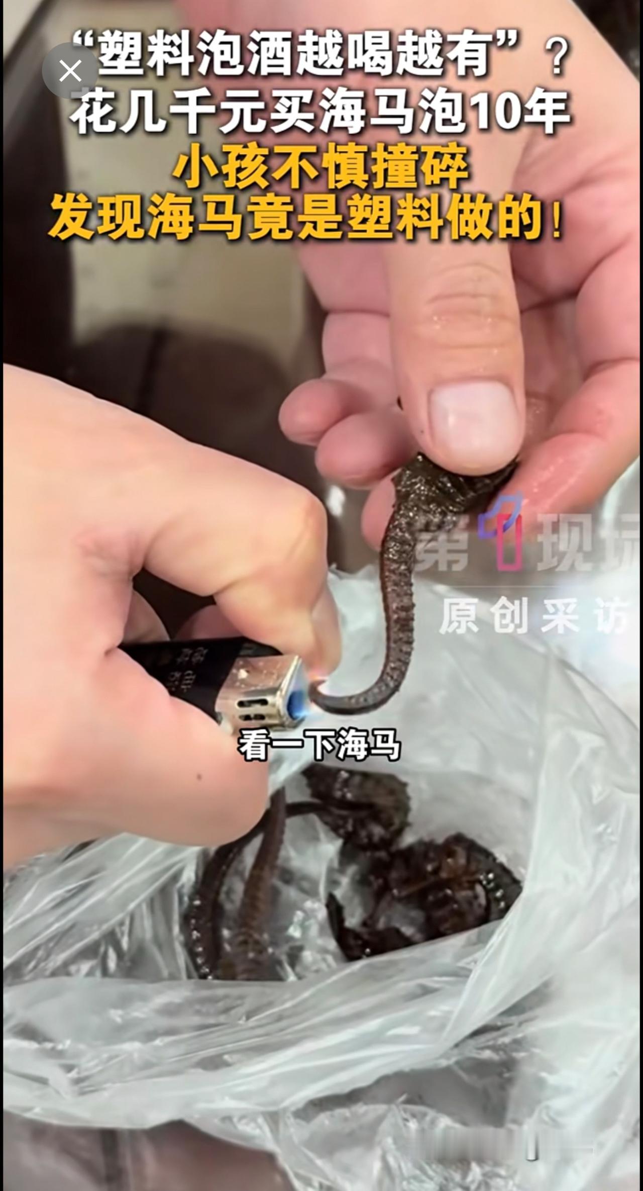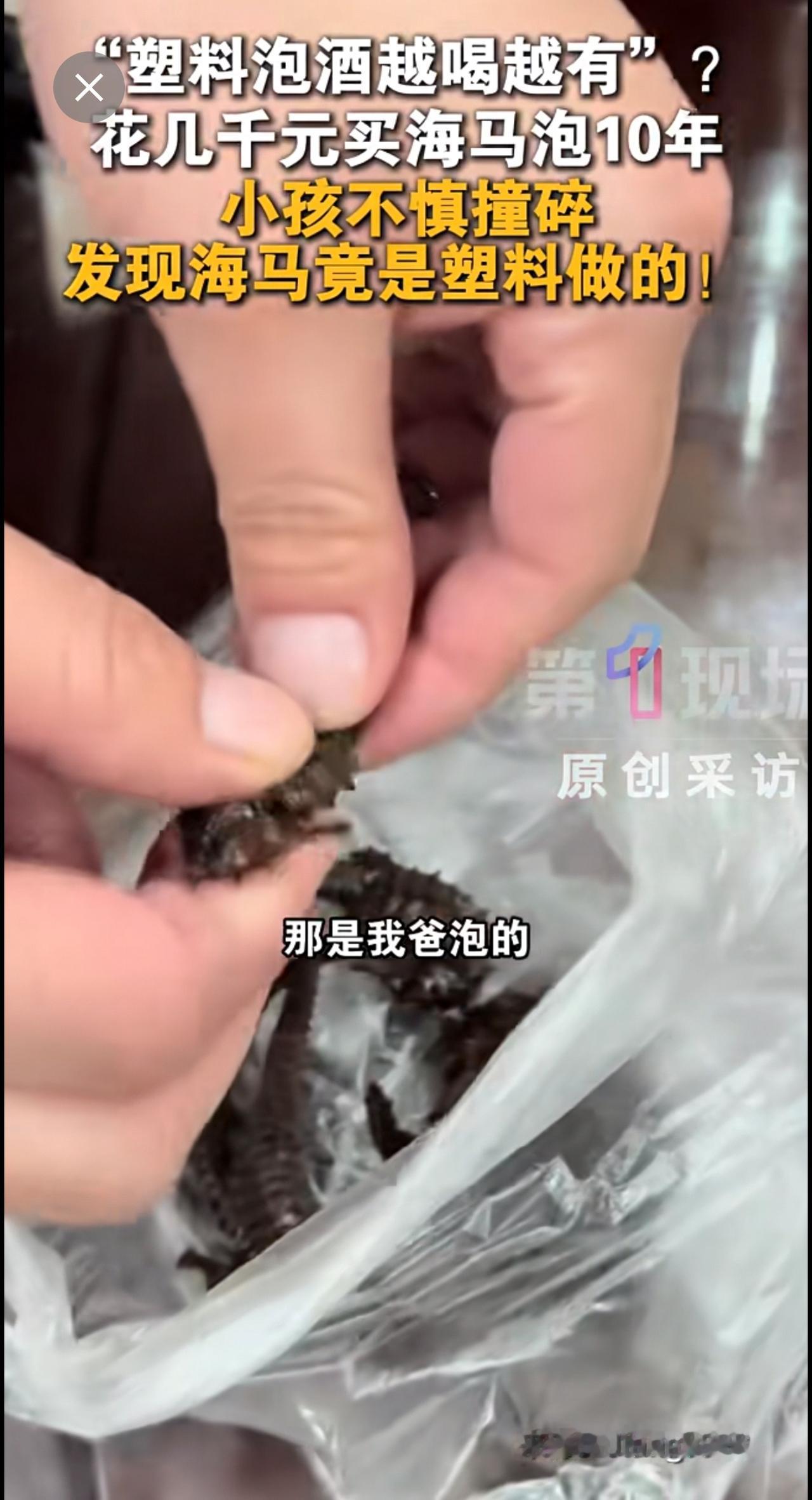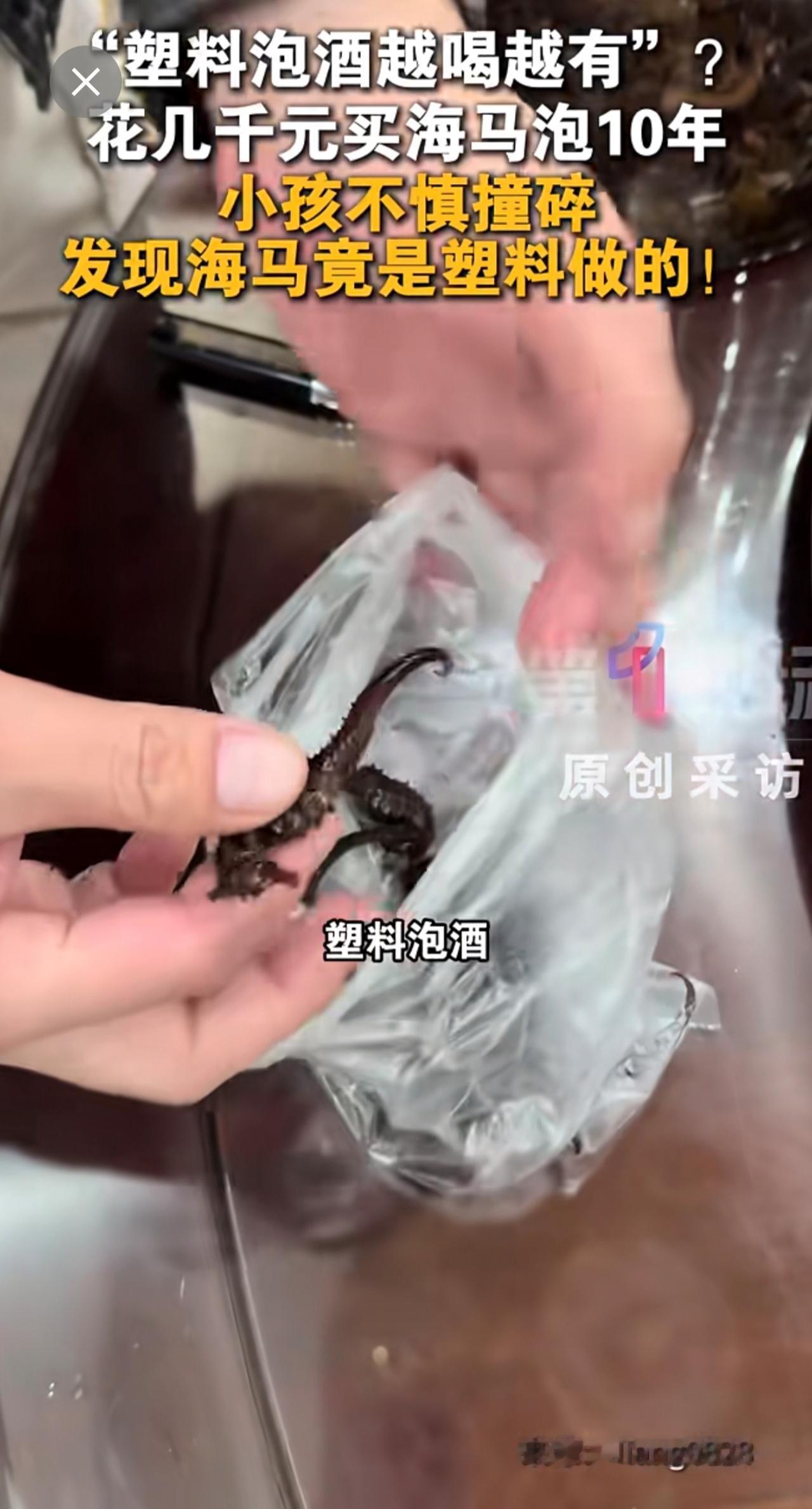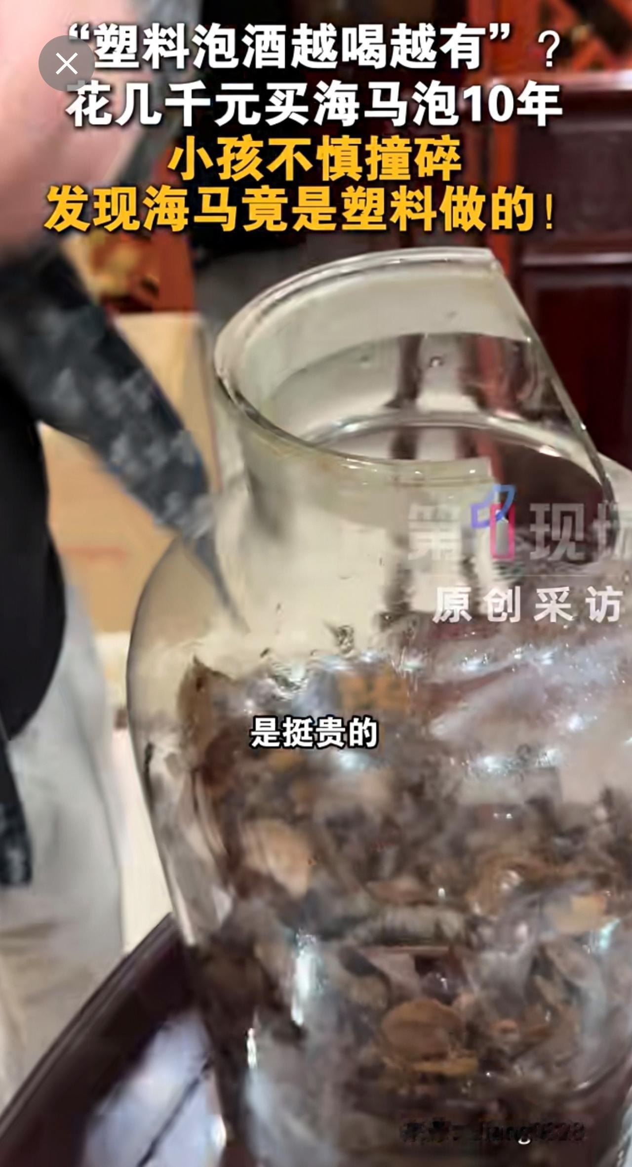 12月6日,广东梅州一网友表示,老爸花几千元买的海马泡了十几年酒,近日儿子撞碎酒盖,倒酒时竟发现海马是塑料的!