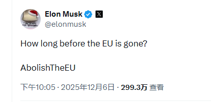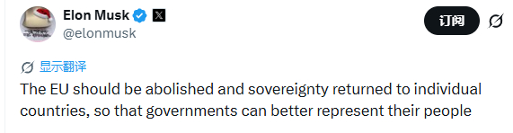 欧盟还要多久才能解散?废除欧盟。欧盟应当被废除,主权归还给各国,以便各国政府更好地代表其人民。——马斯克的“暴论”惹怒了欧洲人,很多人在这两条推文下面声讨:美国政府应当被废除,主权归还给各州,以便政府更好地代表人民。