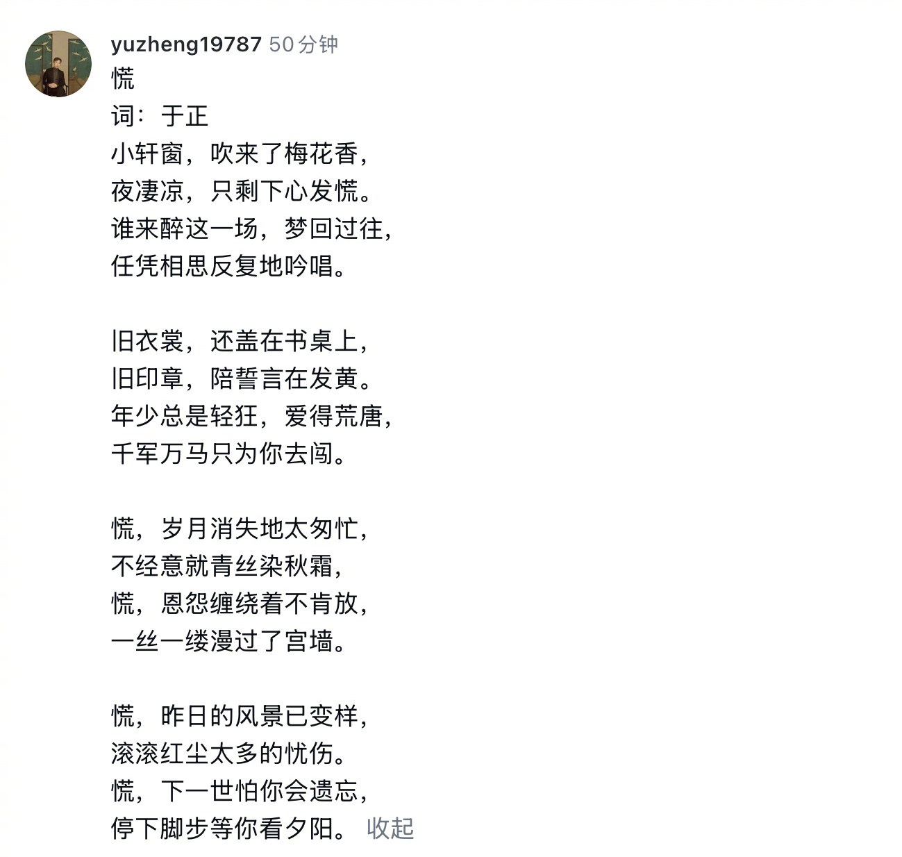 慌词:于正小轩窗,吹来了梅花香,夜凄凉,只剩下心发慌。谁来醉这一场,梦回过往,任凭相思反复地吟唱。旧衣裳,还盖在书桌上,旧印章,陪誓言在发黄。年少总是轻狂,爱得荒唐,千军万马只为你去闯。慌,岁月消失地太匆忙,不经意就青丝染秋霜,慌,恩怨缠绕着不肯放,一丝一缕漫过了宫墙。慌,昨日的风景已变样,滚滚红尘太多的忧伤。慌,下一世怕你会遗忘,停下脚步等你看夕阳。