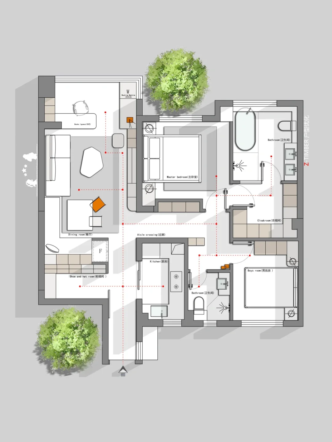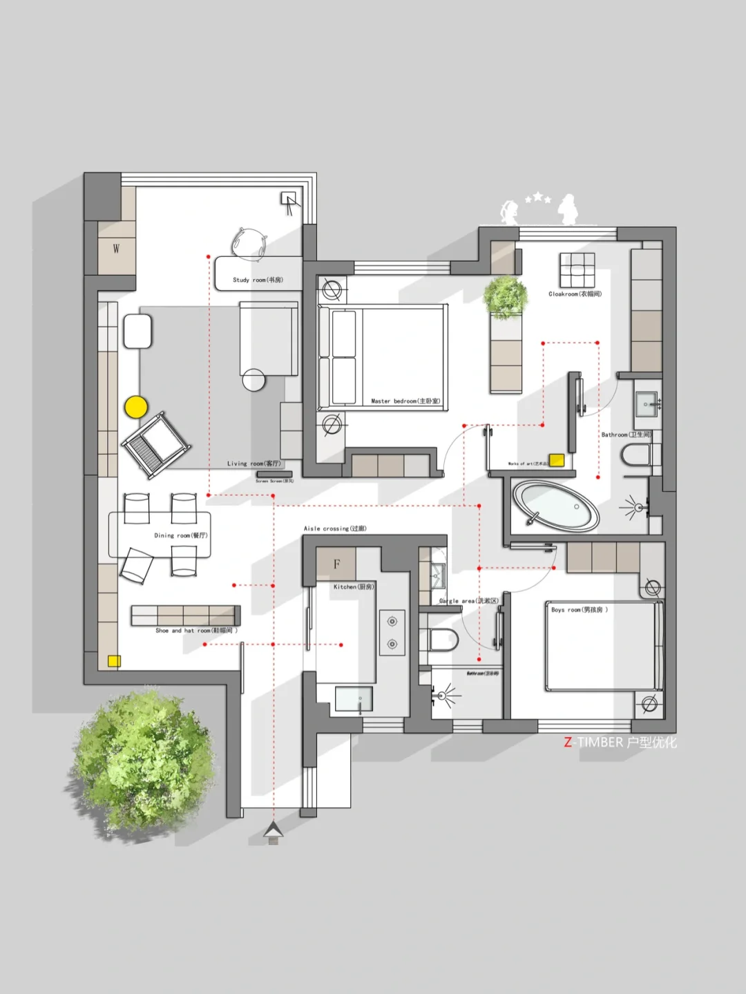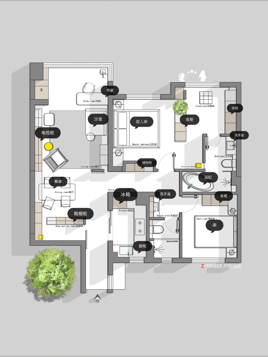 设计要求: 业主是个一对夫妇,一个孩子上大学,偶尔回来住 1、要求要有书房,整体通透,简约大方 2、主卧尽量大些、多的储物空间、主卫要有个浴缸 3、风格;简约现代