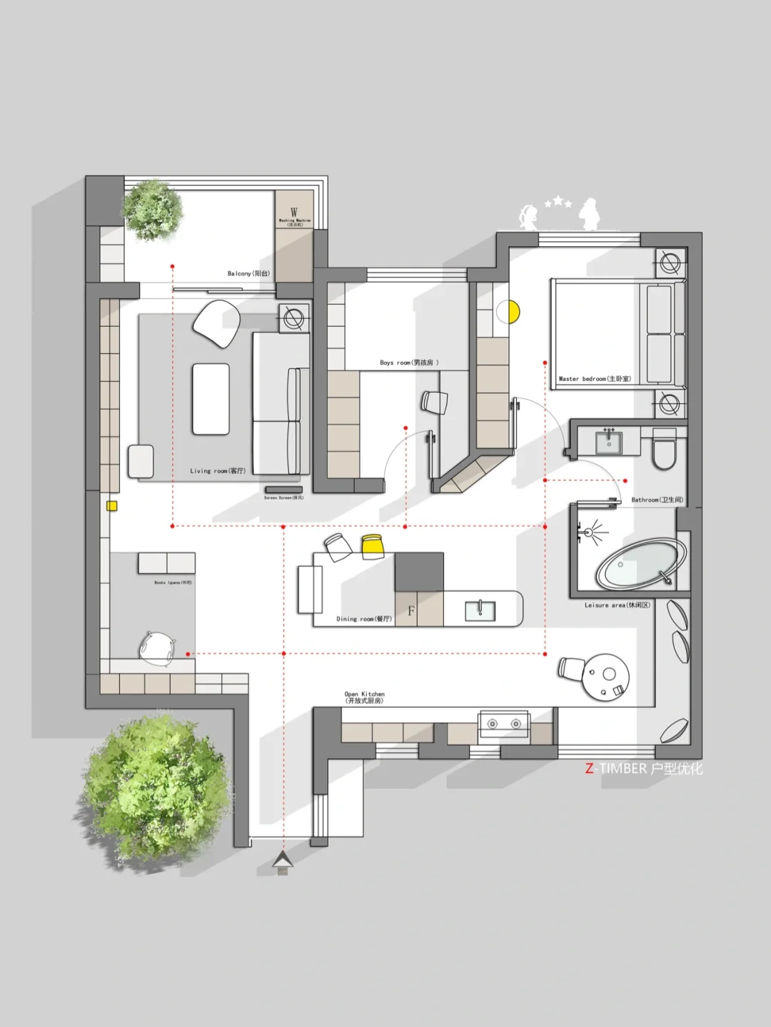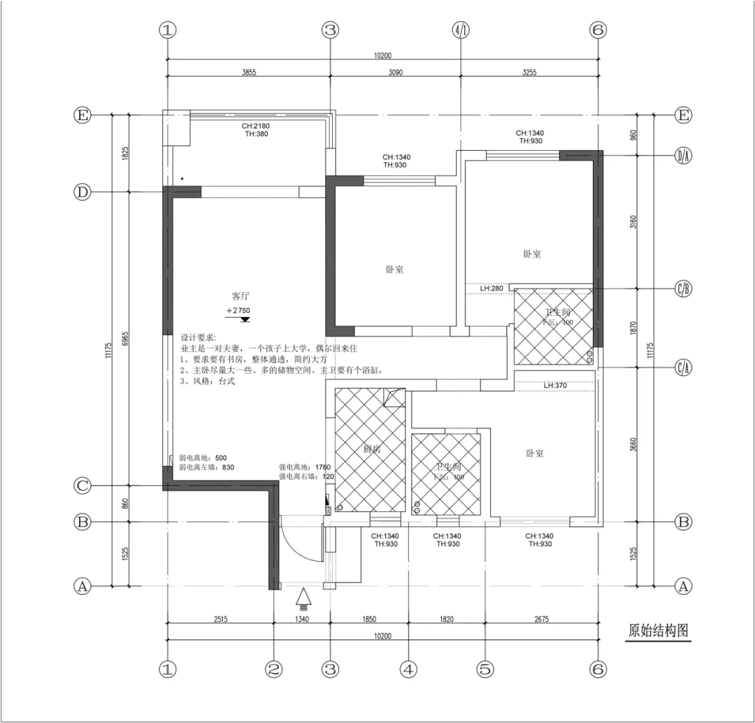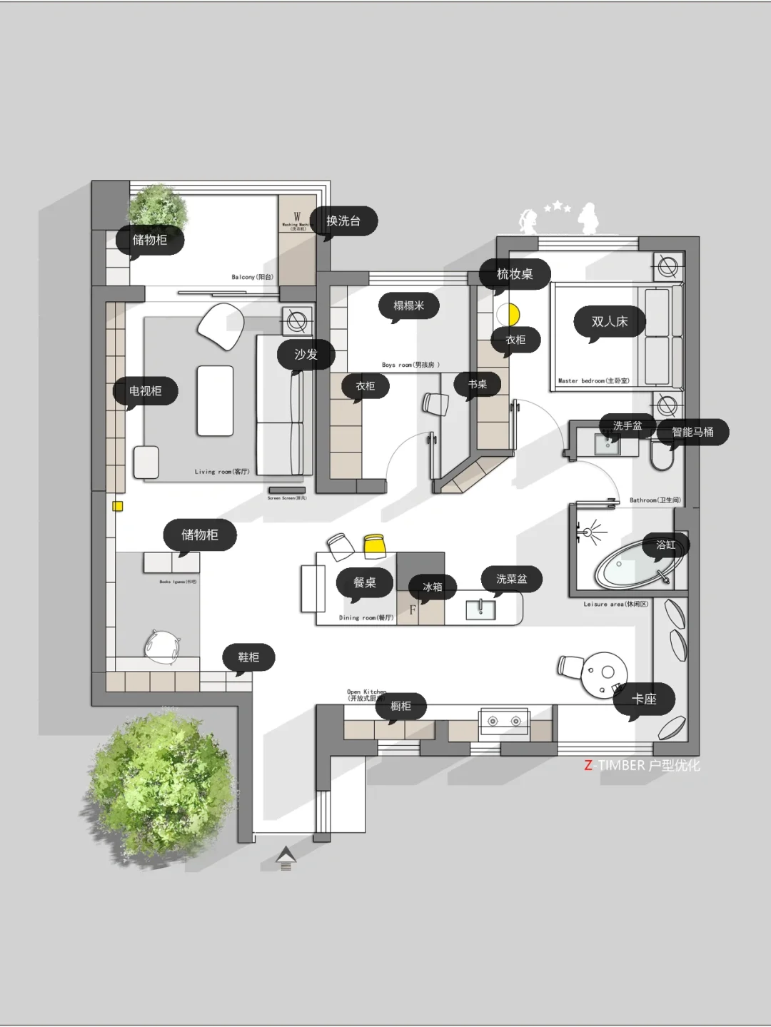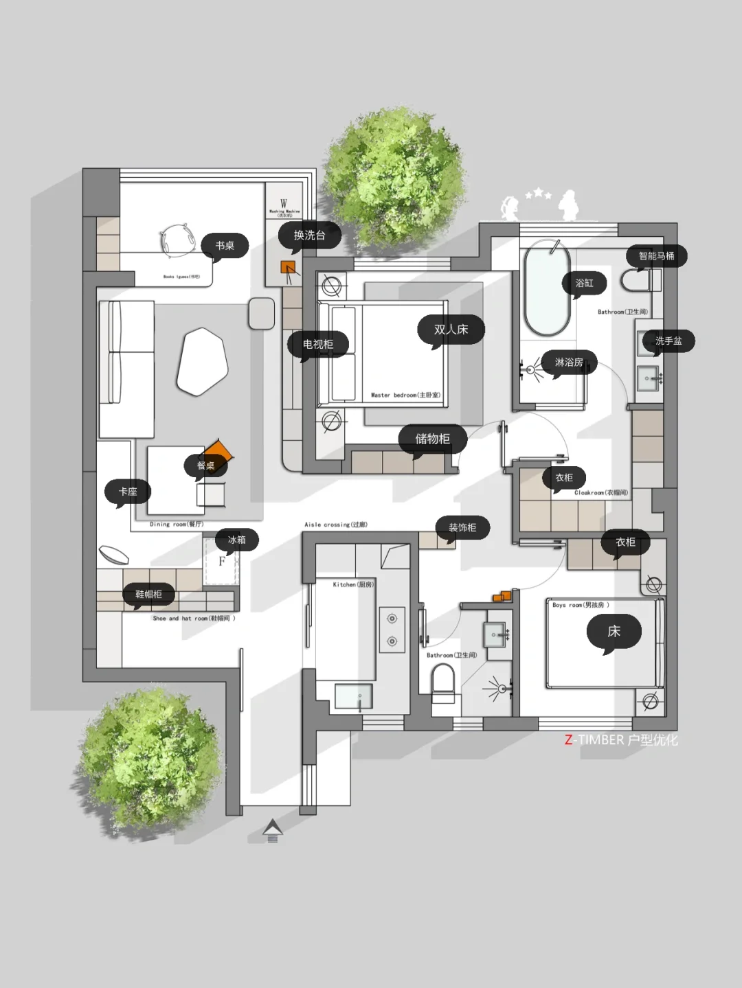 设计要求: 业主是个一对夫妇,一个孩子上大学,偶尔回来住 1、要求要有书房,整体通透,简约大方 2、主卧尽量大些、多的储物空间、主卫要有个浴缸 3、风格;简约现代