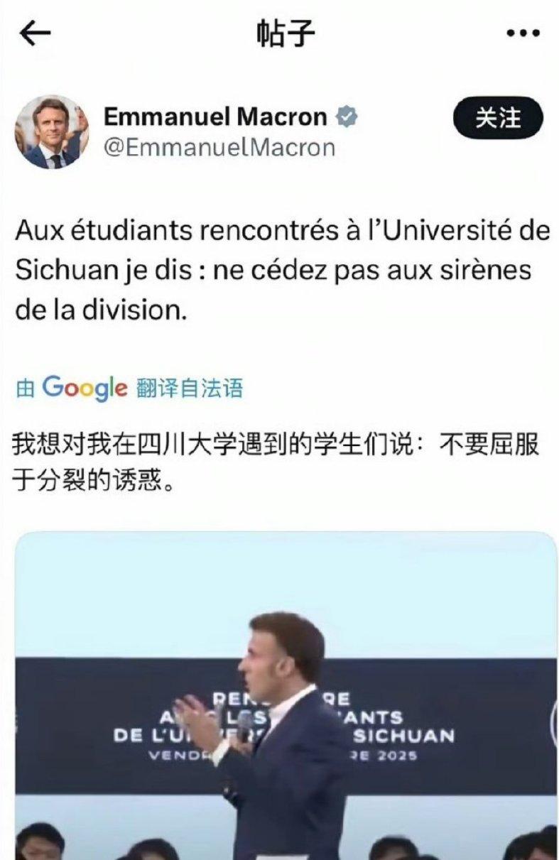 马克龙离开中国后发的第一条推文:不要屈服于分裂的诱惑。 潜台词:不要拿钱当汉奸