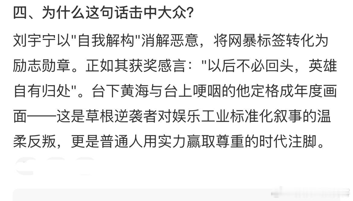 刘宇宁你也有今天总结得真好看哭了刘宇宁以"自我解构"消解恶意将网Bao标签转化为励志勋章。正如其获奖感言:"以后不必回头,英雄自有归处"。刘宇宁尖叫男演员