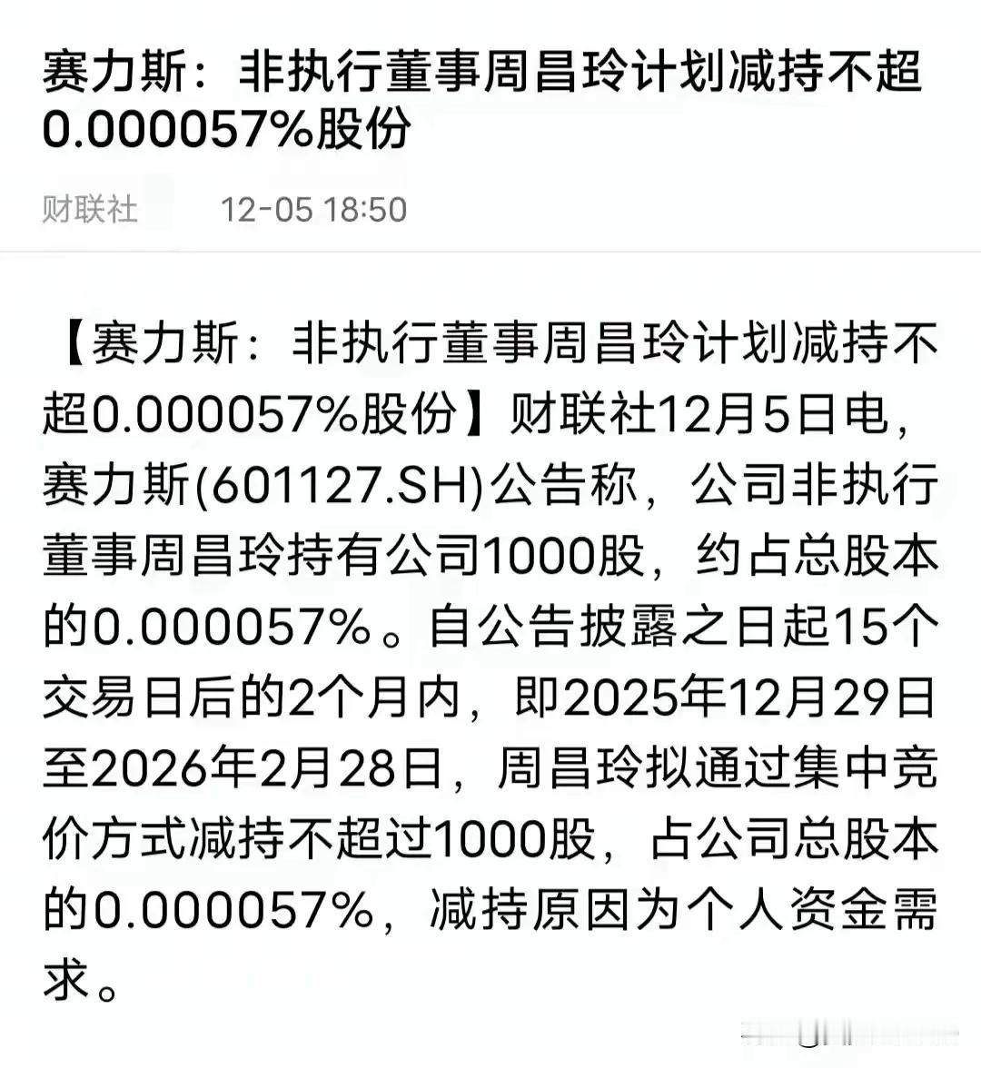 12月2日,赛力斯发布公告,称大股东重庆小康将其持有的赛力斯4150.00万股股份进行质押。 这次质押的比例并不算高,但是本次股票质押后,重庆小康累计质押赛力斯股份占其持股比例的22.12%。 [太阳][太阳][太阳][太阳] 赛力斯在2025年12月5日晚间发布的减持公告说,非执行董事周昌玲计划减持1000股。实事求是的说,即使只减持1000股,根据相关规定,上市公司也是要发布公告的。 周某出生于1968年10月,今年56岁,拥有计算机软件及应用工学学士学位,周某现任赛力斯集团股份有限公司审计委员会委员、非执行董事,重庆小康工业集团股份有限公司董事,东风汽车审计部总经理。