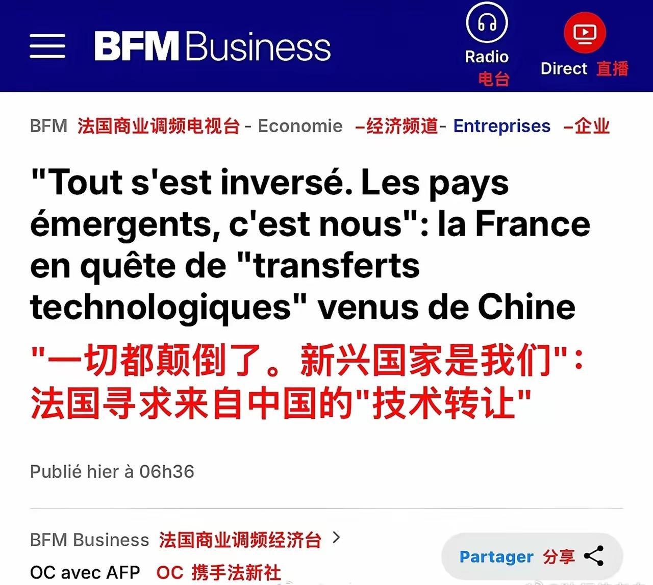 法国媒体:“一切都颠倒了,新兴国家是我们!” 马克龙这次的访华行程,其重要目标之一是说服北京增加在法投资,以期借鉴中国技术并助力本国工业实现赶超。 法媒表示,“经过 30 年的全球化进程,中国在经济增长和创新方面实现重大飞跃...如今中国拥有诸多尖端技术,可以与值得信赖的合作伙伴特别是欧洲伙伴共享。” 承认差距,认清现实,加强合作,法国人还是清醒的。马克龙