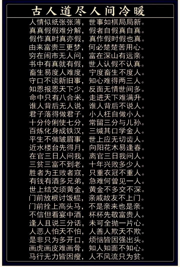 患难与共见真情 历经冷暖识人心 穷居闹市无人问 富在深山有远亲 不信你看宴中酒 杯杯先敬富贵人 有钱有酒多兄弟 急难何曾见一人 酒肉朋友千千万 几人雪中来送炭 人生到了中年后 世间冷暖都看透 没钱难走社会路 落魄谁和你相处 人情似纸张张薄 世事如棋局局新 人走茶凉寻常事 世态炎凉古犹今