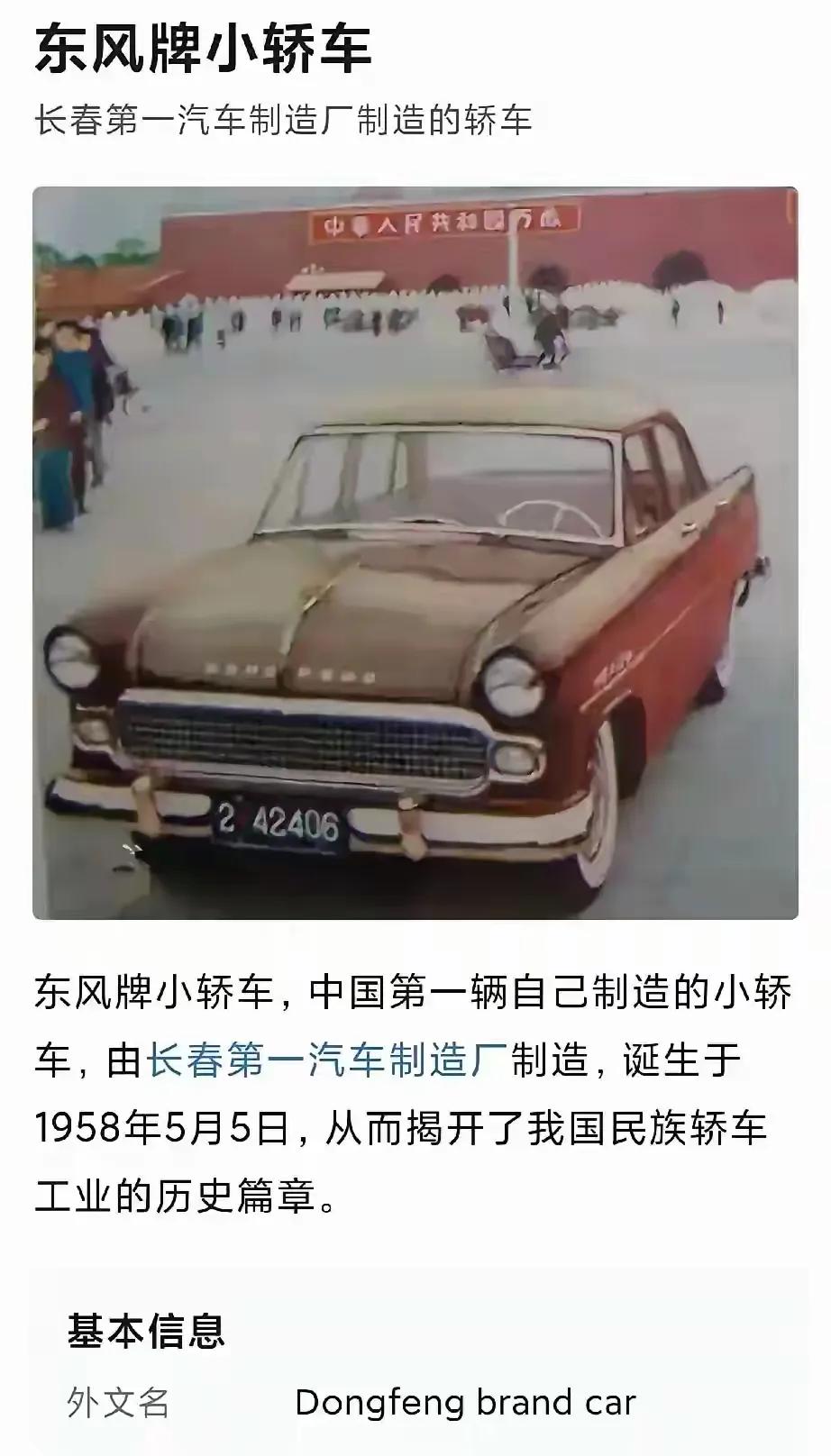 1958年最早的东风轿车,来自中国一汽。比红旗还早,新中国第一辆国产轿车。据说车头的金龙标和东风两个字都是镀金的! 该车型一共生产了30辆,最初还有DONGFENG标,后来改成了"东风"汉字。据说这个东风字体是苏东坡体? 车型代码CA71,C是中国的意思,A是汽车的首字母,7代表轿车,1代表第一辆首款车。