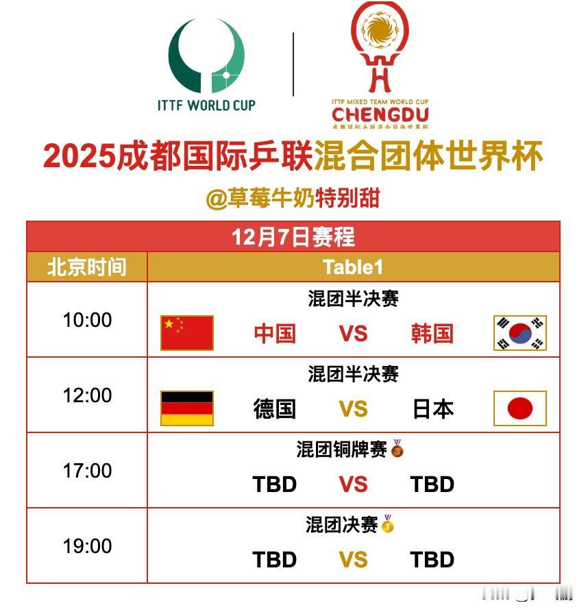 🏓乒乓球成都混合团体世界杯•这4支球队,凭啥晋级下一阶段比赛? [送自己一朵花]混合团体世界杯第二阶段循环赛已经全部结束,中、日、德、韩4支球队晋级第三阶段淘汰赛。(10:00中国VS韩国,12:00德国VS日本) [送自己一朵花]这4支球队凭啥晋级?凭的是男、女队员实力均衡,单打、双打实力均衡。 国乒队凭啥第一? 我们有—— 男单世一世二王楚钦林诗栋, 女单世一世二孙颖莎王曼昱, 混双世一世三栋曼和莎头, 女双世一世三王曼昱/蒯曼、孙颖莎/王曼昱, 男双世三王楚钦/林诗栋。 [送自己一朵花]混团比赛,如果男、女队员有一方实力弱,就失去了平衡,就等于一条腿走路,就像法国队。 法国队有巴奥会男团季军三人组——大、小勒布伦和西蒙高茨,但女队员不给力。否则法国队肯定进前四了。 ~~~~~~~~~~~~ [送自己一朵花]半决赛具体赛程安排见以下图片