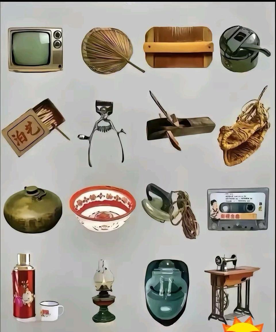 过去年代的老物件,你们认识几样?不妨说来听听。 网上看见这个图片,挺有意思的。老物件我基本都认识,毕竟是那个年代用过(或看过)的东西,它让我追忆起悠悠岁月生活的场景,虽然时过境迁,但记忆犹新,清晰如昨。 我来给大家说这16件老物件,不对的大家可以纠正哦。 1,黑白电视机,2,大薄扇, 3,篦子(梳子)4,缝纫机的愬芯,5,火柴,6,理发推子 7,木工刨子,8,草鞋,9,铜暖脚壶,10,瓷洗脸盆, 11,电烫斗,12,磁带,13,水瓶瓷杯子,14,煤油灯,15万能灯,16,缝纫机