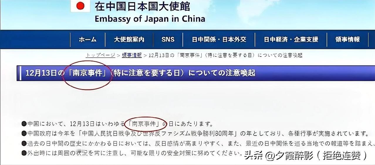 12月5日! 日本驻华大使馆发布安全警示, 还把“南京大屠杀”改名“南京事件”, 提醒在华日本公民注意人身安全。 这根本不是简单改名,远东国际军事法庭明确认定,日军6周内屠杀20万以上同胞,中国法庭核实遇难者超30万,铁证如山。 篡改名称藏着私心,日本右翼多年来一直模糊暴行,连教科书都在淡化史实,本质是不愿正视侵略罪责。 慈善团体埋尸记录、日军官兵日记等实证,早把这场浩劫钉在历史上,容不得半点歪曲。 历史从不会被掩盖,30万冤魂的苦难不能轻描淡写,正视罪行才是相处基础,歪曲历史只会引反感。