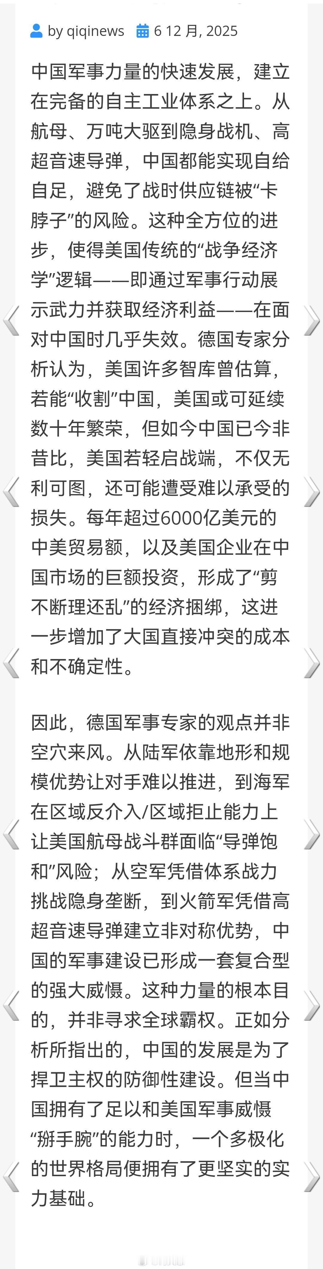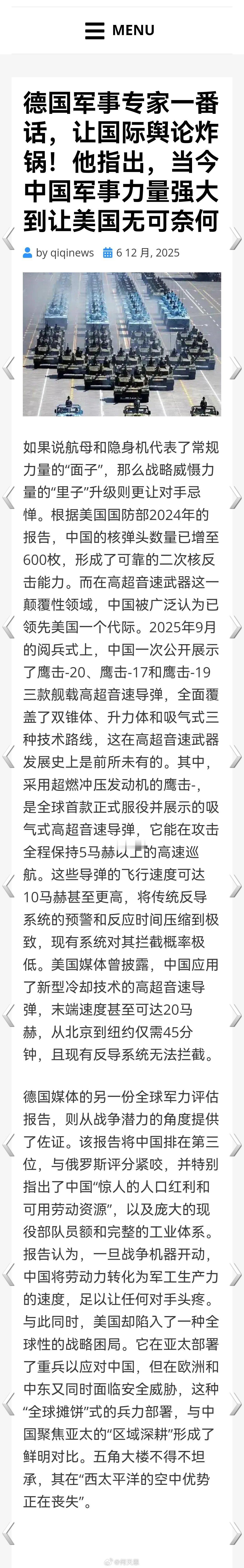 德国军事专家一番话,让国际舆论炸锅!他指出,当今中国军事力量强大到让美国无可奈何。美国不允许任何国家过于强大海外新鲜事何天恩