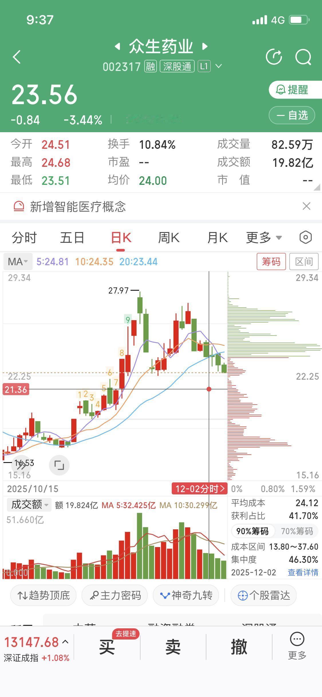 我盯上众生药业好久啦!12月7日下周要是它跌到21.36这个第一档支撑位,我肯定果断上车。之前就有关注它,像1月22日还跌了1.52%,当时股价靠近支撑位10.98。要是跌破支撑位可能就开启下跌行情,不过要是在支撑位反弹,那机会可就来了。 而且众生药业有不少亮点,它和药明康德共同研发的创新药ZSP1273,能预防和治疗甲型流感及人禽流感。还有开展了16个仿制药一致性评价品种,研发进度也符合预期。所以跌到目标价,我必须抓住机会搞一波!