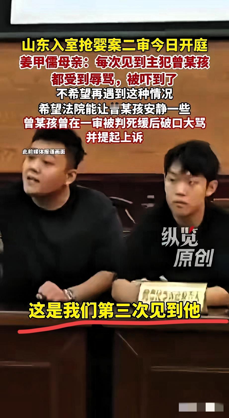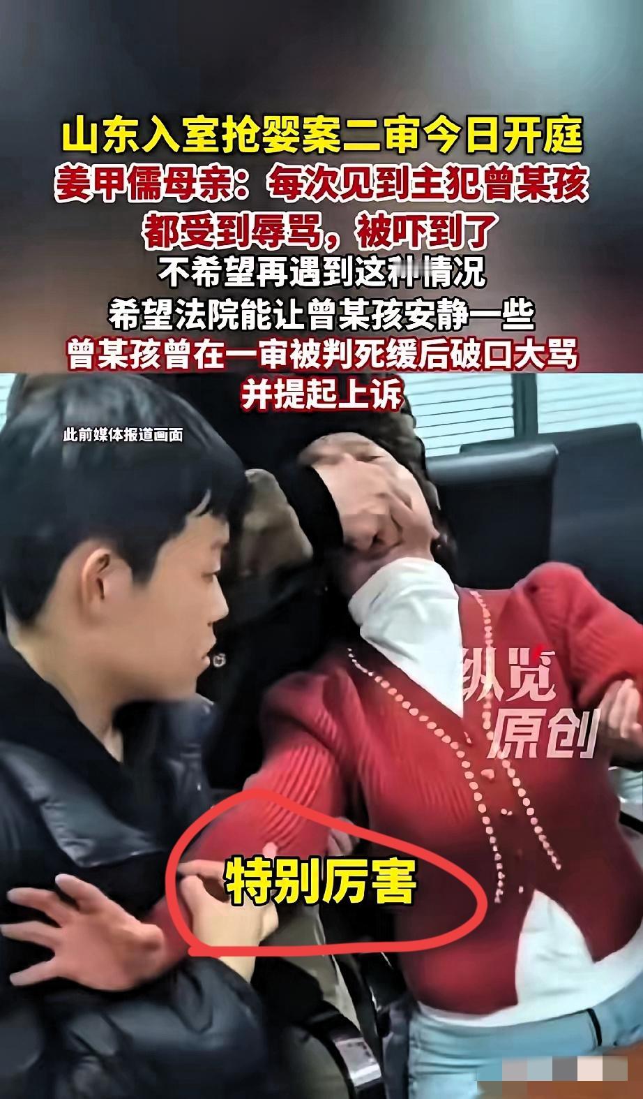 气得浑身发抖!山东入室抢婴案二审,主犯曾某孩当庭大骂受害者家属,把甲儒妈妈气晕,法警拉都拉不住,这哪里是认罪,分明是挑衅法律底线! 17年前,他伙同他人翻墙入室,抢走8个月大的姜甲儒卖了28600元,毁了一家人的人生。 爷爷自责病逝,奶奶哭瞎眼睛,父母寻子路上吃尽苦头,而他到现在都不认罪,还放狠话威胁要报复。 一审判了死缓他不服上诉,庭审上的嚣张模样,暴露了他毫无悔意的冷血。 法律给了他辩护的权利,不是让他肆意伤害受害者的挡箭牌。 真凶的嚣张,就是对受害者最深的二次伤害。 期待法律给出公正判决,让作恶者付出应有的代价,还受害者一个公道。 你觉得该如何遏制这种庭审上的嚣张气焰?来评论区说说~